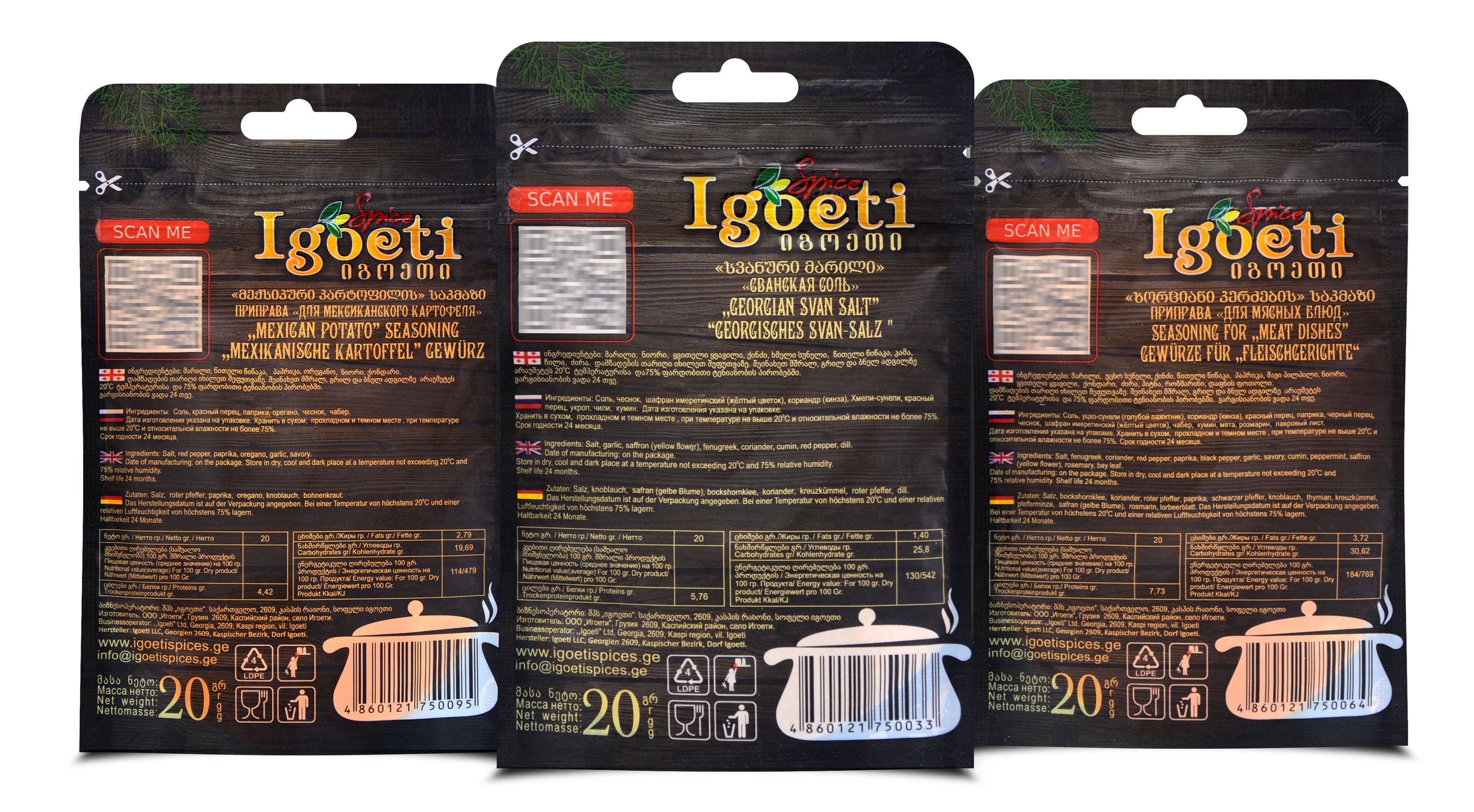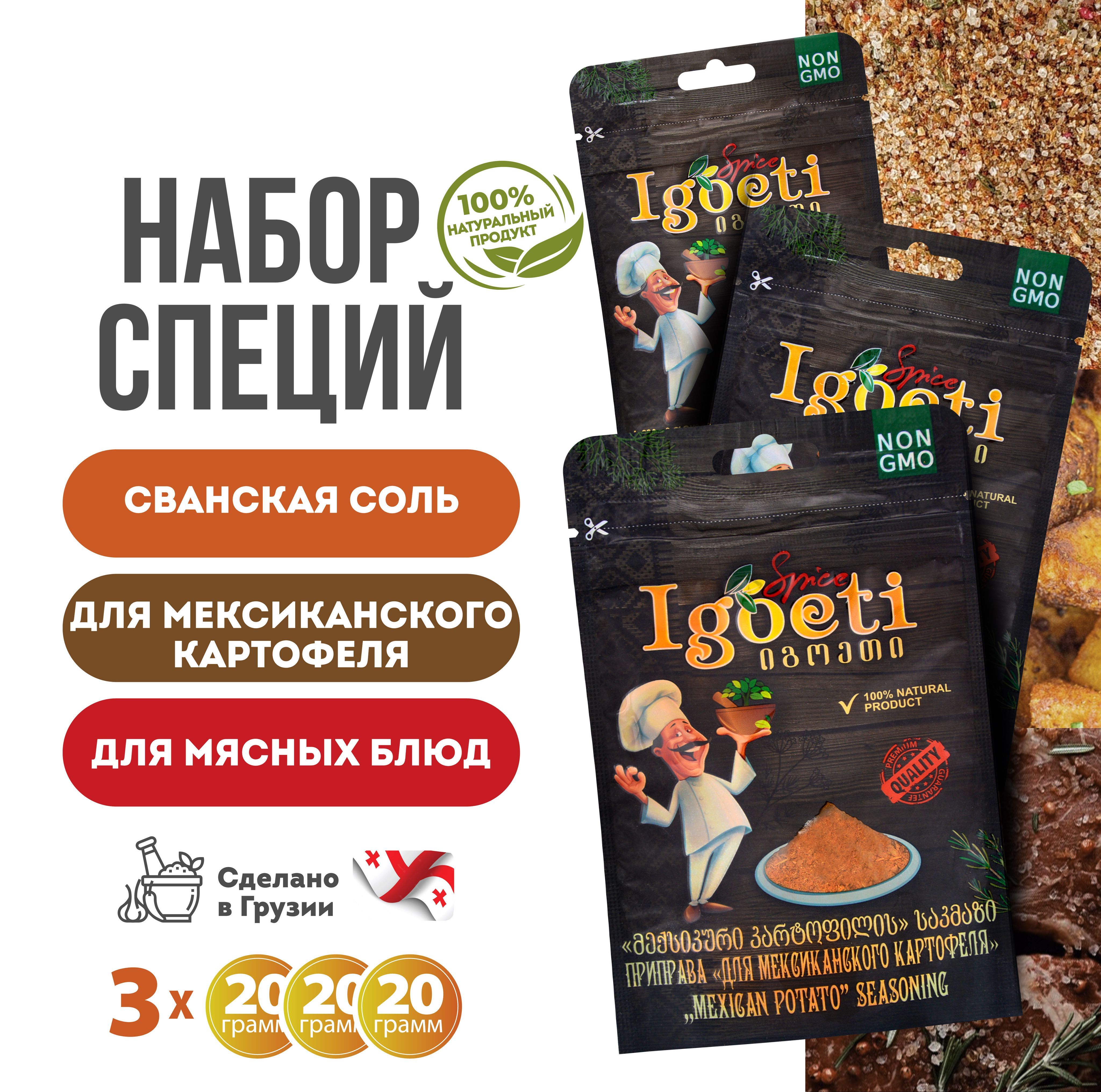 Специи и приправы Spice Igoeti (Грузия). Набор № 5: сванская соль, приправа для мексиканского картофеля, для мясных блюд