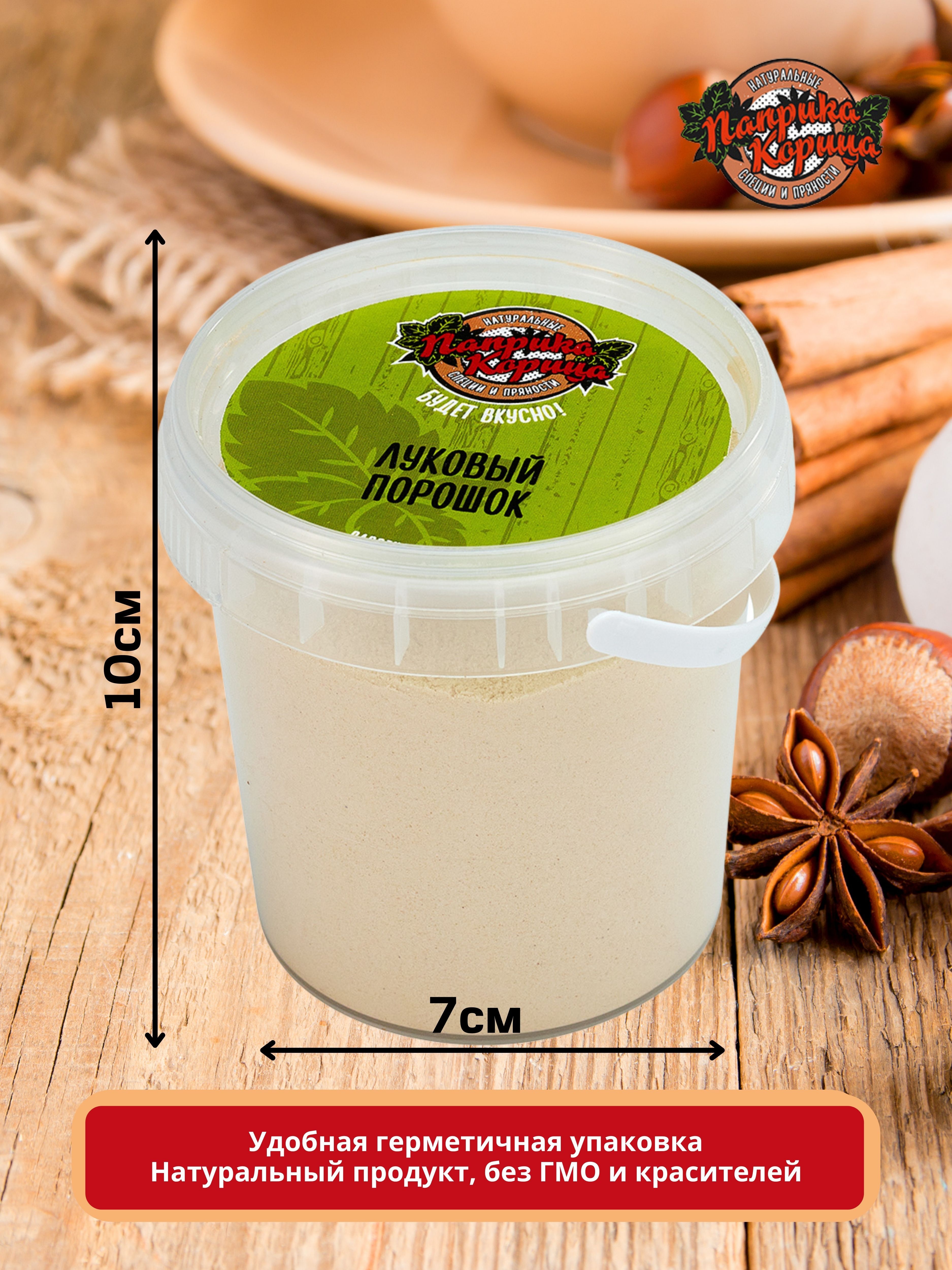 Пластиковое ведерко, высотой 10 см и диаметром 7 см, наполнено до краев и герметично закрывается крышкой. Луковый порошок будет оставаться свежим и сохранит нежный аромат надолго.