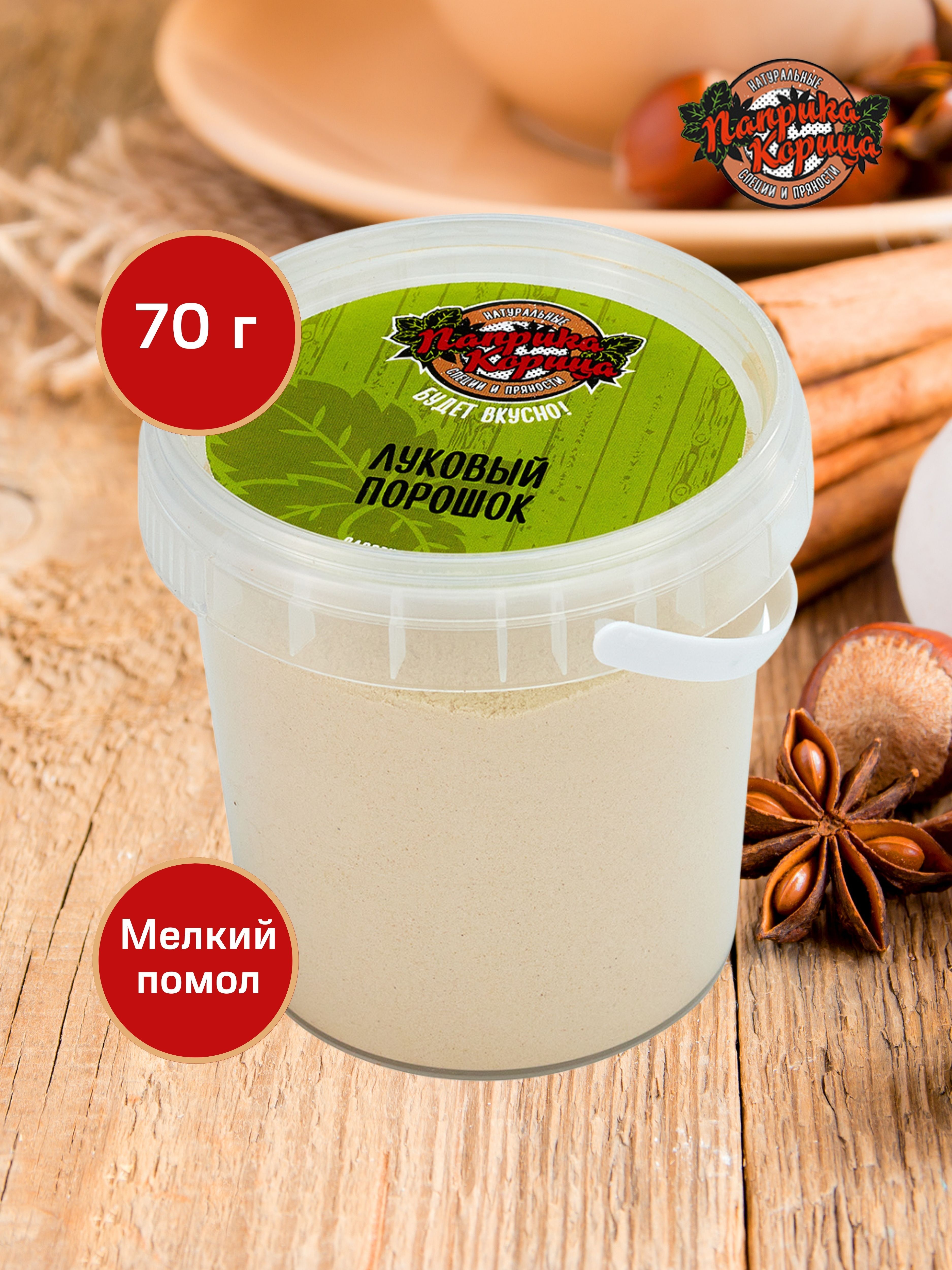 Описание: Луковый порошок (70 гр.) – пряность, которая используется как вкусовая добавка в первые блюда, соусы, подливки и фарши. Он незаменим для тех, кто "плачет" от сока свежего лука и не любит кусочки вареного лука в супе. Использование порошка экономит время на приготовление еды. 1 столовая ложка приправы заменяет 1-2 луковицы.  Добавьте специю в котлеты, при жарке рыбы и мяса. Можно создать ароматную заправку для салатов из сочетания морской соли с луковым порошком. С порошком удачно получатся ржаные сухарики.