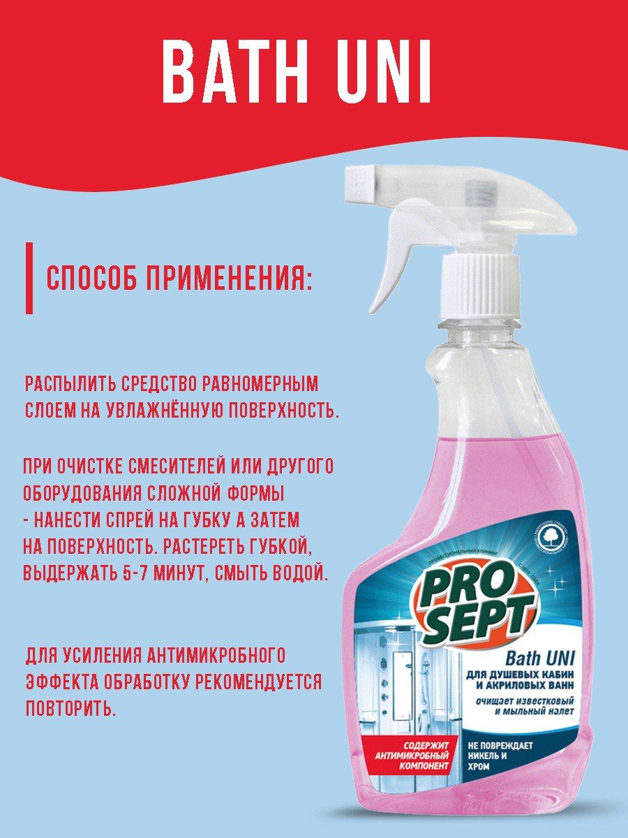 Описание: Спрей для душевых кабин и ванн Bath Uni - это мягкое чистящее средство на основе лимонной кислоты. Эффективно удаляет известковый налет, ржавчину, въевшуюся грязь, уничтожает бактерии и микробы, устраняет неприятные запахи, придает блеск поверхностям, а также поддерживает чистоту между уборками, замедляя оседание грязи на поверхности. Чистящее средство предназначено для чистки и ухода за ваннами, раковинами, кафельной плиткой. Содержит ЧАС для выраженного антимикробного эффекта. Подходит для ежедневного применения.