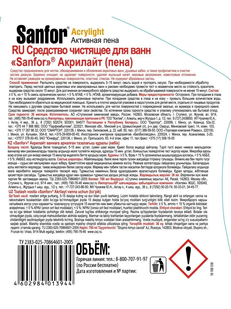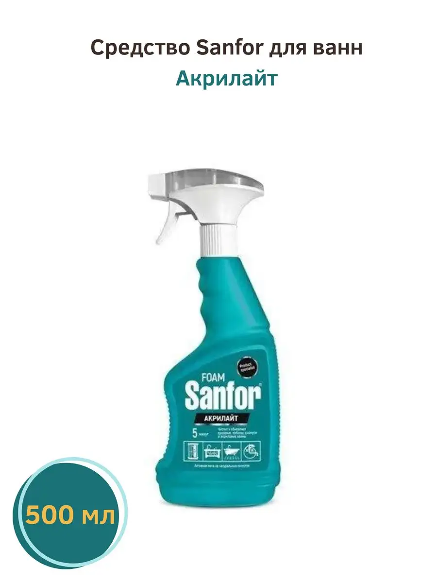 Описание: Чистящее средство спрей-пена для ванны Sanfor - универсальное решение для эффективной уборки вашего дома и поддержания безупречной чистоты ванной комнаты и сантехники. Это мощное средство, специально разработанное для удаления мыльного и известкового налета, стойких и застарелых загрязнений, жировых отложений на различных поверхностях ванны, кафельной плитке и сантехники. Моющее средство Sanfor идеально подходит для очистки акриловых ванн, душевых кабин, раковин, систем джакузи и других поверхностей. Благодаря своей концентрированной формуле, даже небольшое количество этого моющего средства обеспечит бережное и эффективное удаление загрязнений и ржавчины, придаст блеск вашей ванной комнате. Очиститель обладает антибактериальным и антимикробным эффектом, обеспечивая надежное обеззараживание, не содержит хлора и абразивных частиц. Специальная формула с лимонной и молочной кислотой эффективно удаляет мыльные отложения и оставляет свежий и приятный запах после мытья. Для применения этого чистящего средства достаточно распылить пену на поверхность ванной, раковины и душевой кабины, выдержать 5-15 минут, смыть водой и протереть насухо. Концентрат безопасен для использования на хромированных кранах и других хромированных элементах сантехники. Не царапает поверхность и не оставляет разводов. Неотъемлемая часть вашей бытовой химии, активная пена Санфор Акрилайт поможет вам поддерживать чистоту и идеальную гигиену в ванной комнате. Приведите свою ванную в идеально чистое состояние с чистящим средством для ванны Sanfor Акрилайт. Уважаемые покупатели! Обращаем Ваше внимание на изменение в дизайне упаковки. Товар будет приходить с разным цветом триггеров и разной этикеткой в зависимости от наличия на складе.