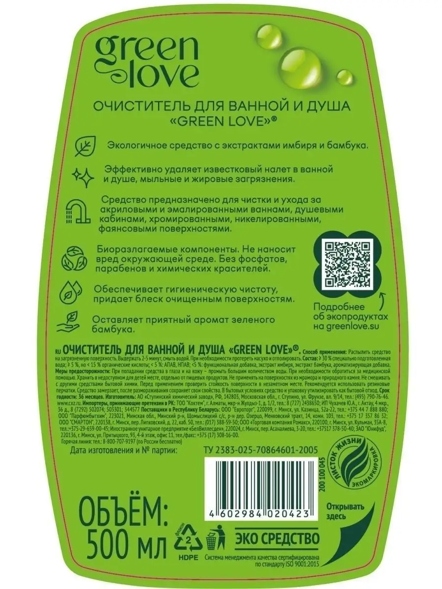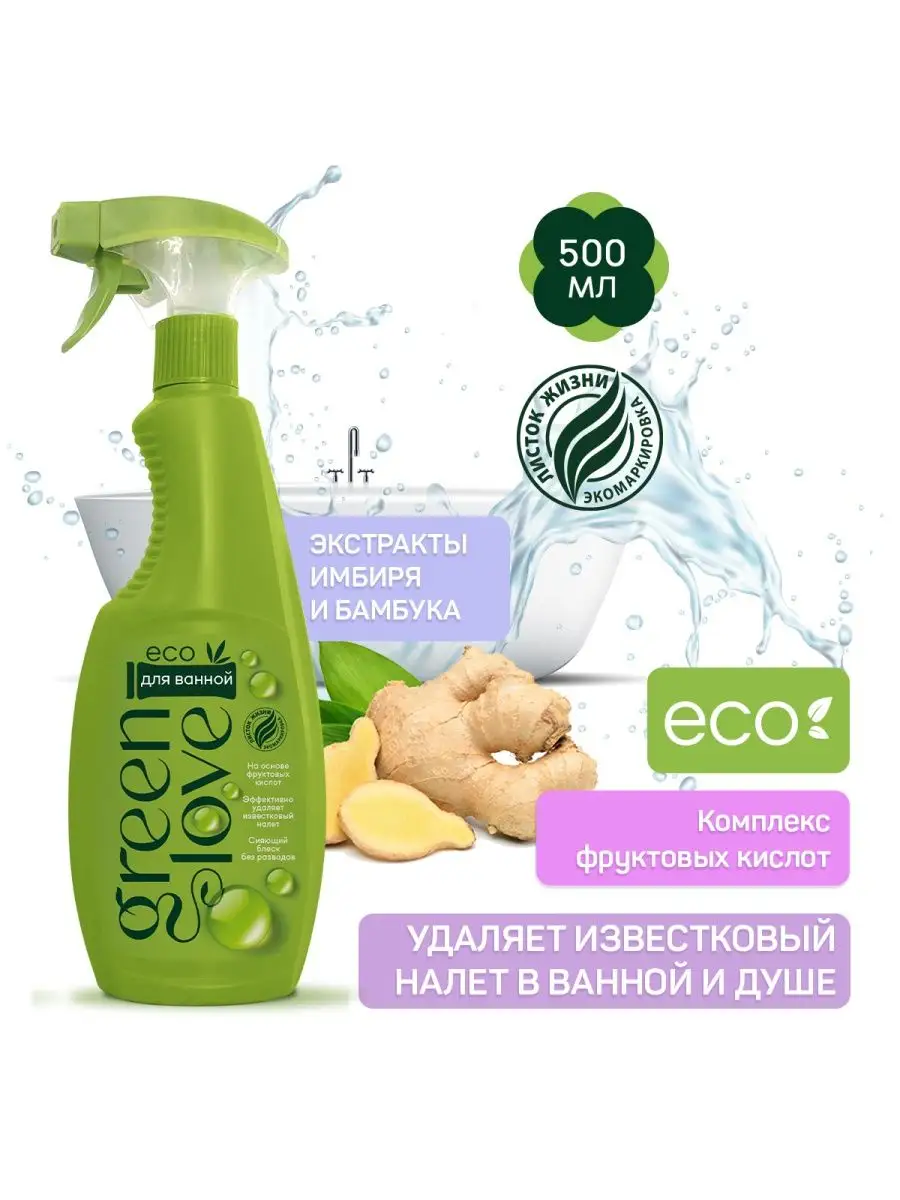 Описание: Чистящее эко средство спрей для ванны и раковин Green Love - универсальный помощник в борьбе с различными загрязнениями на поверхностях сантехники и ванны. Это мощное экологичное средство, специально разработанное для удаления мыльного и известкового налета, стойких и застарелых загрязнений, жировых отложений на различных поверхностях ванны, кафельной плитке и сантехники. Благодаря своей экологичной формуле, это чистящее средство безопасно для окружающей среды и не содержит хлора, фосфатов, парабенов, SLS и химических красителей. Моющее средство идеально подходит для очистки акриловых ванн, душевых кабин, раковин, систем джакузи и других эмалированных поверхностей. Концентрат безопасен для использования на хромированных и фаянсовых поверхностях, не рекомендуется использовать на мраморе и природном камне. Моющее средство состоит из биоразлагаемых компонентов, не содержит микропластика, что снижает нагрузку на окружающую среду и не вредит септическим установкам. Благодаря своей концентрированной формуле, даже небольшое количество этого моющего средства обеспечит бережное и эффективное удаление загрязнений, придаст блеск вашей ванной комнате. Экологичное средство с экстрактом имбиря и бамбука эффективно удаляет мыльные отложения и оставляет свежий и приятный аромат после мытья не оставляя разводов. Для применения этого чистящего средства достаточно распылить пену на поверхность ванной, раковины или душевой кабины, выдержать 2-5 минут, смыть водой и протереть насухо. Бытовая химия спрей для ванны и душа Green Love – надежное решение для эффективной уборки вашего дома и поддержания безупречной чистоты ванной комнаты и сантехники. Уважаемые покупатели! Обращаем Ваше внимание на изменение в дизайне упаковки. Товар будет приходить с разным цветом триггеров и разной этикеткой в зависимости от наличия на складе.