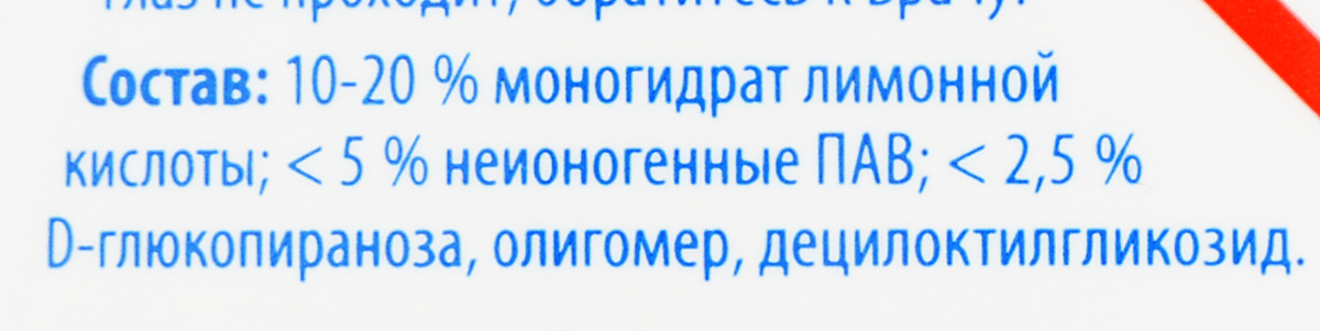 Состав: 10-20% моногидрат лимонной кислоты; <5% неионогенные ПАВ; <2,5% D-глюкопираноза, олигомер, децилоктилгликозид.