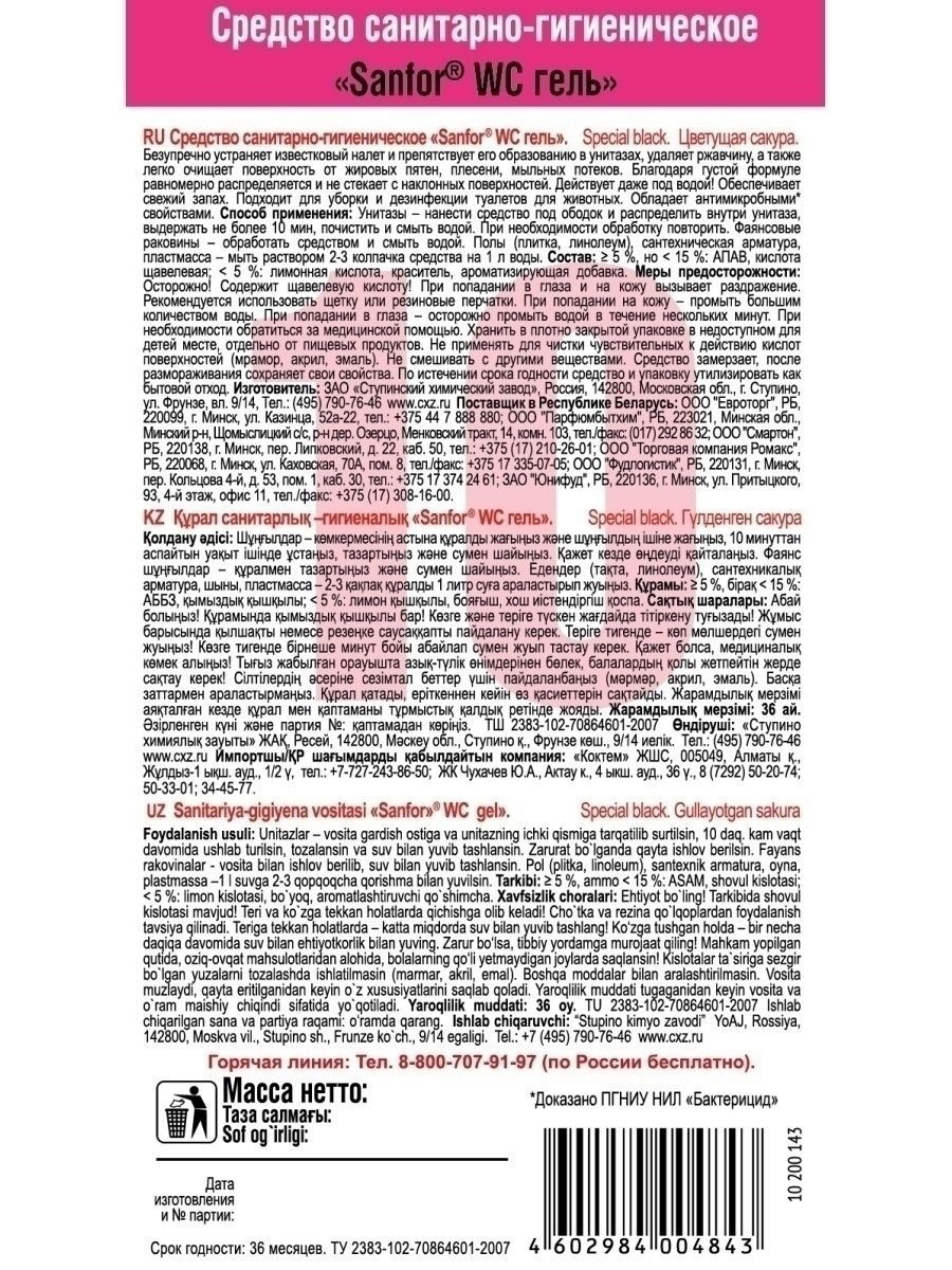 Благодаря загущенной формуле, гель расходуется экономично, равномерно распределяется и не стекает с наклонных поверхностей.Результат через 10 минут!Способ применения:ЧИСТО ТАМ, ГДЕ SANFOR!
