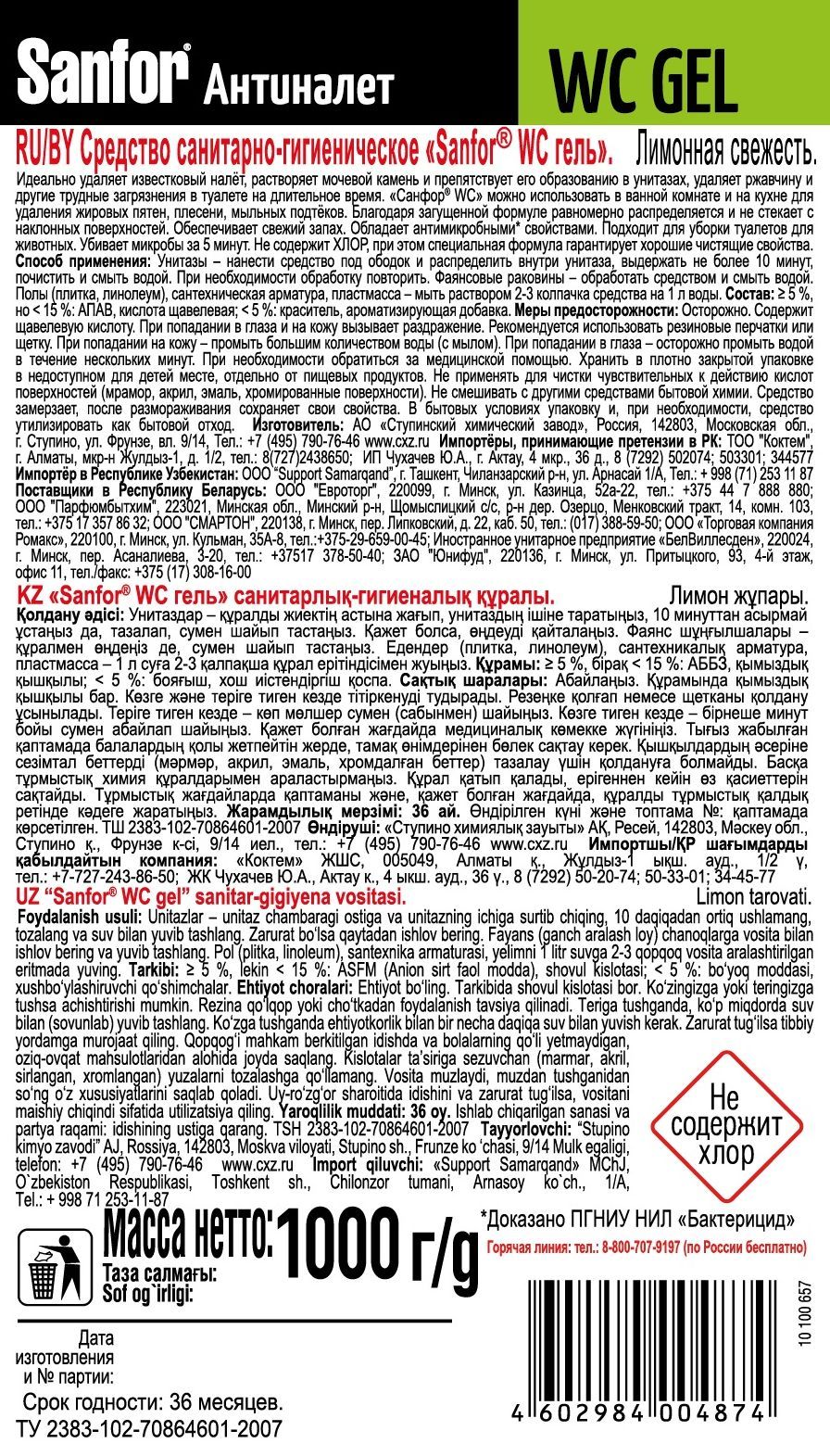 Этот гель является безопасным бытовым химическим средством (не содержит хлор), которое не только чистит, но и дезинфицирует поверхность. Его уникальная формула, основанная на щавелевой и лимонной кислоте, делает его идеальным для устранения загрязнений, грязи и налета, обеспечивая максимальную чистоту и гигиену.