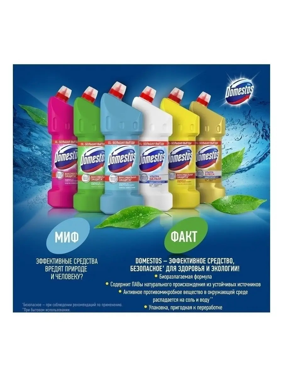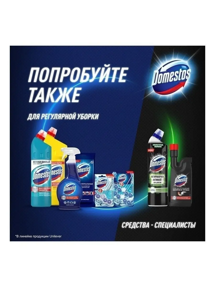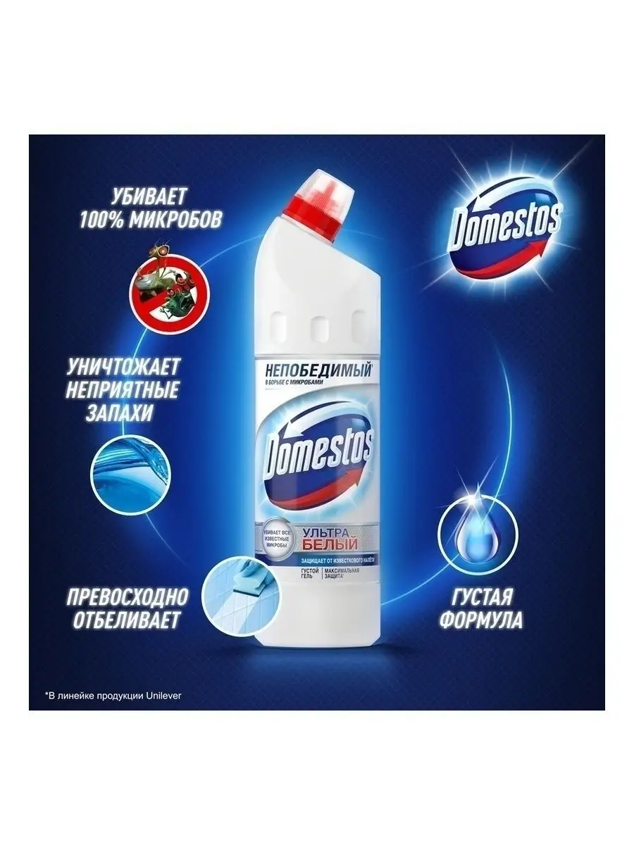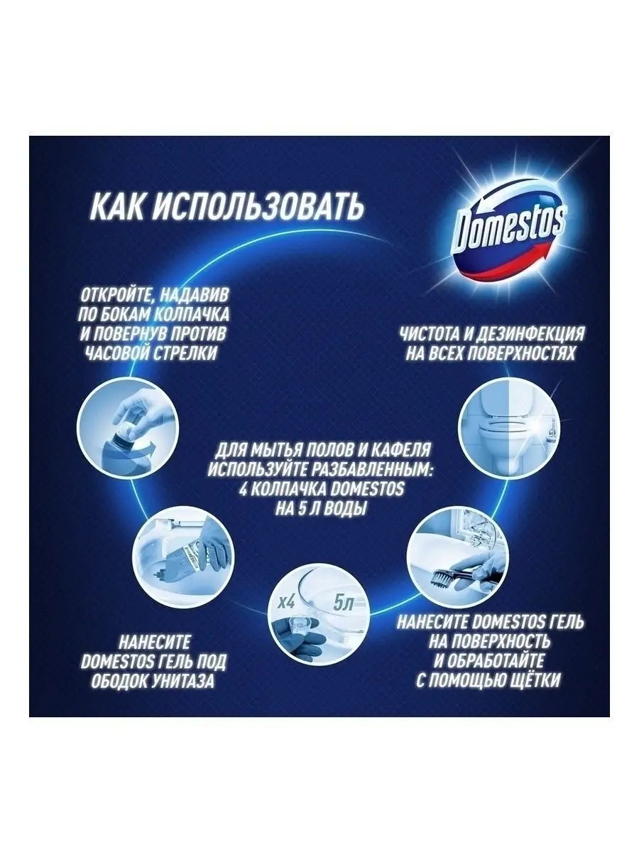 Описание: Существует множество помощников в быту, которые ликвидируют грязь и опасных бактерий, прочищают канализационные трубы, помогают в мытье полов и посуды, а также улучшают внешний вид вашей сантехники. Чистящее средство для сантехники от торговой марки Domestos эффективно удаляет грязь и убивает все известные микробы. Благодаря уникальной густой формуле Domestos одна бутылка расходуется в 10 раз дольше, чем недорогое жидкое хлорсодержащее чистящее средство. Концентрированный состав Domestos не только очищает поверхности, но и помогает бороться со всеми известными микробами, в том числе вызывающими опасные заболевания. Даже небольшим количеством средства можно удалить самые сложные въевшиеся пятна и загрязнения. Средство чистящее для унитаза Доместос Ultra White - это мощное и эффективное средство, специально разработанное для тщательной и глубокой очистки унитаза. Оно обеспечивает высокую степень гигиены, устраняет накипь, известковые отложения, желтые пятна и другие загрязнения, которые могут накапливаться в унитазе со временем.Средство обладает белоснежной текстурой, которая помогает придать унитазу свежий и чистый вид. Оно имеет сильное антибактериальное действие, которое уничтожает бактерии и гермы, предотвращая их размножение и распространение в унитазе.Доместос Ultra White имеет приятный аромат, который оставляет после себя свежий и чистый запах в туалете. Оно легко наносится на поверхность унитаза, благодаря своей гелеобразной консистенции, и быстро и эффективно удаляет все загрязнения, оставляя унитаз идеально чистым и гигиеничным.Кроме того, средство не только очищает унитаз, но и предотвращает образование новых отложений и накипи, продлевая срок его службы. Оно безопасно в использовании и не повреждает поверхность унитаза, не оставляя царапин или пятен.Средство чистящее для унитаза Доместос Ultra White - надежный помощник в поддержании чистоты и гигиены в туалете, оставляя унитаз свежим, чистым и безопасным для использования. Domestos универсален. Состав: отдушка, анионное поверхностно активное вещество, мыло, неионогенные пав, гипохлорит натрия средство для унитаза. обеззараживающее. антибактериальное. средство от микробов. средство для предотвращения я размножения микробов. гель для уборки. дезинфицирующие. жидкость для уборки. очиститель для унитаза. средство для очистки. средство для унитаза. таблетки для унитаза. доместос. ломестос