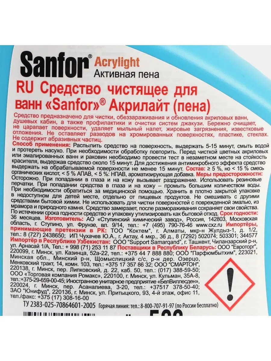 Средство чистящее для ванн Sanfor "Акрилайт", пена, 500 мл