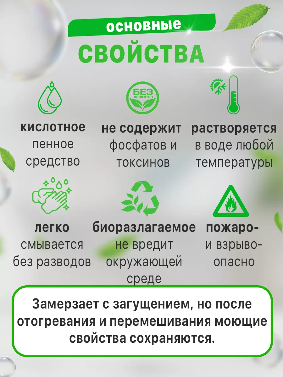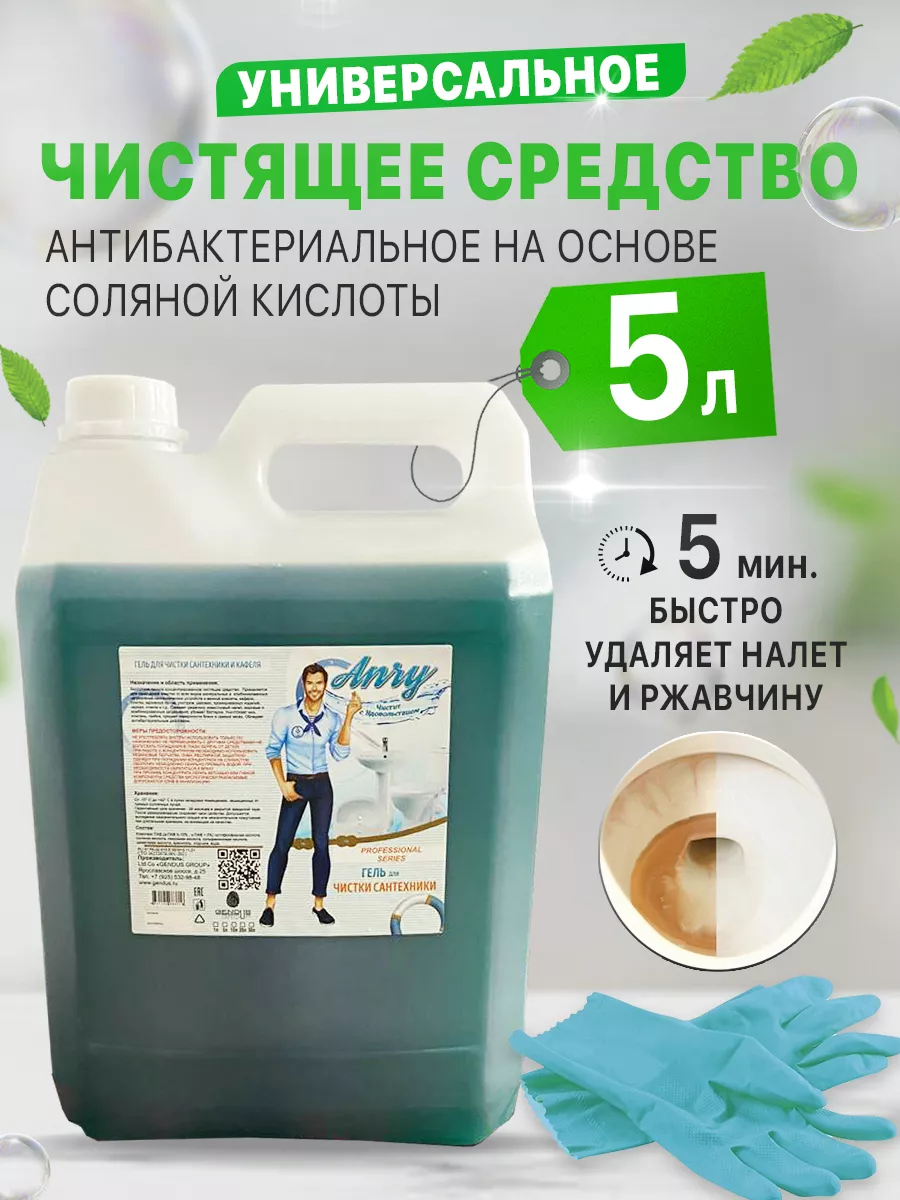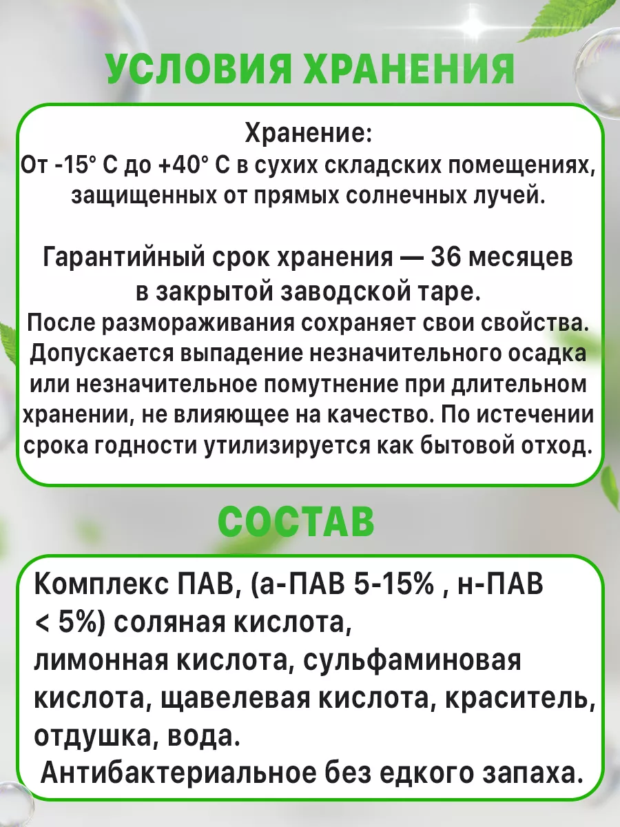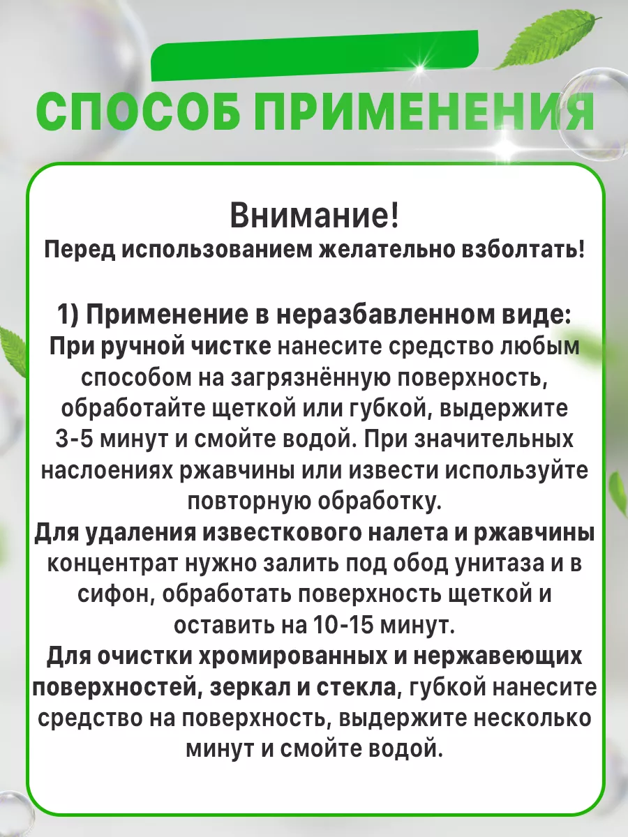 Описание: Кислотное пенное концентрированное чистящее средство. Применяется для санитарной очистки от всех видов минеральных и комбинированных загрязнений сантехнических устройств и ванной комнаты, кафеля, плитки, наливных полов, унитазов, раковин, хромированных изделий, зеркал, стекла. Снимает ржавчину, известковый налет, жировые и комбинированные загрязнения, убивает бактерии. Уничтожает мох, плесень, грибок, придает поверхности блеск и свежий запах. Обладает антибактериальным действием. Предназначено для применения в медицинских, детских учреждениях, гостиницах, домах отдыха, досуговых и спортивных центрах, в коммунальном хозяйстве, на предприятиях пищевой промышленности (молочной, мясной, рыбоперерабатывающей и т.д.) и общественного питания, а также в быту. Жидкое кислотное средство с приятным запахом. Не содержит фосфатов и токсичных веществ. Эффективно против известковых и минеральных отложений, ржавчины, мочевого камня, масло-жировых и комбинированных загрязнений на нержавеющей стали, кафеле и керамической плитке, фаянсе, пластмассах, резине, стекле. Пожаро- и взрывобезопасно. Использовать только по назначению! Не перемешивать с другими средствами! Не допускать попадания в глаза! Беречь от детей! При работе с концентратом необходимо использовать резиновые перчатки, очки, респиратор, защитную одежду! Компоненты средства биологически разлагаемые, допускается слив в канализацию. Кислотное пенное универсальное моющее средство с гипохлоритом натрия. Предназначено для мытья и дезинфекции кухни, оборудования, посуды, разделочных досок, столешниц, пола, стен, клеток животных, производственных площадей, хозяйственного инвентаря. Для удаления органических, жировых, белковых загрязнений, крови, зелени. Для прочистки туалета, ванной комнаты, засоров и запаха в канализации. Чистит, обезжиривает, дезинфицирует, отбеливает поверхность. средство для чистки сантехники, от ржавчины средство для туалета для унитаза для ванной комнаты для чистки антибактериальное без едкого запаха.