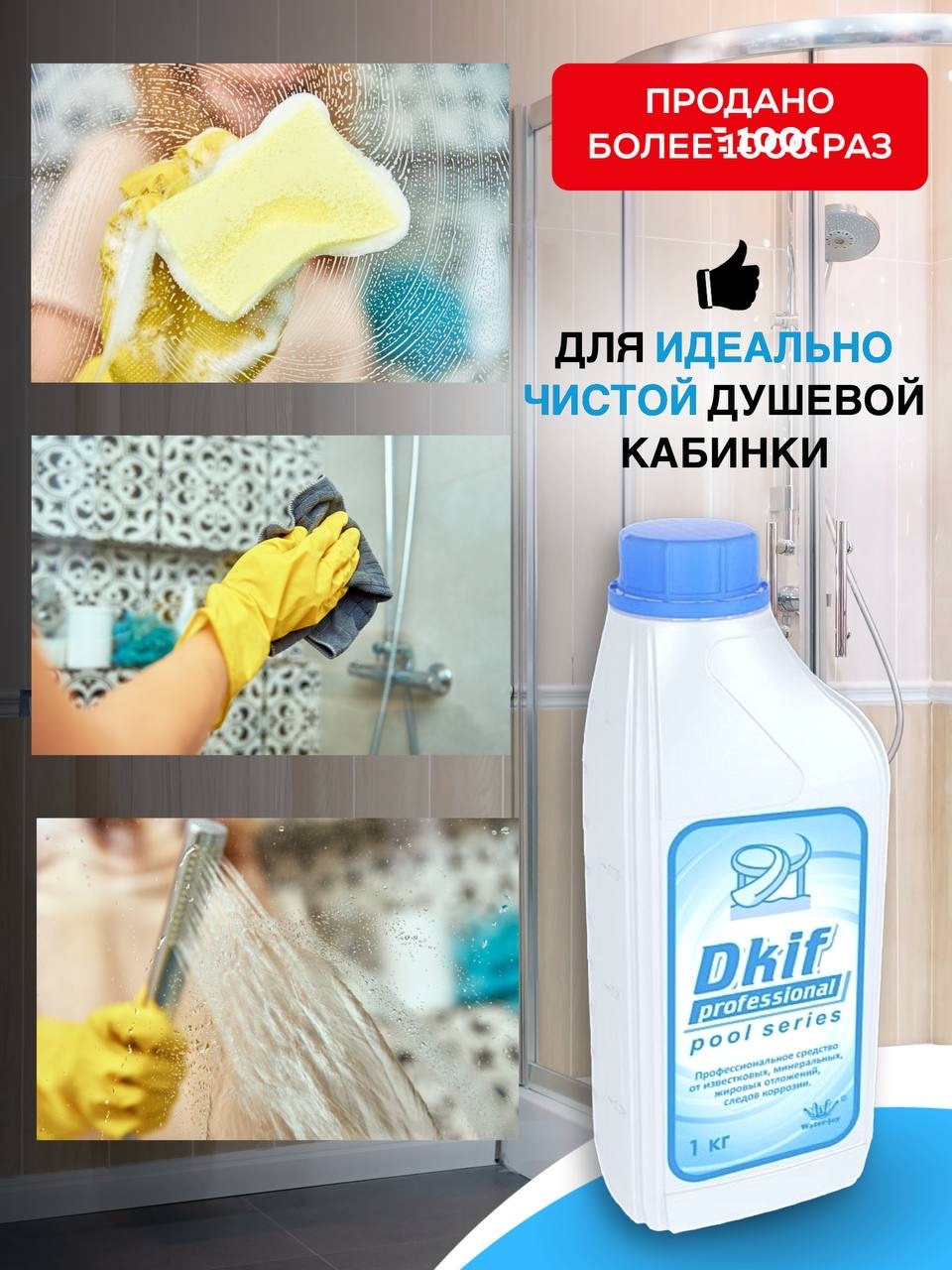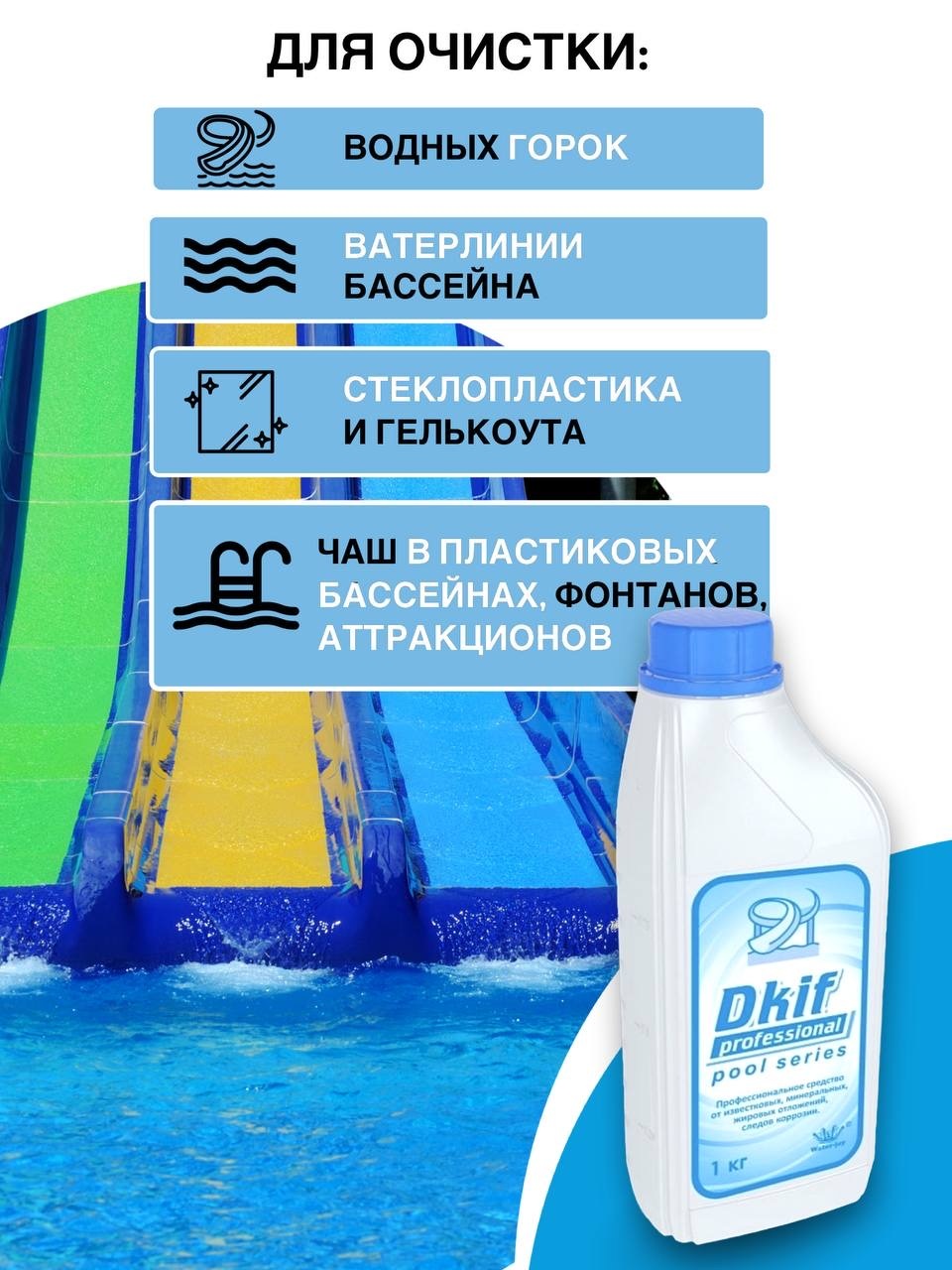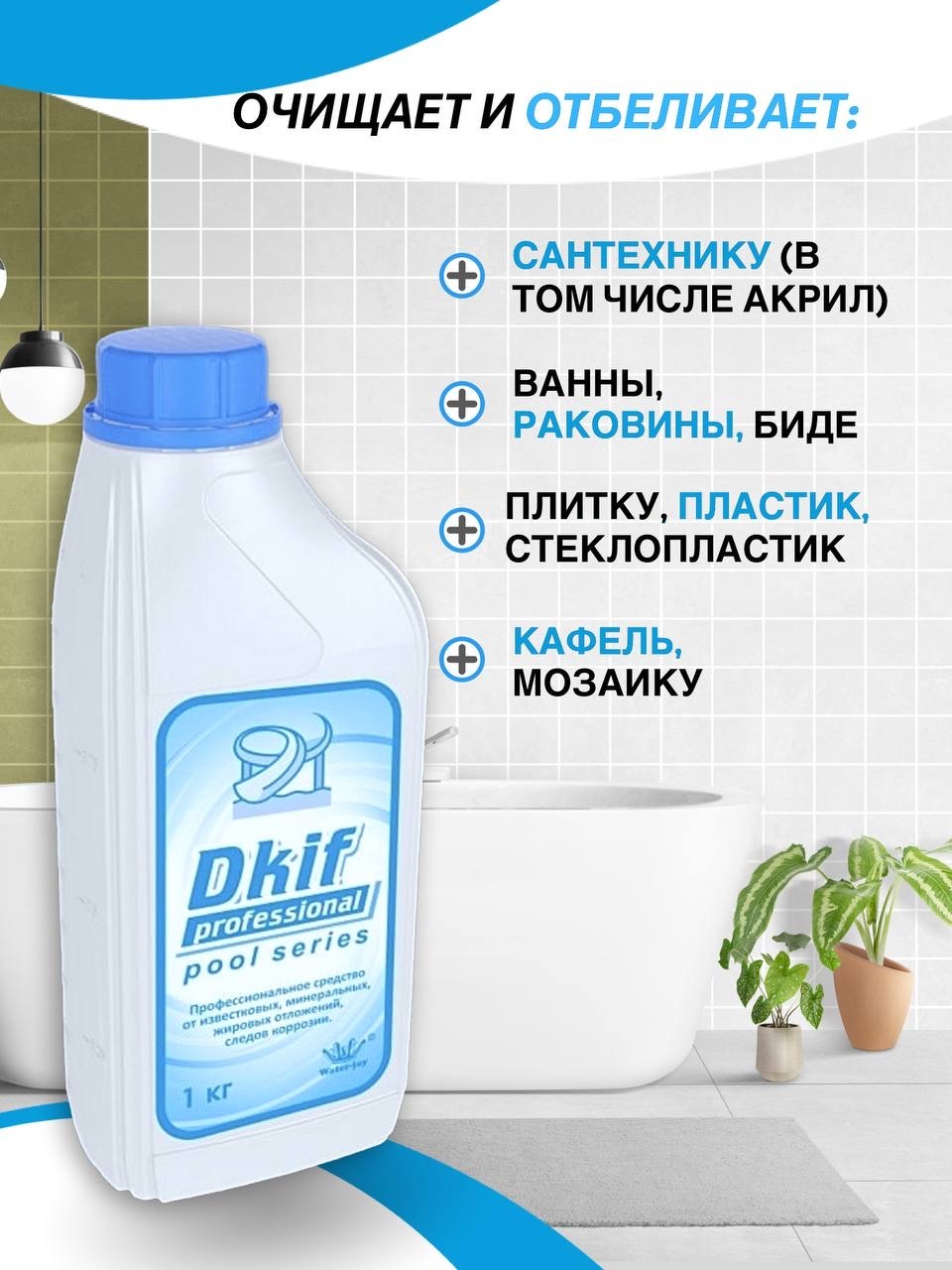 Чистящее средство для туалетов и ванных комнат Dkif-professional. Специальное чистящее средство от известкового налета для чистки ванн, душевых кабин, унитазов, сантехники, фаянсовых изделий и кафеля от известкового налета, водного камня, потеков ржавчины, мыльных разводов и солевых отложений. Дезинфицирует, удаляет все известные микробы. Обладает эффектом антиналет и водоотталкивающими свойствами, предотвращает образование нового матового налета. Отбеливает.