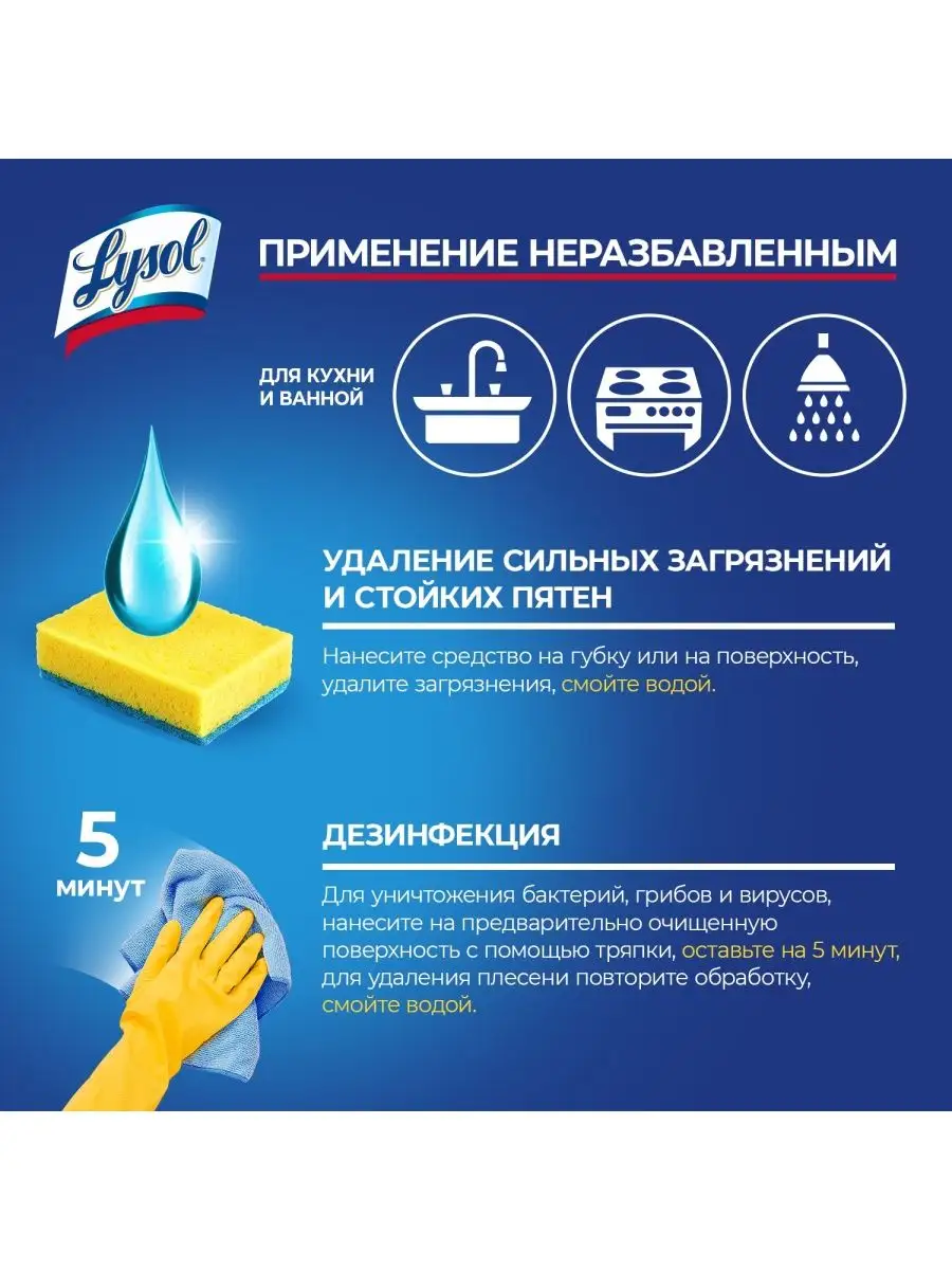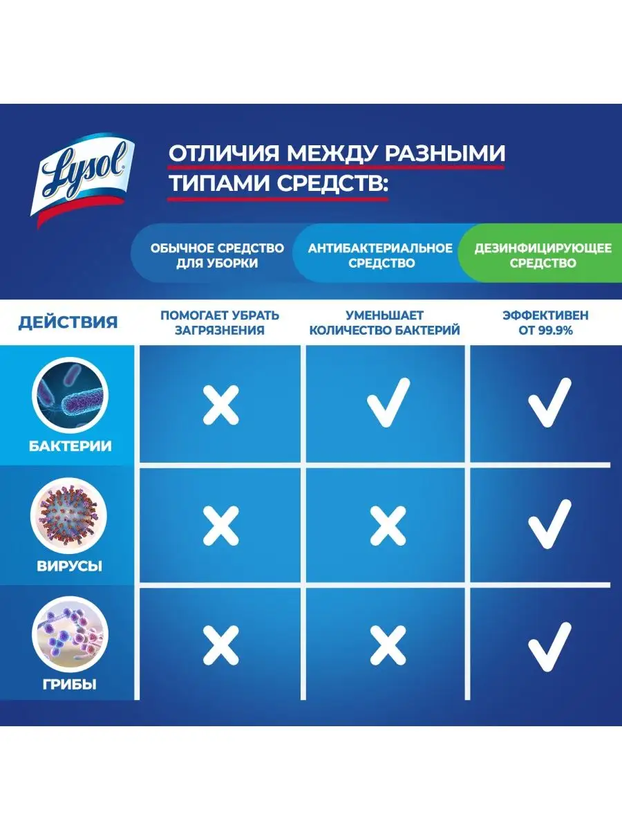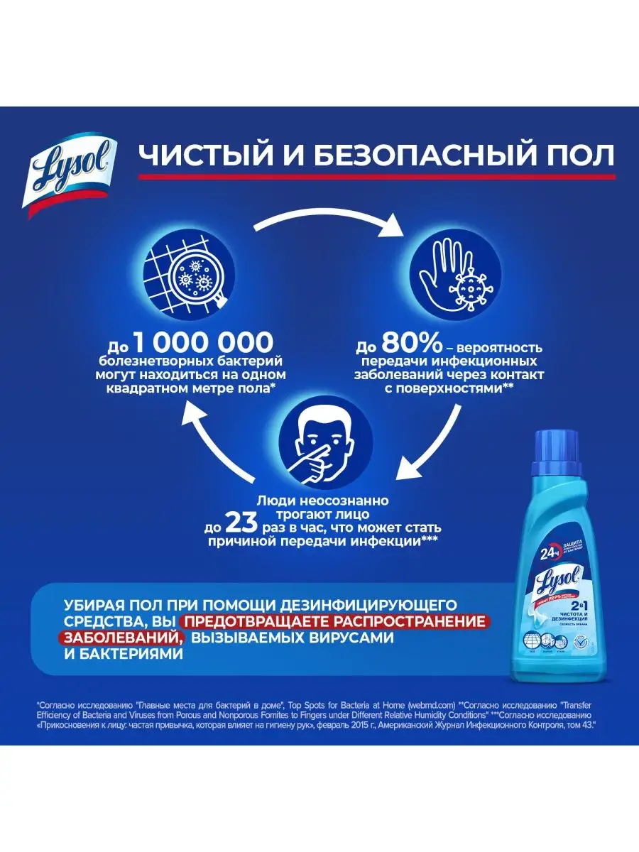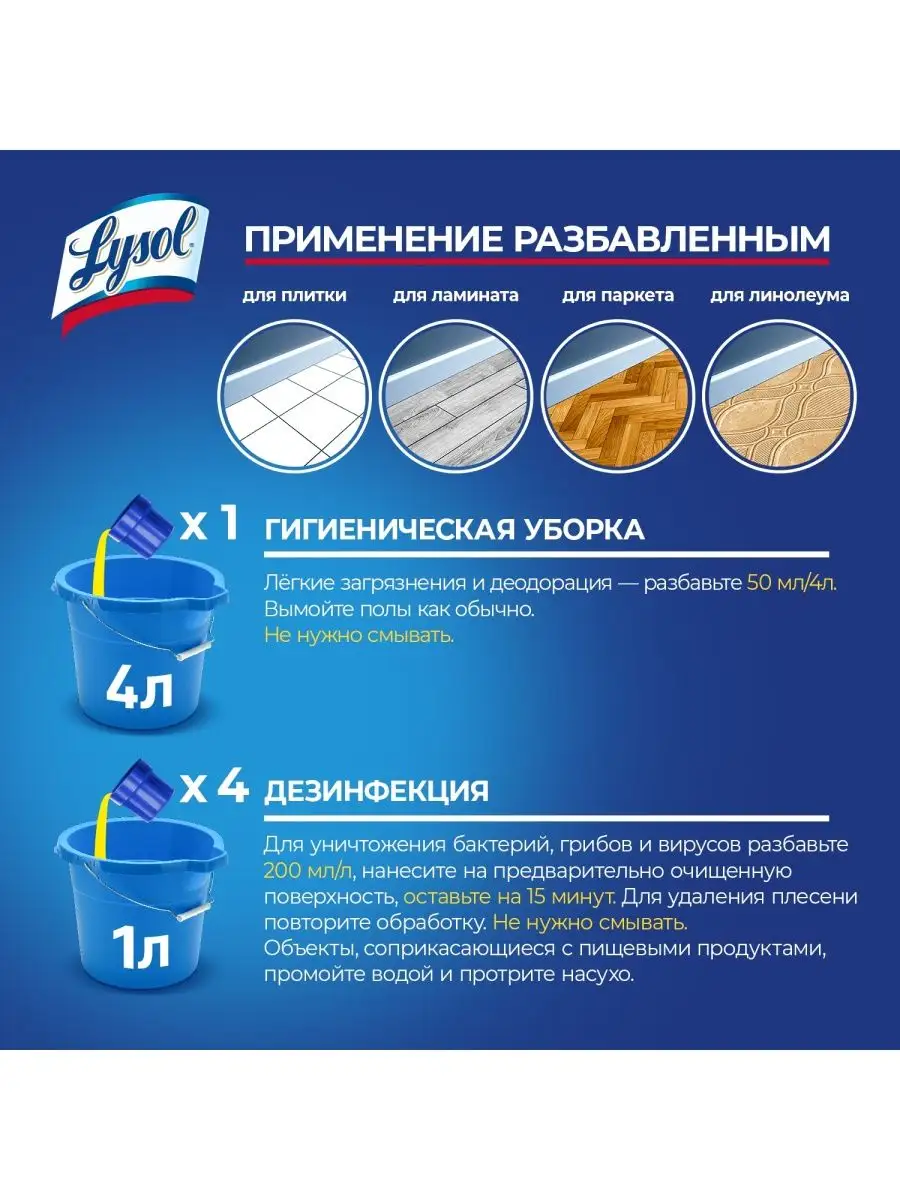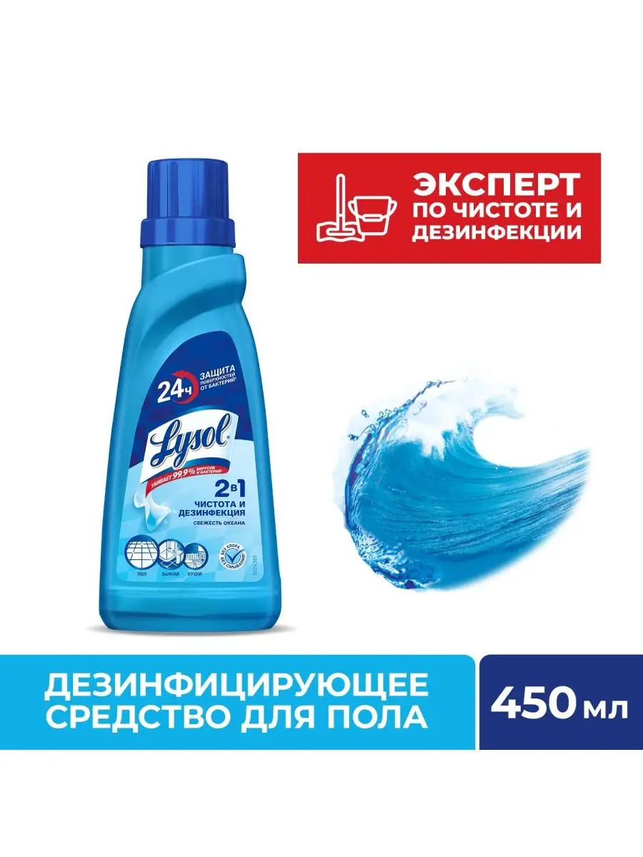 Описание: Дезинфицирующее средство для пола «Lysol универсальный» Свежесть океана, 450 мл. Для здоровья и безопасности вас и ваших близких важно следить за чистотой в доме и проводить регулярную уборку. В этом вам поможет cредство дезинфицирующее для пола Лайсол/Lysol (прост и безопасен в использовании, не содержит хлор, красители и фосфаты. После использования поверхность быстро высыхает, на ней не остаются следы и разводы, не нужно смывать). Преимущества Лайсол/Lysol: 1. Устраняет 99.9% вирусов и бактерий; 2. 24 часа защита поверхностей от бактерий; 3. Не содержит хлор, красители и фосфаты; 4. Не требует смывания. Дезинфицирующее средство Lysol подходит для ламината, плитки, линолеума и паркета, а также поверхностей на кухне и ванной комнате.__/Правила использования: Не использовать на горячих, повреждённых, на необработанных и пористых поверхностях или материалах, чувствительных к компонентам состава. Перед началом обработки рекомендуется протестировать средство на небольшом незаметном участке поверхности. Не допускать высыхания концентрата на поверхностях.
