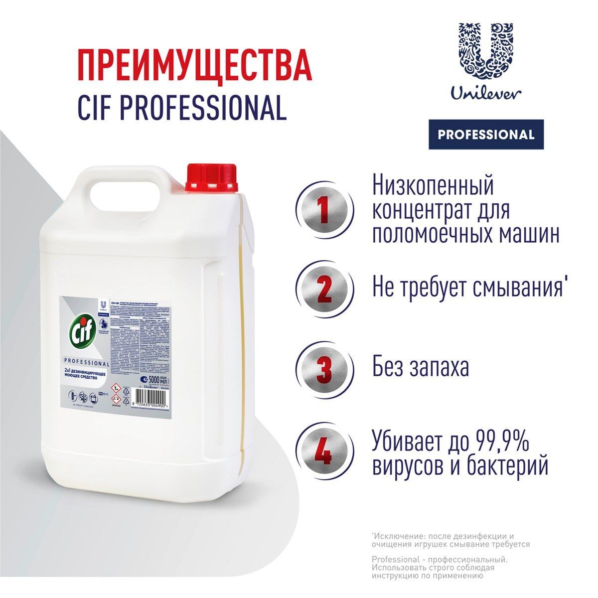 Описание: Cif Professional - универсальное высококонцентрированное дезинфицирующее и моющее средство без запаха, низкопенное, на основе бензалкония хлорид, не требующее смывания с широким спектром применения. Средство эффективно борется с широким спектром микроорганизмов (вирусы, бактерии и др.), нейтрализует неприятные запахи.