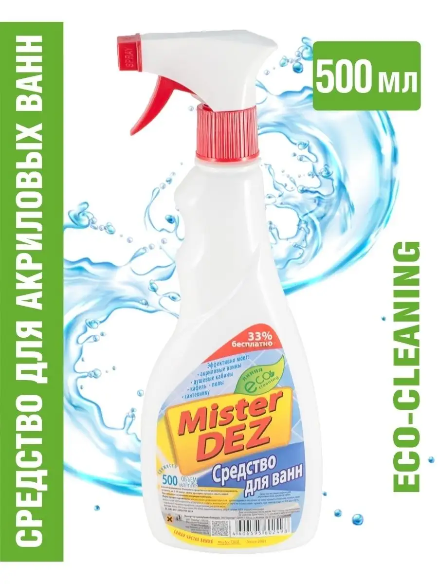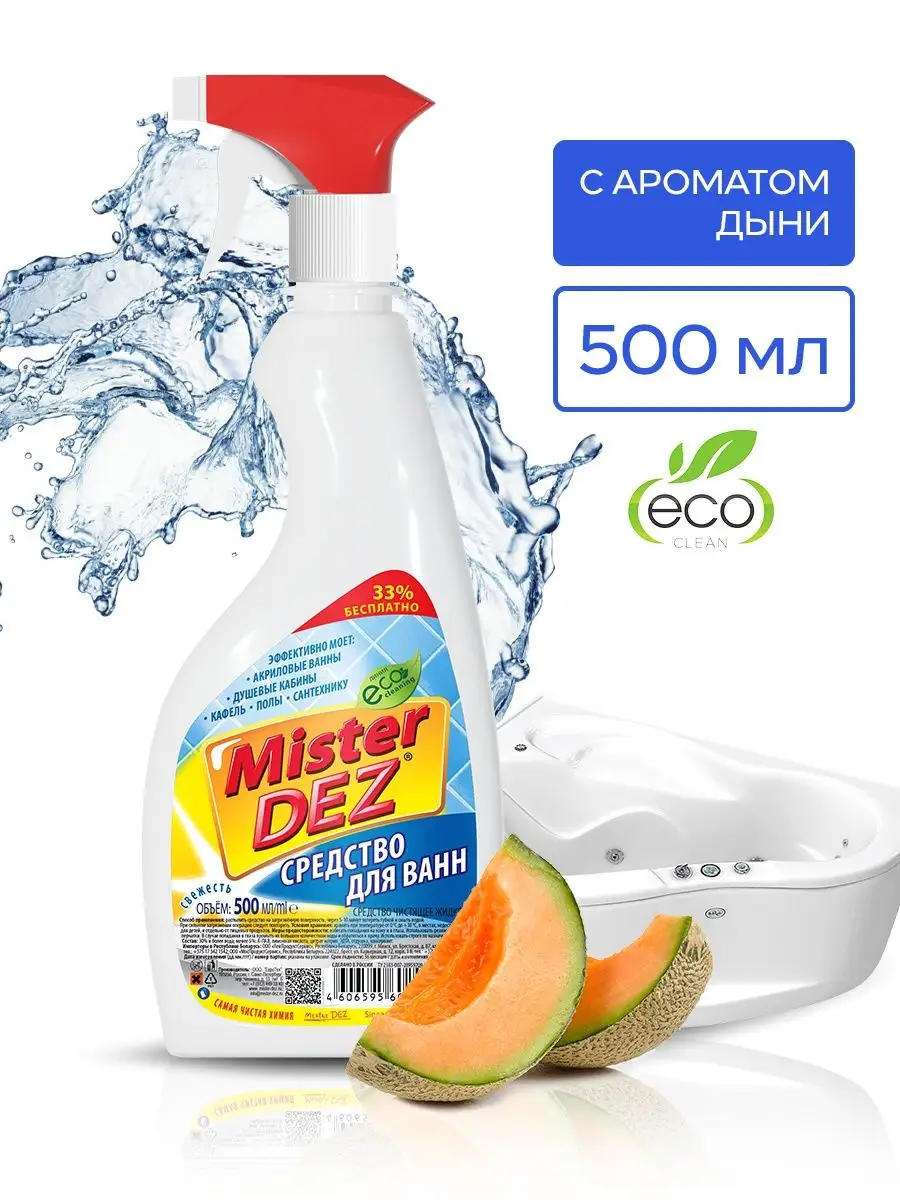 Описание: Средство для чистки ванной комнаты "Mister Dez Средство для акриловых ванн и душевых кабин с ароматом дыни 500 мл" с распылителем предназначено для чистки акриловых ванн, душевых кабин, керамической плитки, сантехнических поверхностей. Мистер Дез удаляет налет и грязь; не оставляет царапин на акриловых поверхностях; обладает приятным ароматом дыни. Товар сертифицирован. Состав: 30% и более вода подготовленная; 5% или более, но менее 15% лимонная кислота; менее 5%: алкилбензосульфокислота, цитрат натрия, отдушка. Входит в линейку Eco Cleaning - не содержит вредные и опасные для окружающей среды химические вещества. Возможно, Вы искали: мистер дез, mister dez professional, мистер дез профешионал, mister dez eco-clining, мистер дез эко-клининг, mister dez eco, мистер дез эко, мистер дес, мистер дэз.