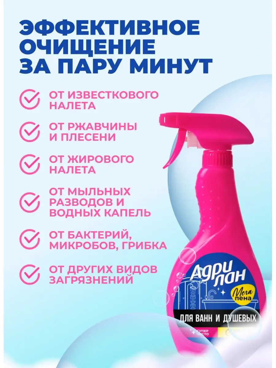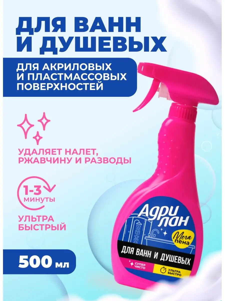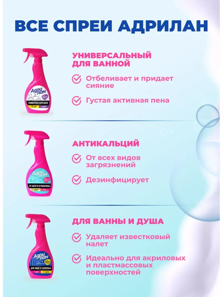 Описание: Адриан спреи и гель - высокоэффективные чистящие средства для унитаза и ванны. Средство для унитаза борется с размножением бактерий, помогает избавиться от налета и ржавчины. Чистящее средство для ванны Адриан можно использовать и как средство для акриловых ванн, плиток и других поверхностей. Антикальций спрей эффективен в качестве средства для удаления известкового налета и ржавчины. Это средство для чистки ванны и туалета избавляет поверхности от всех видов загрязнений: от мыльных разводов, до сильных загрязнений, можно использовать как средство для ванны от налета и ржавчины. Избавляет средство от известкового налета, плесени в ванной. Адрилан Спрей от всех видов загрязнений и для всех видов поверхностей: От ржавчины, налёта и водного камня, жира, плесени, подтёков, неприятного запаха. Универсальное чистящее средство Адрилан может использоваться для чистки акриловых ванн, фаянсовых раковин, унитазов, душевых кабин, смесителей, кранов, керамической плитки, пластика. Регулярное применение средство для душевых кабин предотвращает появление плесени, подтеков ржавчины и облегчает следующую уборку. Рекомендации по применению: Обязательно использовать перчатки! Встряхнуть флакон; Перед использованием поверните носик распылителя в положение "ON"; Распылите на загрязнённую поверхность; Через 3-5 минут протрите влажной губкой или щёткой; Тщательно смойте водой; При необходимости обратотайте поверхность повторно. Меры предосторожности: ВНИМАНИЕ! Не рекомендуется применять на поверхностях, чувствительных к кислотам: мраморе, тонкой эмали, меди, алюминии, коврах и т.д. При использовании на поверхностях из неизвестных материалов, протестируйте средство на незаметном участке. Не вдыхать! Не допускать попадания в глаза, на кожные покровы, слизистые оболочки! При попадании - промыть большим количеством воды. Хранить в закрытом виде, в вертикальном положении при температуре от +5 до +25, отдельно от пищевых продуктов, в месте недоступном для детей. Не смешивать с другими чистящими средствами. Использовать строго по назначению. После размораживания полностью восстанавливает свои свойства. Перед использованием рекомендуется встряхнуть флакон. Адрия. Адриэль. Спрей-пена. Универсальное средство для уборки ванны и туалета антиналет.