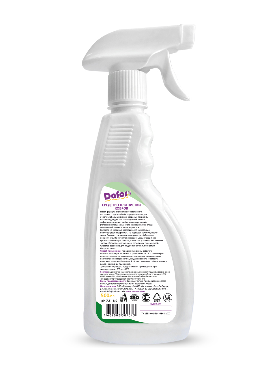Описание: Dafor для ковровНовая формула экологически безопасного чистящего средства «Dafor» очиститель ковров, предназначена для очистки ковровых покрытий, а так же мебельных тканей, пятен на одежде, в том числе детской.