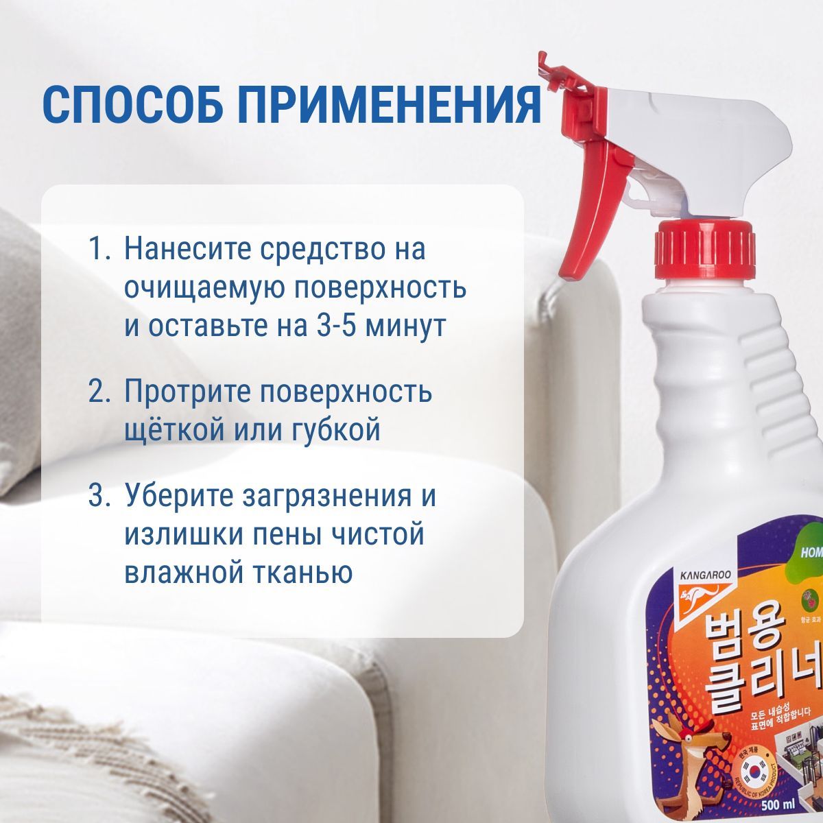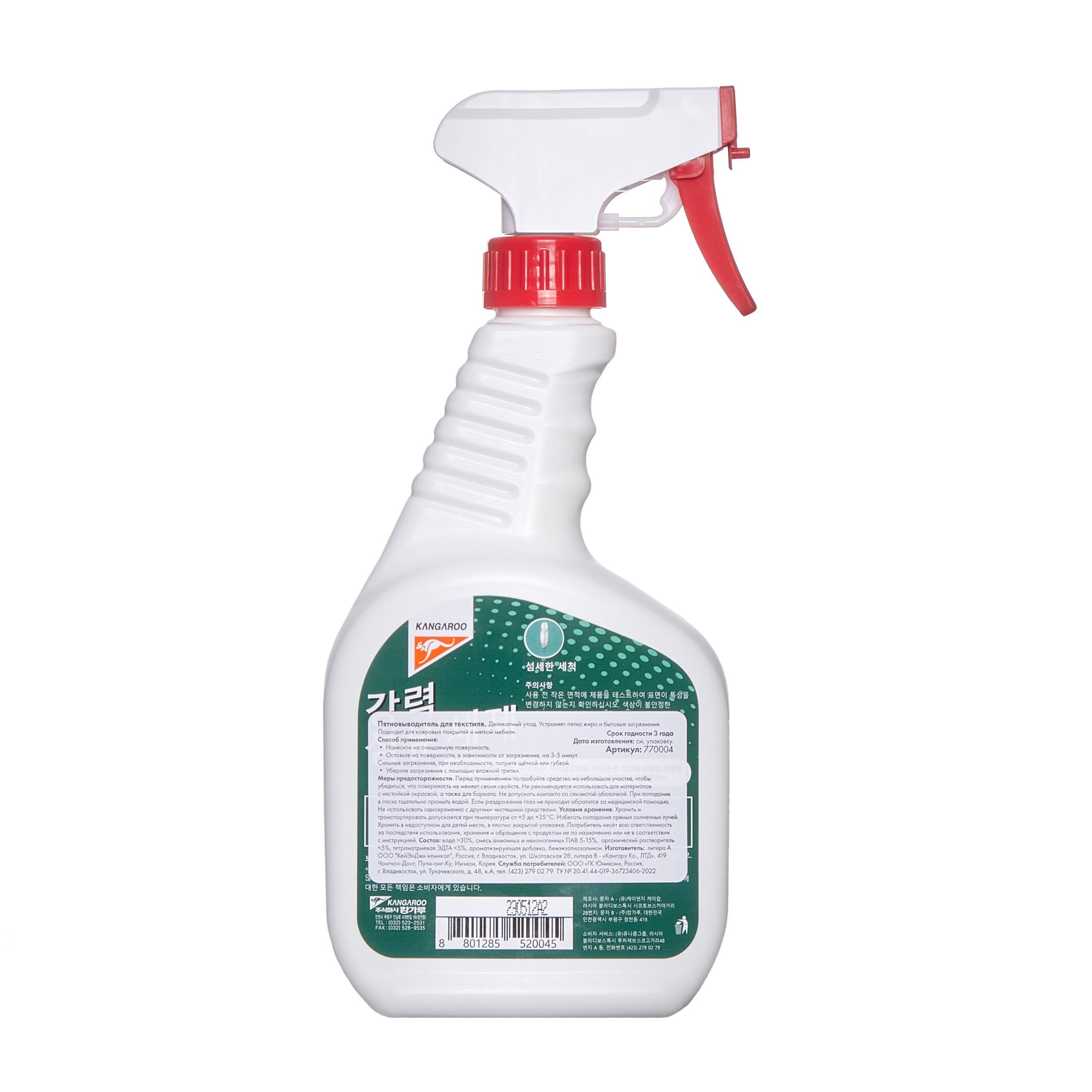 Пятновыводитель для текстиля Kangaroo Home — это универсальное средство для чистки мягкой мебели, ковров, одежды, матрасов, обивки салона автомобиля и других текстильных поверхностей. Средство для ковров легко и быстро удаляет грязь, жирные пятна, следы от вина, ягод, кофе и чая, не оставляя при этом разводов. Высокоэффективный состав чистящего средства проникает глубоко в волокна ткани, выталкивая загрязнения наружу, не повреждая при этом структуру текстиля. Кроме того, моющее средство обладает антистатическим эффектом, что в дальнейшем препятствует оседанию пыли и позволяет поверхностям дольше оставаться чистыми. После проведения уборки на поверхности остается ненавязчивый аромат, цвет очищаемых изделий становится ярче, а покрытие - мягче и приятнее на ощупь. Средство для чистки ковров и мягкой мебели не требует смывания, достаточно просто убрать лишнюю пену при помощи влажной ткани или губки. Распылитель позволяет равномерно нанести средство и подходит как для точечного удаления небольших пятен, так и для обработки больших поверхностей. Объем 500 мл.