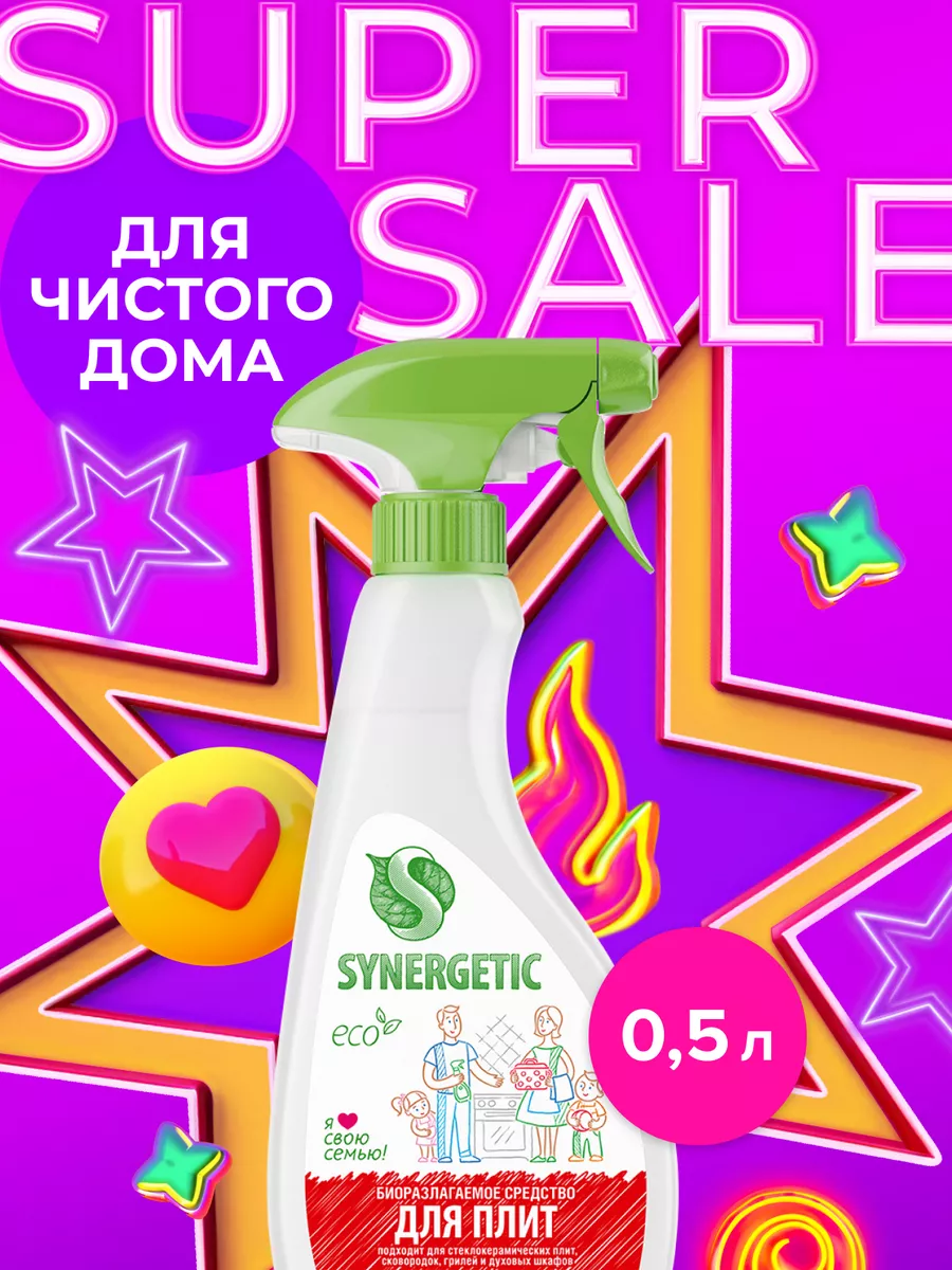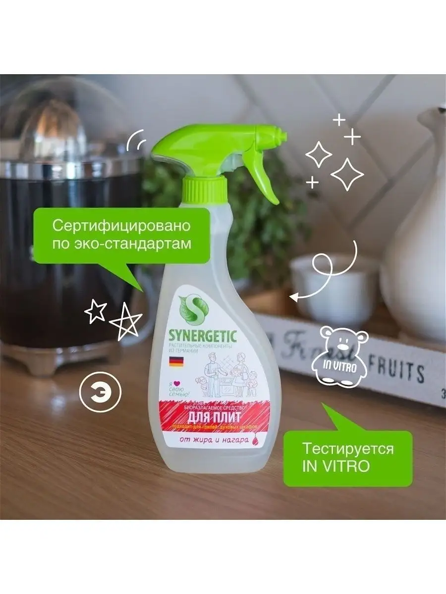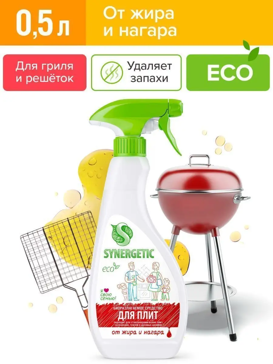 Описание: Биоразлагаемое средство для плит SYNERGETIC — высокоэффективное щелочное средство для удаления жира, нагара и копоти с плит и других кухонных поверхностей. Комплекс биоразлагаемых растительных тензидов и соды справляется с органическими загрязнениями за считанные минуты! Кальцинированная сода создает необходимую для расщепления пятен щелочную среду и растворяет масложировые компоненты загрязнений. ПОДХОДИТ ДЛЯ: металлических, стеклокерамических, эмалированных плит; сковородок; противней; кастрюль; шампуров; решёток-гриль; пароконвектоматов; микроволновых печей; духовых шкафов; каменных столешниц; керамической плитки. Концентрированное средство для плит безопасно для септических установок. Попадая в среду септика, оно «понятно» для микроорганизмов и без труда распадается на простые соединения. *** Благодаря инновационной формуле нашего средства антижир, вы сможете легко и быстро устранить самые устойчивые загрязнения. Наш спрей мощно удаляет жир, пятна и остатки пищи, оставляя вашу плиту сверкающе чистой. Хочется отметить, что наше средство полностью безопасно для использования и не содержит агрессивных химических компонентов. Оно эффективно и при этом не наносит вреда окружающей среде. Удобный распылитель позволяет наносить средство точечно, что экономит его расход и обеспечивает долгий срок службы бутылки. Составленная с любовью формула средства оставляет на поверхности защитную пленку, что упрощает процесс очистки в будущем. Превратите чистку плиты в легкую и приятную задачу с помощью спрея для чистки плит Synergetic. Закажите его прямо сейчас и убедитесь сами, почему наш бренд выбирают профессионалы и обычные хозяйки дома. У нас есть акции и распродажи, вы можете купить наши товары в подарок со скидкой! Инструкция по применению : Средство нанести на охлажденную очищаемую поверхность, при необходимости выдержать 3-5 минут, смыть водой. Средство замерзает, после размораживания и перемешивания сохраняет свои свойства
