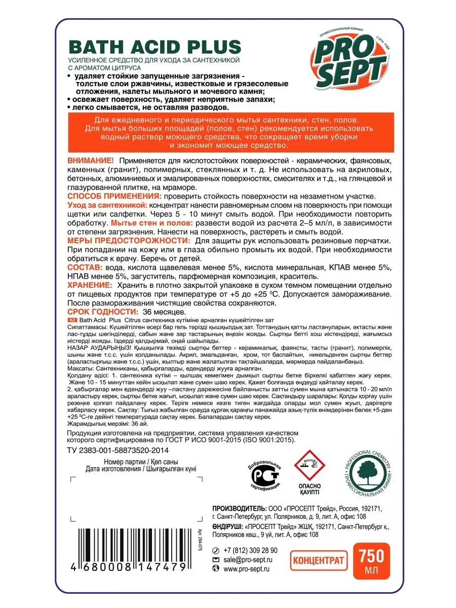Описание: Средство,концентрат для чистки сантехники, 750 мл. Гелеобразное средство усиленного действия, на основе щавелевой и ортофосфорной кислоты.- Очищает сильно запущенные загрязнения: толстые слои ржавчины, известковые и грязесолевые отложения, налеты мыльного и мочевого камня.- Благодаря густой консистенции, средство задерживается на поверхности усиливая эффект от чистящего состава.- Не использовать на акриловых, алюминиевых и эмалированных поверхностях, а также на смесителях, мраморе и глянцевой/глазурованной плитке.