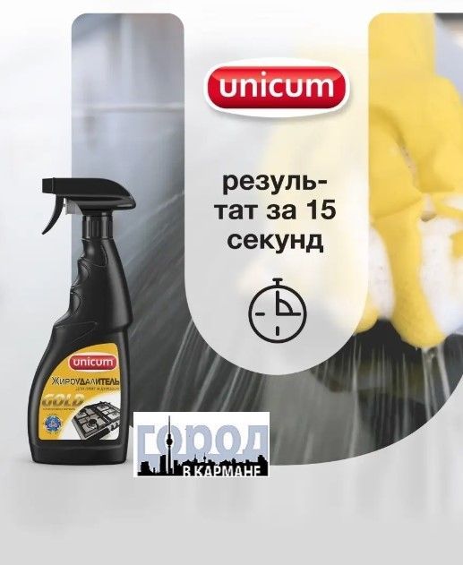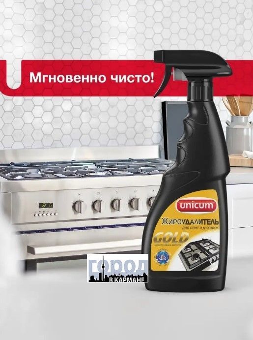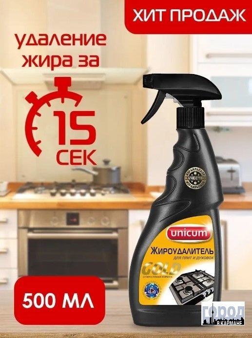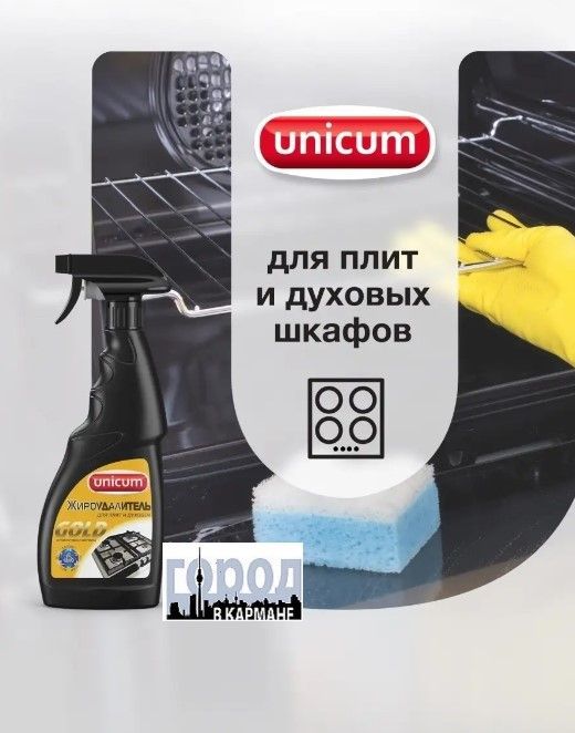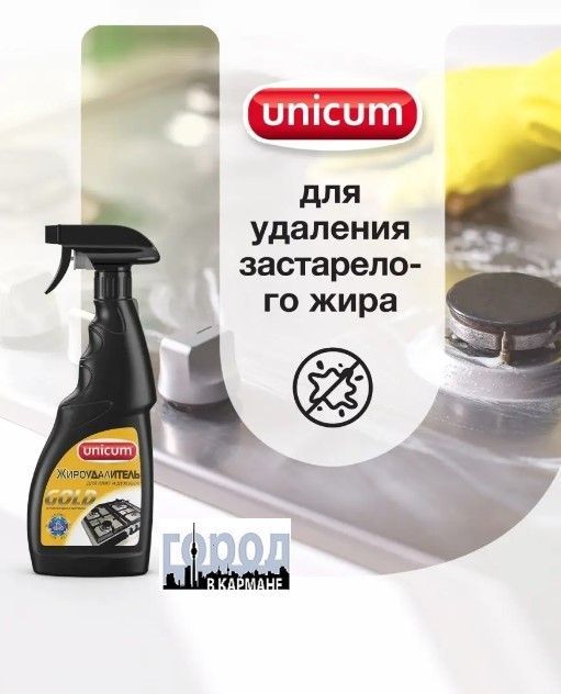 Unicum.Желаем Вам приятных покупок в нашем магазине! Жироудалитель Gold - особое средство для мгновенного удаления самых стойких застарелых и подгоревших масложировых загрязнений, нагара, копоти с поверхностей кухонных плит, духовых шкафов, грилей, кастрюль, сковородок, с прочих поверхностей для приготовления пищи пароуловителей, кафельной плитки, в том числе и с охлажденных поверхностей. Способ применения: Нанести средство на загрязненную поверхность, подождать 15-20 секунд, протереть влажной тряпкой и смыть водой. В случае особо стойких загрязнений - повторить действие, увеличив время обработки до 1 минуты.