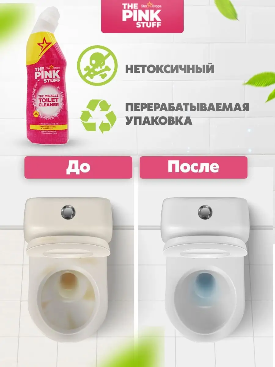Описание: Многие чистящие средства содержат агрессивные химические вещества, которые небезопасны для использования и могут оставить следы и царапины и при этом не справляются со стойкими загрязнениями. Но средство для чистки унитаза Pink Stuff Toilet Gel, легко поможет избавиться от пятен, известкового налета и ржавчины, оставляя поверхности чистыми и блестящими. Благодаря активной формуле очиститель для туалета эффективно удаляет даже застарелые загрязнения и уничтожает вирусы и бактерии. За счет густой консистенции гель равномерно распределяется, не стекает, экономично расходуется. Чистящее средство для унитаза Pink Stuff - идеальный помощник для поддержания чистоты и блеска туалета без повреждения поверхностей! Применение: нанесите средство под ободок унитаза, оставьте на несколько минут, почистите унитаз ершиком или губкой, смойте. Меры предосторожности: не смешивать с другими чистящими средствами, людям с чувствительной кожей рекомендуется использовать перчатки при работе со средством.