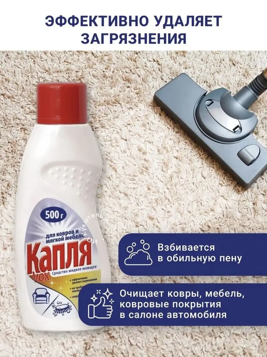 Описание: Средство для ковров и мягкой мебели"КАПЛЯ VOX", 500г. Эффективное современное средство для чистки ковров и мягкой мебели. Надежно удаляет загрязнения, сохраняя цвет и фактуру покрытия. Хорошо пенится, обладает приятным запахом, не требует ополаскивания водой. Способ применения:Необходимо растворить средство в теплой воде из расчета 1 колпачок на 2,5 литра воды. Взбейте раствор в пену. Нанести на загрязненную поверхность. После полного высыхания удалить остатки средства пылесосом.