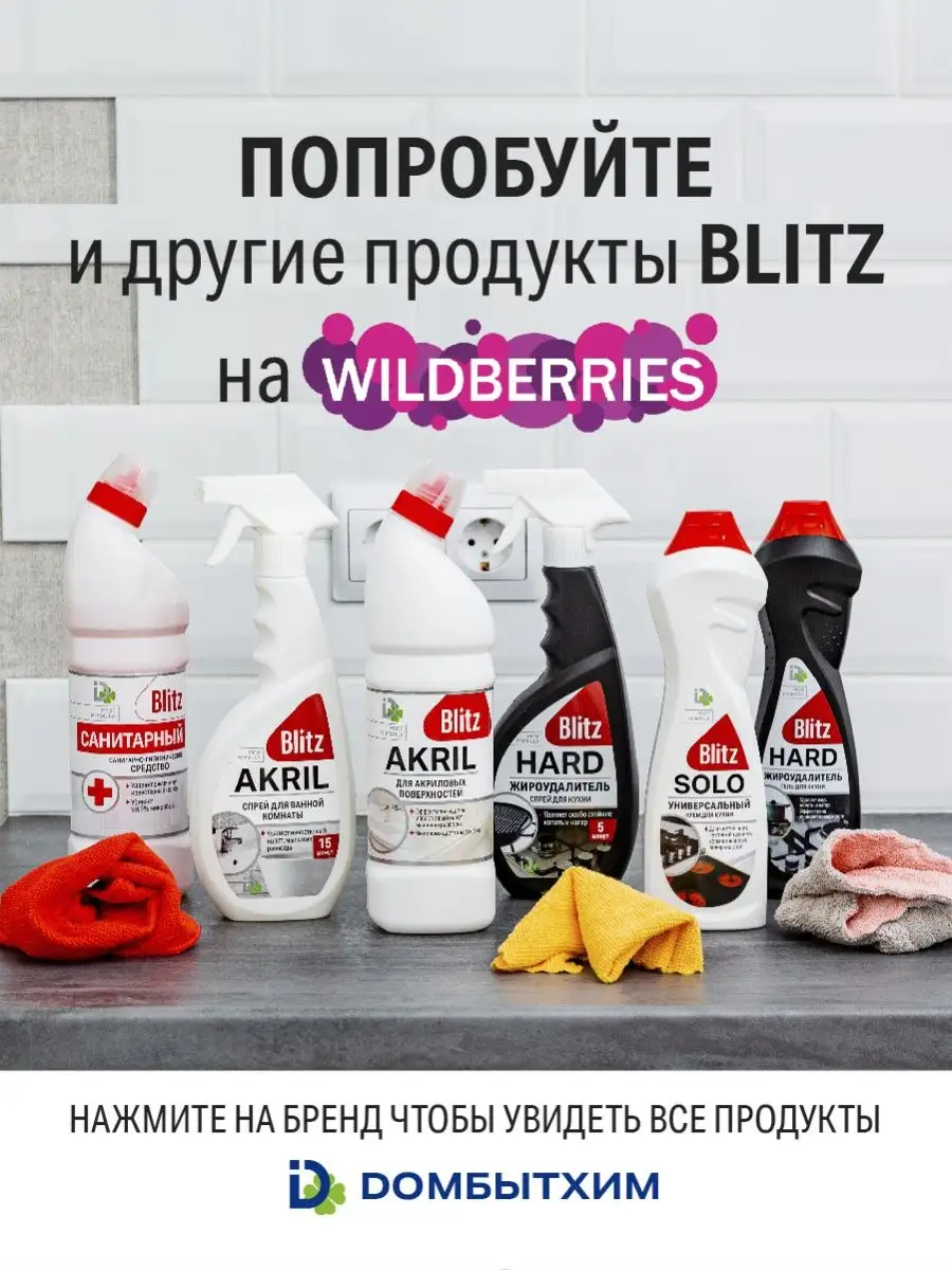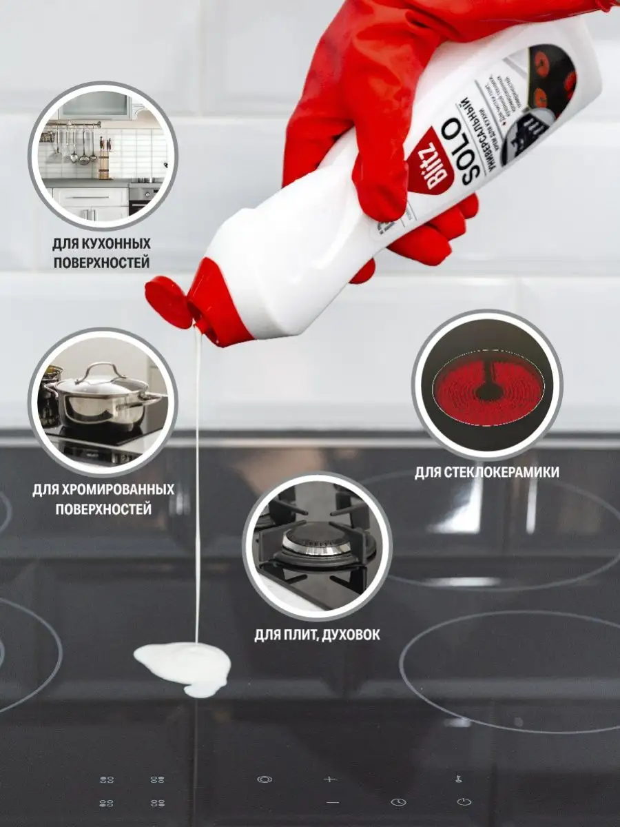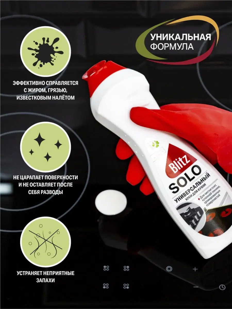 Описание: Универсальная чистящая крем паста для уборки на кухне BLITZ SOLO,500 г эффективно и бережно без царапин очищает от жира и известкового налета. Моющее средство безопасно для любых покрытий, в том числе для чистки стеклокерамики и для нержавеющей поверхности, для фаянсовых, эмалированных, хромированных раковин, для мытья пластика, керамической плитки и кафеля, для кухонных шкафов и столешниц. Жироудалитель с усиленной формулой обеспечивает идеальную чистоту без разводов, дезинфекцию поверхностей, придает блеск и устраняет неприятные запахи. Антижир подходит для всех типов кухонной техники: средство для стеклокерамических плит и для индукционной, для духовки и микроволновки. Нежный кремовый гель с активными микрокристаллами проникает внутрь загрязнений, расщепляет и удаляет их. Способ применения: равномерно нанести жидкость, оставить на 5-10 мин, потереть губкой, смыть. На страничке бренда BLITZ представлена бытовая химия для дома и хозяйственные товары для профессиональной обработки.