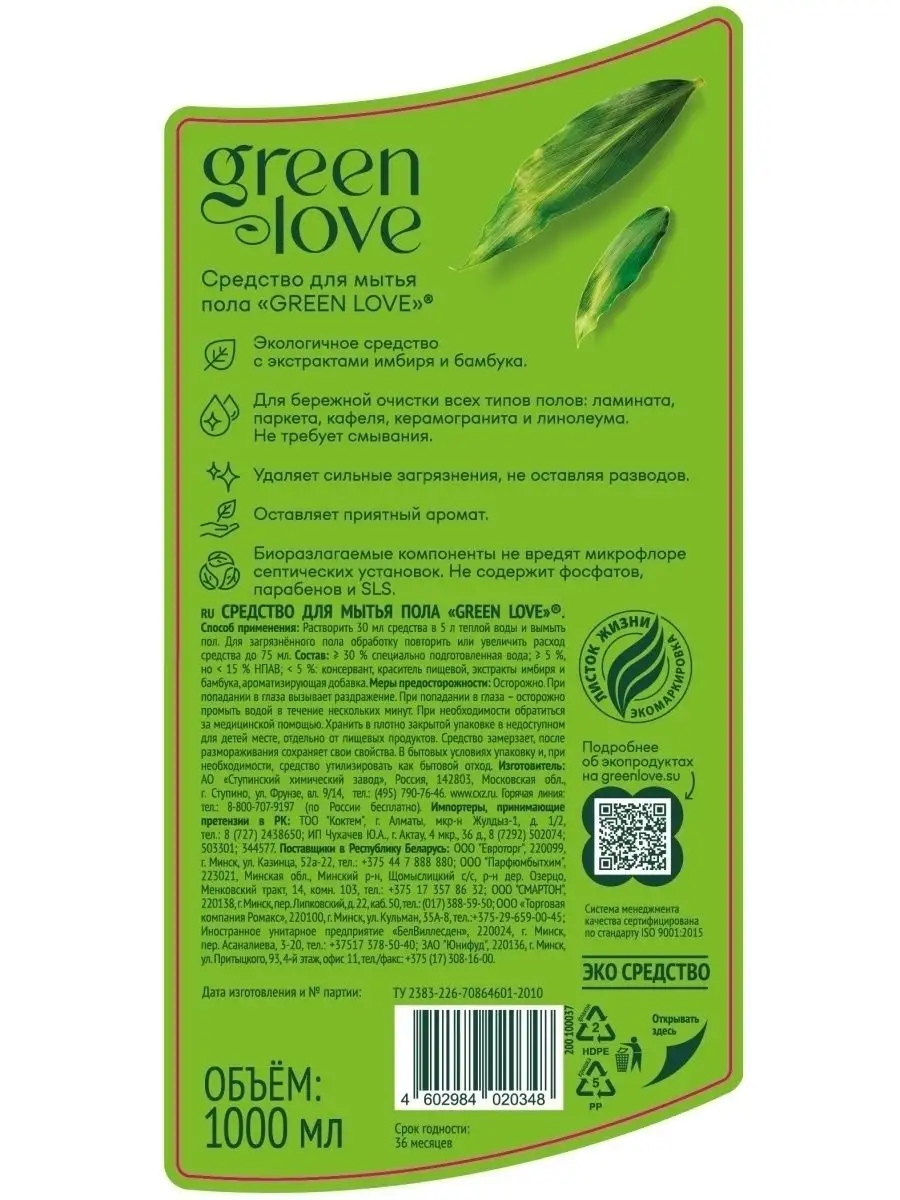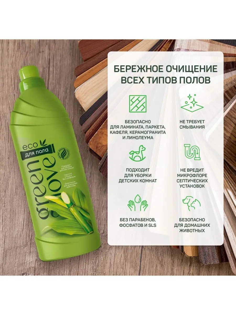 Описание: Средство для мытья полов Green Love – идеальное экологичное решение для эффективной уборки в доме. Это универсальное моющее эко средство, которое подходит для любой напольной поверхности, включая ламинат, линолеум. Отмывает кафель, паркет, а так же плитку, пластик и многое другое. Бережно относится к окружающей среде, не содержит хлора и фосфатов, парабенов, SLS и химических красителей. Моющее средство состоит из биоразлагаемых компонентов, не содержит микропластика, что снижает нагрузку на окружающую среду и не вредит септическим установкам. Его концентрированная формула позволяет легко и эффективно удалять самые стойкие загрязнения, не оставляя разводов или запаха, и не требует смывания водой. Безопасно для домашних животных. Концентрат поставляется в упаковке 1 литр, очищает поверхности от пыли, грязи и пятен, придает им блеск и приятный аромат зеленого бамбука. Чистящее средство содержит антибактериальные компоненты, которые уничтожают микробов и бактерии, обеспечивая чистоту и свежесть в любом помещении – кухня, комната, в том числе туалет, ванна. Мощный эффект средства обеспечивают идеальную чистоту и гигиену в вашем доме. Это особенно важно в детской комнате, где уход за чистотой играет важную роль для здоровья детей. Экономичный расход - для повседневной домашней уборки достаточно 30 мл жидкости развести в 5 л воды. Жидкость для мытья полов Green Love не содержит хлор и безопасно для всех типов покрытий, включая дерево и мрамор. Бытовая химия Green Love - это надежные, экологичные и безопасные средства для ухода за домом, которые можно использовать ежедневно. Их концентрированная формула делает средства экономичным в использовании, а приятный аромат и эффект чистоты будут радовать вас и ваших близких. Продукт имеет сертификат международного уровня "Листок жизни". *Концентрат — вид продукции, в которой содержание активных компонентов выше, чем в обычном средстве. Концентрированная формула не влияет на густоту продукта, но влияет на его эффективность. Продукты с концентрированной формулой могут иметь разную текстуру и степень густоты. Более жидкие продукты быстрее растворяются в воде. Более густые продукты дольше задерживаются на наклонной или вертикальной поверхности или позволяют точнее дозировать продукт.