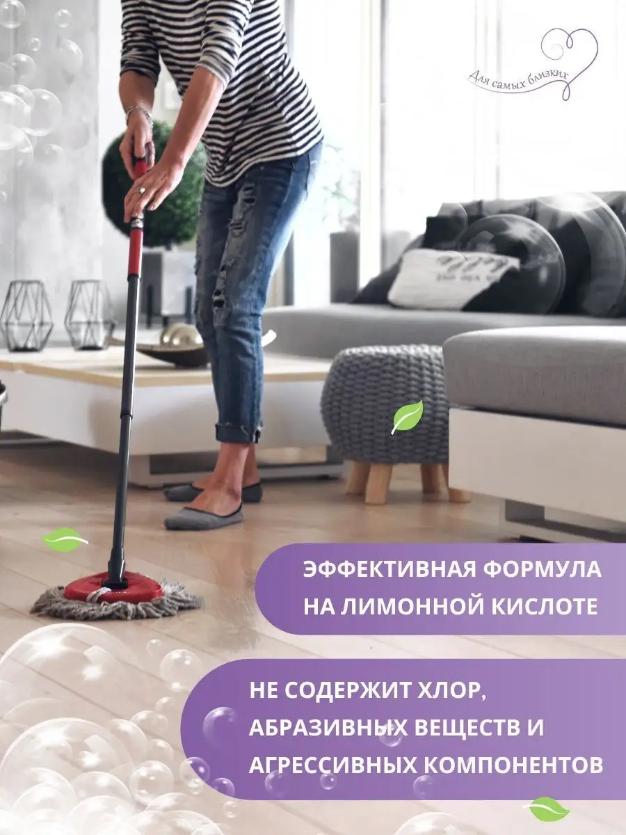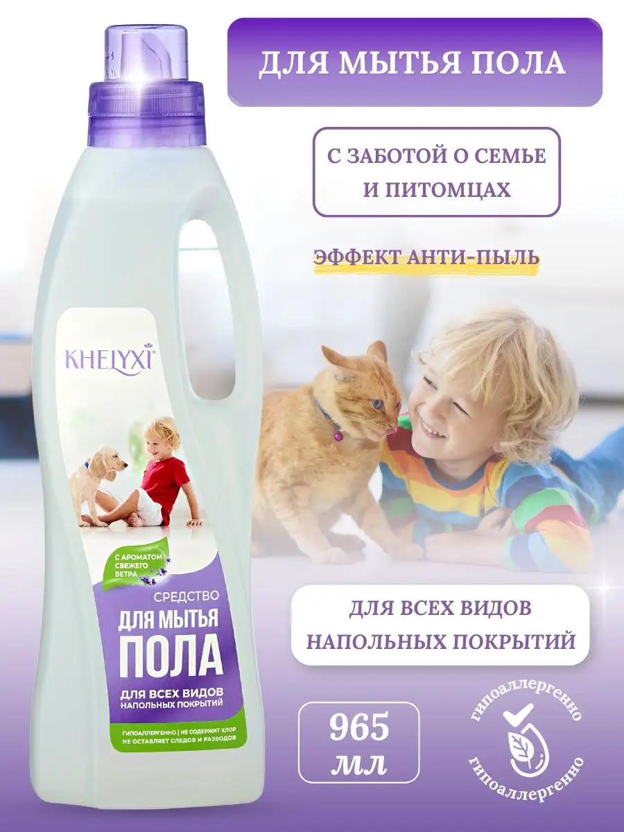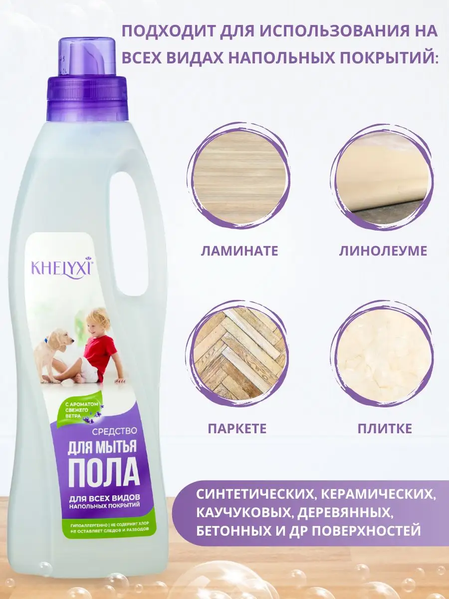 Описание: Биоразлагаемое концентрированное моющее средство для мытья полов и поверхностей KHELYXI «С ароматом свежего ветра» – универсальное для ежедневной и генеральной уборки пола и других мест в доме: столов, стен, потолка. С легкостью справится с запахом животных. Удаляет все виды загрязнений, включая жир, известковый налет и пятна от пищевых продуктов, придает блеск, а также производит антистатический эффект (анти-пыль). Гипоаллергенно и подходит для людей даже с чувствительной кожей. Безопасно для помещений с питомцами, детьми.