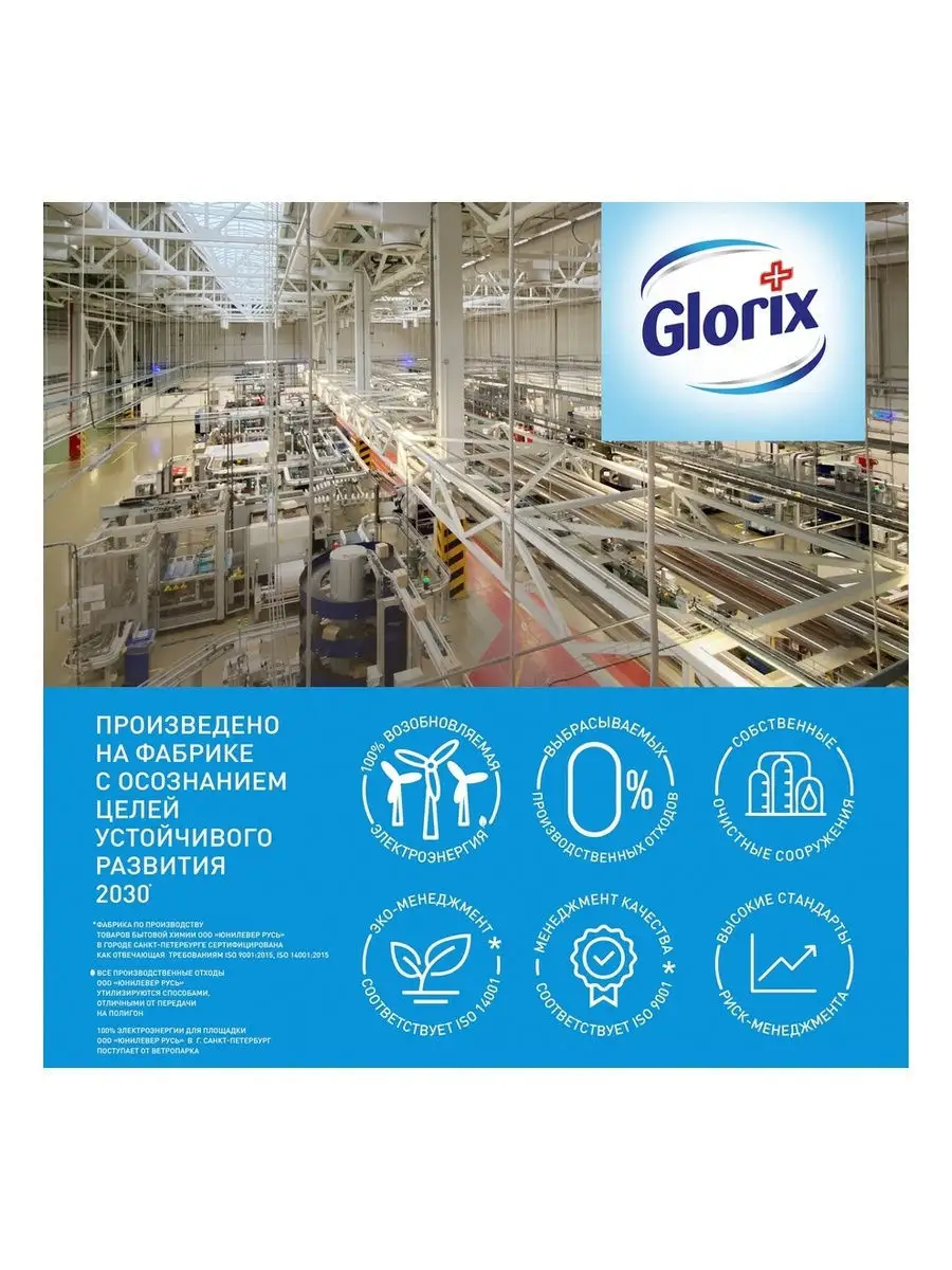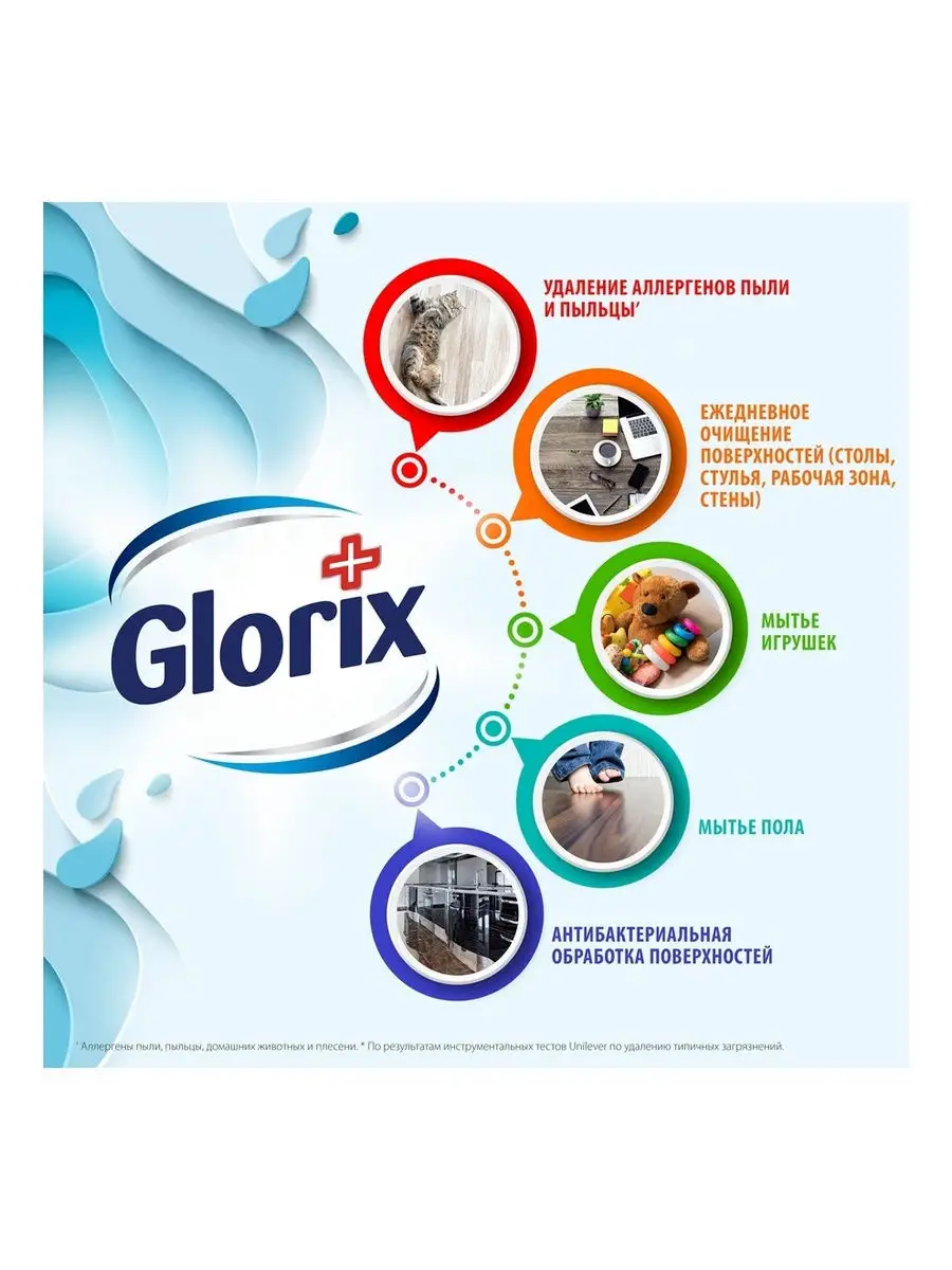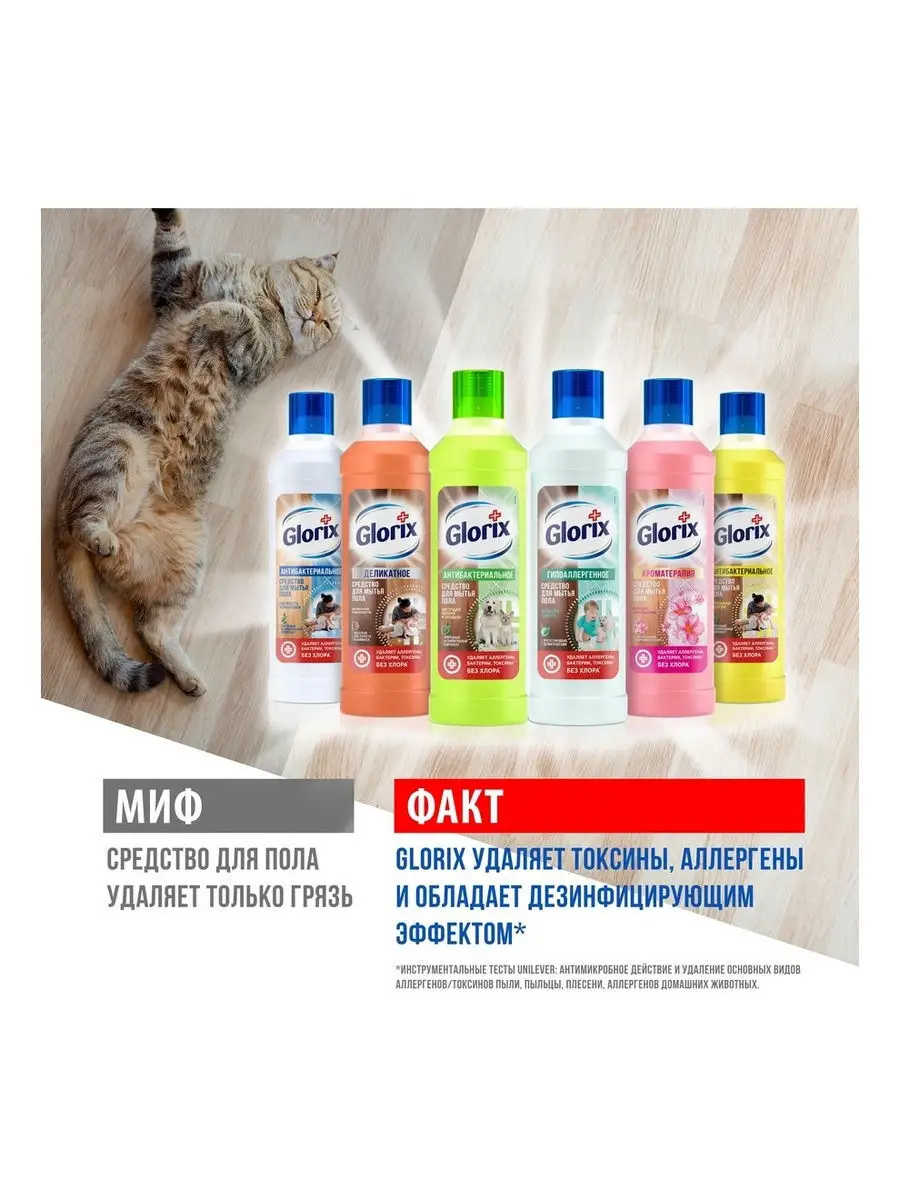 Описание: Ежедневно в наш дом попадают миллионы опасных бактерий, которые оседают на полу. Обезопасить себя, родных и питомцев мы можем поддерживая чистоту и гигиену пола. Glorix для мытья пола очищает от грязи, обладает дезинфицирующим эффектом, устраняя 99.99% бактерий (при использовании в неразбавленном виде и в разбавленном в пропорции: 1 колпачок на 1 л. воды) без хлора и спирта, удаляет аллергены и болезнетворные микробы. Активный дезинфицирующий компонент Glorix безопасен для природы, животных и человека (Перед использованием ознакомьтесь с мерами предосторожности на этикетке). Он подходит даже для антимикробной обработки детских игрушек! Помимо уборки и гигиены пола, моющие средства Glorix можно использовать для небольших поверхностей дома и всех видов покрытий: линолеума, кафеля, ламината, искусственного камня, пластика, паркета и многих других. Вскрыть пленку при получении. Обязательная информация о товаре расположена на индивидуальной упаковке.