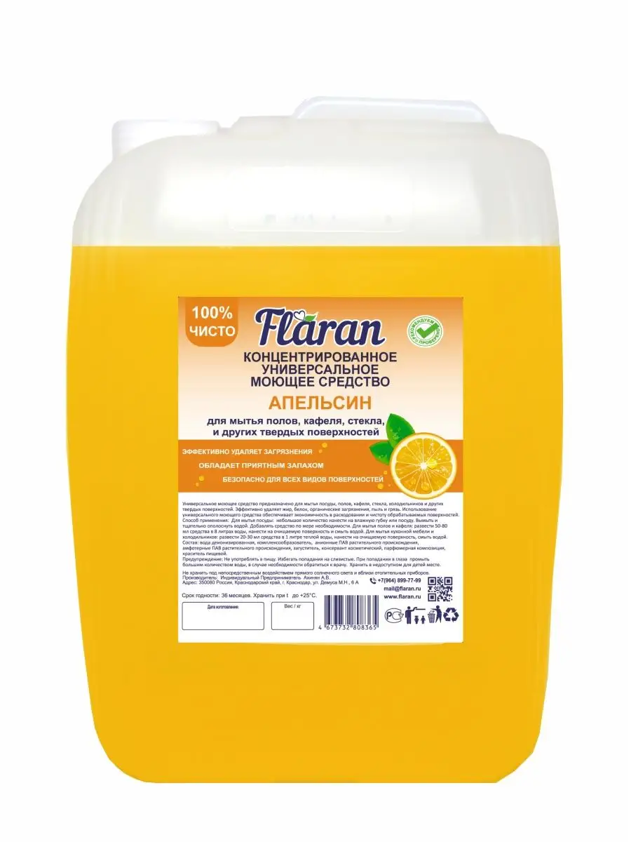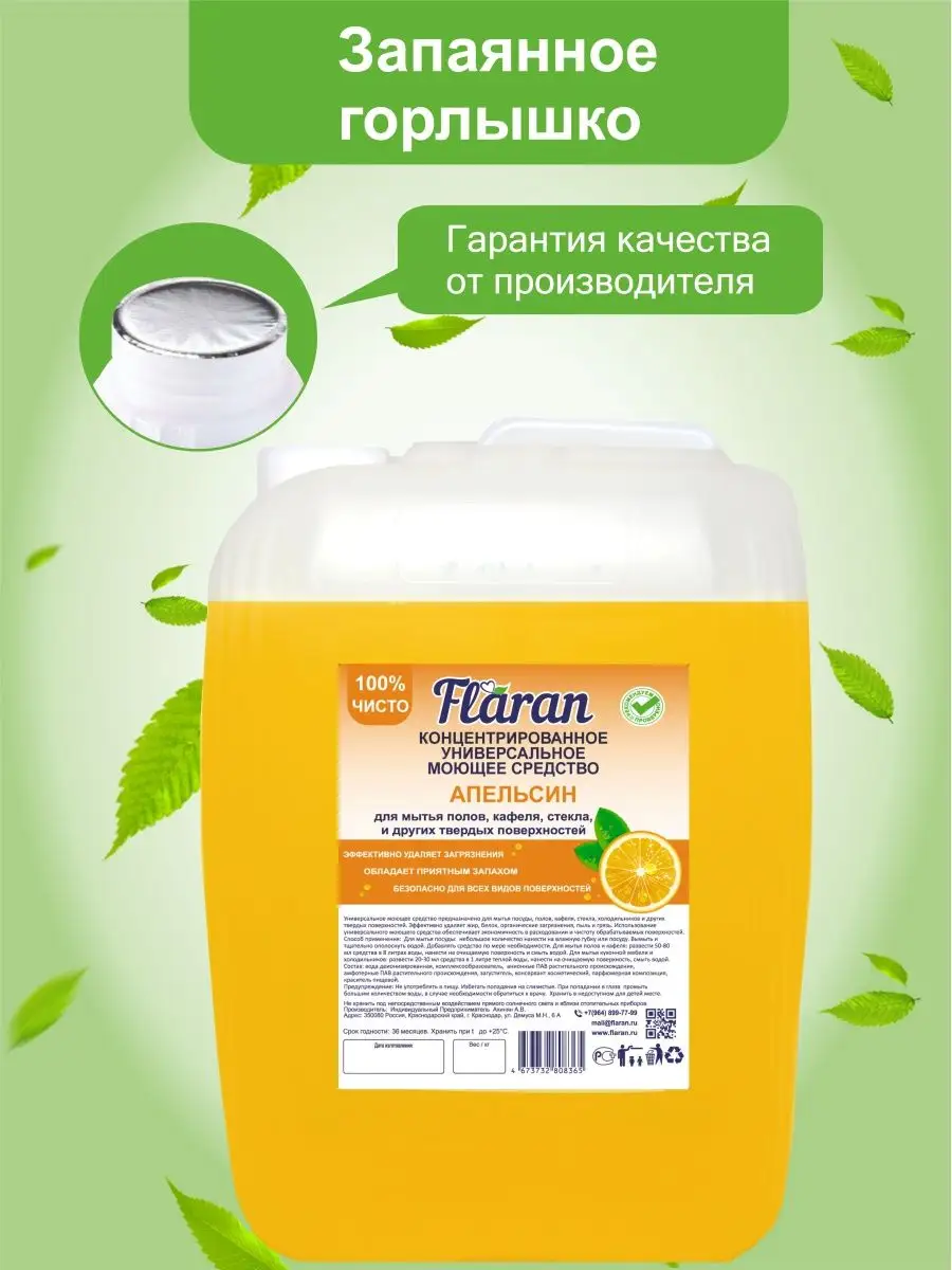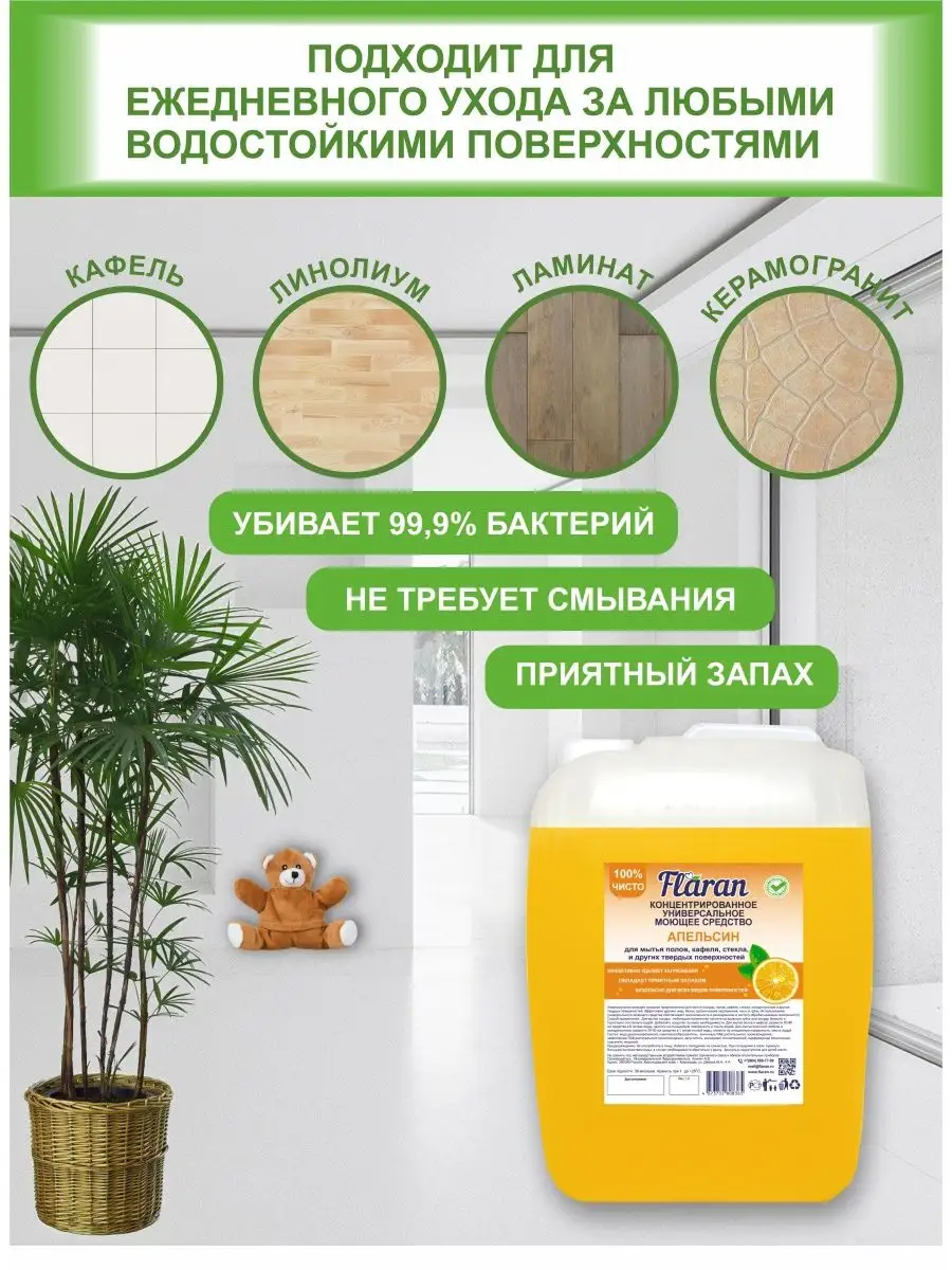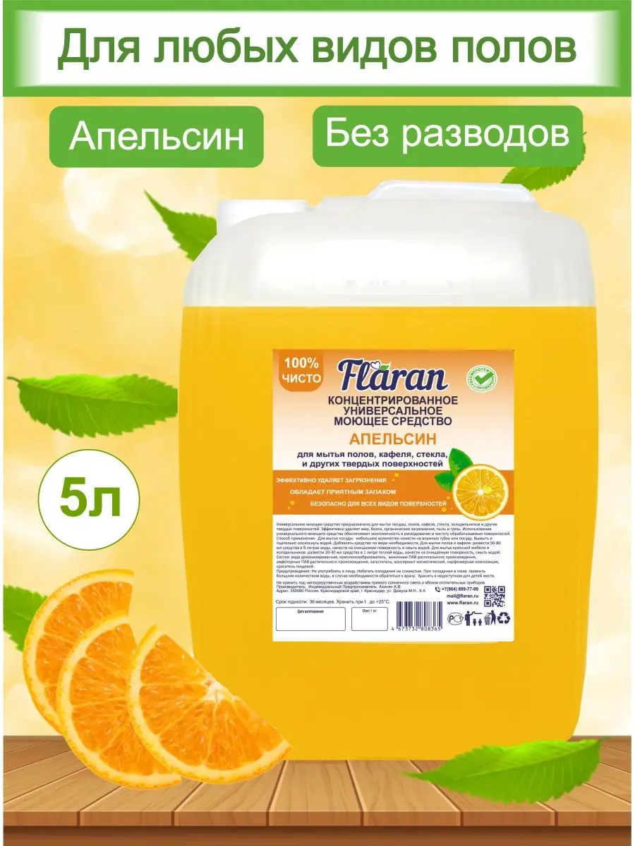 Описание: Средство для мытья полов Flaran универсальное гипоаллергенное моющее средство 5 л для ежедневной и генеральной уборки пола и других поверхностей на основе биоразлагаемых компонентов. Средство не оставляет разводов, при этом не требует смывания. Универсальное моющее средство гиппоаллергенно, биоразлагаемо и состав не содержит агрессивных сульфатов и фосфатов. Средство для мытья полов подходит для синтетических и виниловых покрытий, поверхностей из линолеума, дерева, паркета, ламината, асфальта, бетона, облицовочной плитки, стекла, гранита и мрамора. Жидкость для мытья полов, благодаря умеренному пенообразованию универсальное средство для уборки ванной туалета. Средство для чистки дома используется в бытовых и подсобных помещениях, на объектах социальной и общественной сферы, гостиницах, отелях, бизнес-центрах, спортивных залах, гипермаркетах, коммунальном хозяйстве, кухне, ванне, туалете и дома. Устраняя загрязнения любой сложности, чистящее средство Flaran способствует нейтрализации неприятных запахов. С моющим средством Flaran всегда будете наслаждаться чистотой и уютом в помещении. Рекомендуем вам ознакомиться со всей линейкой нашей продукции, перейдя на сайт нашего магазина. Способ применения: Концентрат разводят в пропорции 1:500 - 1:100 или 2-10 мл на 1 литр воды. Концентрация раствора зависит от характера загрязнения.