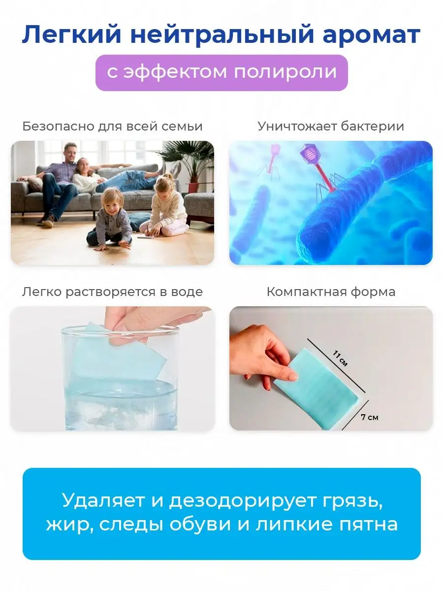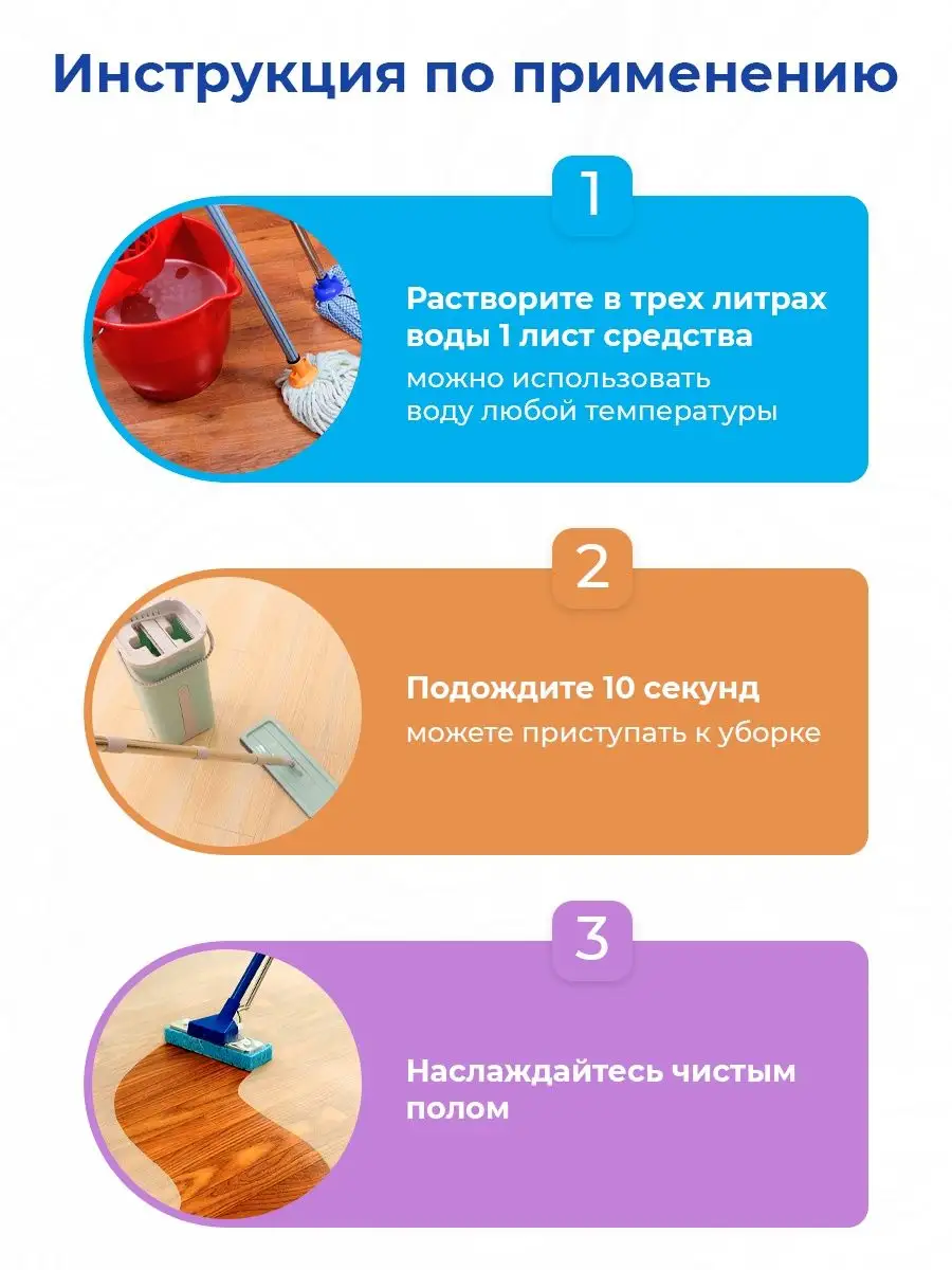 Описание: Пластины растворимые для мытья пола. Супер компактное и лёгкое, заменяющее тяжёлые, объемные упаковки с домашней жидкой химией. Универсальное моющее средство для уборки и мытья полов в упаковке 30г заменит Вам бутылку с бытовой химией 5 литров. Эта небольшая упаковка помогает экономить - средства хватит на 30 циклов уборки. Не оставляет разводов и следов. Не раздражает и не сушит кожу рук. пластины для мытья полов легко помещаются на полку и не занимают много места. Средство подходит для ежедневного ухода за любыми моющимися поверхностями. Можно использовать для мойки всех типов полов. Концентрированное моющее средство подходит для синтетических и виниловых покрытий, поверхностей из линолеума, дерева, паркета, ламината, асфальта, бетона, облицовочной плитки, стекла, гранита и мрамора. Средство для уборки и чистки в доме можно использовать в бытовых и подсобных помещениях, на объектах социальной и общественной сферы, отелях, бизнес-центрах, гипермаркетах, коммунальном хозяйстве. Не требует смывания, не оставляет разводов, не разрушает защитный слой поверхности. Сухое средство для уборки удаляет жировые загрязнения растительного и животного происхождения, нейтрализует запахи. Средство практически без запаха – присутствует еле уловимый антибактериальный запах. Универсальное чистящее средство на страже чистоты. Полученная жидкость без труда справляется с жиром, пылью, удаляет загрязнения с любых твердых поверхностей, в том числе деревянных. Раствор для мытья пола справляется с грязью на 100% и не оставляет после себя разводов. Безопасный состав - в составе продукта нет хлора, аммиака и добавленных консервантов. Избавляет дом от неприятных запахов, наполняет его свежестью и чистотой. Способ применения: 1 лист с концентратом растворить на 3-5 литров воды. Сухой концентрат растворяется за 3 секунды в воде любой температуры. Концентрация раствора зависит от характера загрязнения. Помогает сохранить чистоту и уют в вашем доме. Делает уборку проще и быстрее.