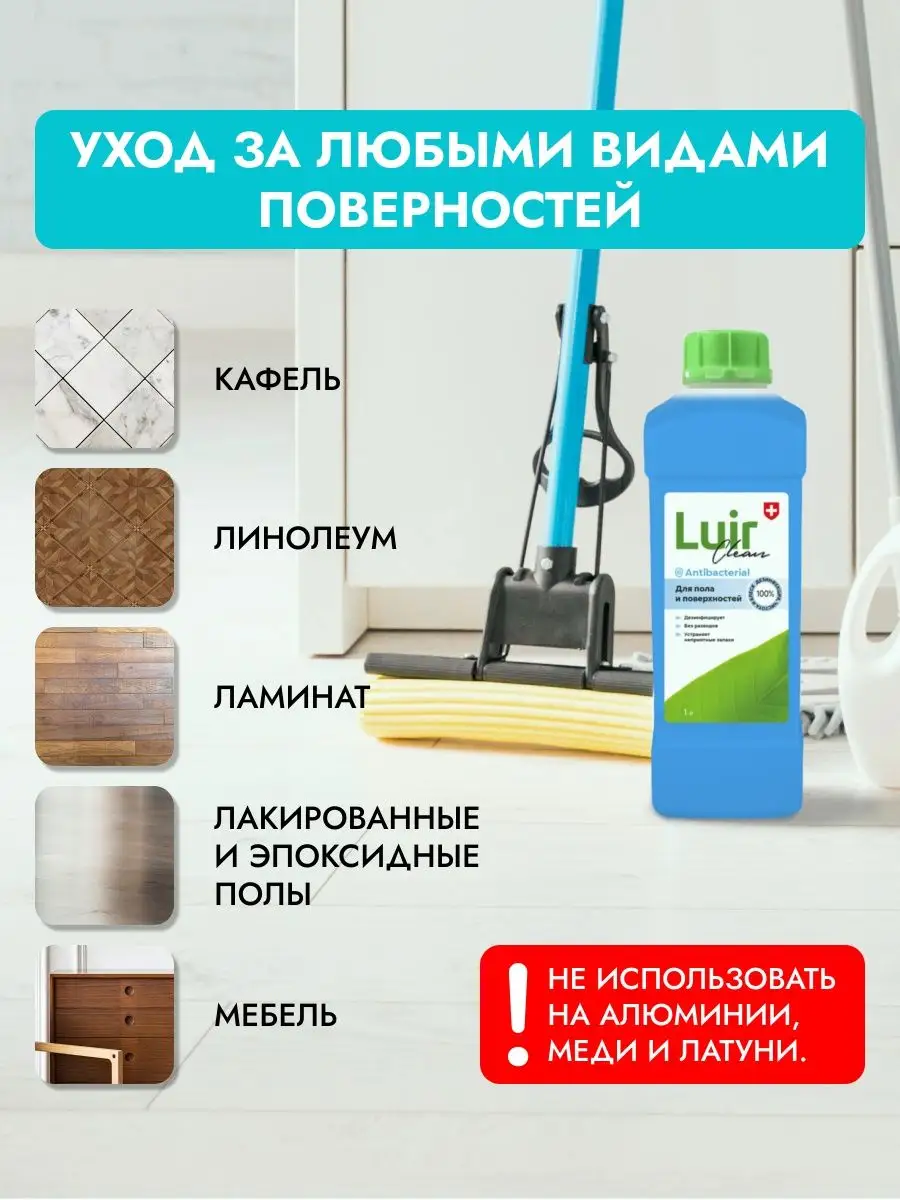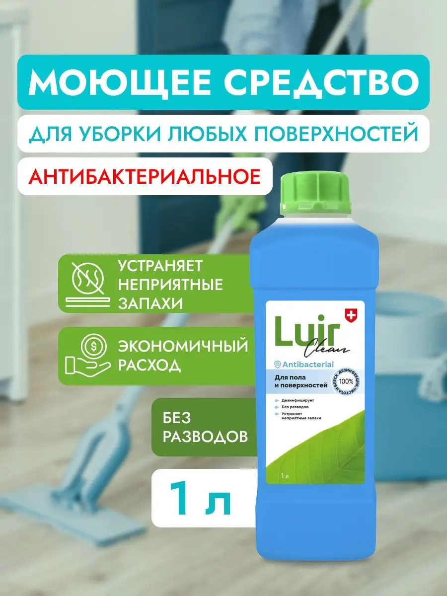 Описание: Универсальное средство для мытья полов 1 литр концентрат Люир (luir) бренда НПК Медэкс - это многофункциональное чистящее средство, которое идеально подходит для уборки пола кухни, ванной и других помещений дома и дачи. Универсальное моющее средство эффективно удаляет грязь и пятна, неприятный запах, подходит для мытья лотков животных, при этом обеспечивает безопасность вашего дома и не вредит здоровью детей и питомцев. Оно гарантирует превосходное качество уборки и защиту поверхностей, нейтрализует неприятные запахи и эффективно уничтожает бактерии. Ароматное средство для мытья полов концентрат является профессиональным решением. Будьте уверены в чистоте вашего дома с нашей экологически чистой премиальной химией для уборки. Бытовая химия служит очистителем для мебели - жидкость можно использовать для удаления пыли и пятен с дивана, стен, кафеля, ламината, обивки кухонных покрытий и других поверхностей. Антибактериальное экологичное средство премиум - качества поставляется в удобной бутылке объемом 1 литр. Жидкость ждя уборки является дезинфицирующим раствором, который удаляет разные загрязнения, обеспечивает качественное очищение и нейтрализацию неприятных запахов. Он безопасен для детской комнаты и может использоваться на множестве материалов. Не использовать на алюминии, меди и латуни. При мытье предметов из материала неизвестного состава рекомендуется опробовать продукт на небольшом участке. Легкое хранение и удобный контейнер позволяет легко использовать это очень эффективное дезинфицирующее средство премиум - качества в офисе, магазине или дачном помещении. Для качественного устранения загрязнений и дезинфекции рекомендуется использовать ведро для разведения концентрата водой. Способ применения: добавьте 5-20 мл моющей жидкости на 1 литр воды, протрите загрязненное место, при необходимости смойте водой. Для трудновыводимых пятен увеличьте количество средства. После использования фирменного продукта остается легкий ненавязчивый аромат.