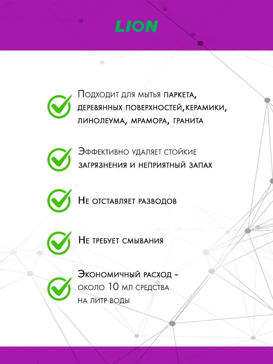 Описание: Средство для мытья пола Лаванда Lion Look Лион Пыль на Замок, 920мл в бутылке с мерной крышкой. Концентрированное средство для мытья полов эффективно удаляет стойкие загрязнения и неприятные запахи, избавляет от запаха животных. Универсальное моющее средство для пола идеально подходит для мытья любых поверхностей, для паркета, дерева, ламината, кафеля, плитки, керамики, линолеума, мрамора. Средство концентрат прекрасно удалит любые загрязнения с поверхностей, в том числе жирные и липкие пятна. Технология Dust Lock позволит эффективнее собрать пыль с пола, дольше сохраняя поверхность чистой. Средство для уборки пола не оставляет разводов и не требует смывания, быстро высыхает и не создает липкости. Безопасно для животных. Жидкость для уборки дома имеет натуральный деликатный аромат, способный полностью избавить помещение от неприятных запахов, не вызывает аллергии. Жидкость для мытья пола может быть использована для всего дома, для кухни, туалета и ванной комнаты, для детских комнат, для квартир с животными. Нажав на название продавца, вы сможете увидеть все наши японские, тайские товары, корейские бренды, хозяйственные товары, товары для уборки дома, чистящие средства, натуральное, детское, гипоаллергенное, антибактериальное средство, 1л, 5л, кухня, ванная и туалет, производства Корея, Япония, Тайланд.