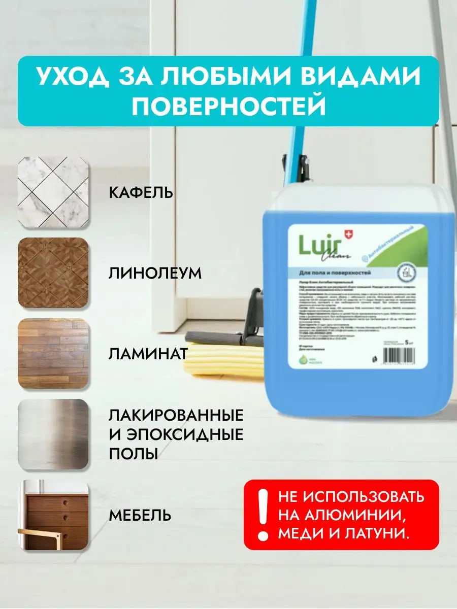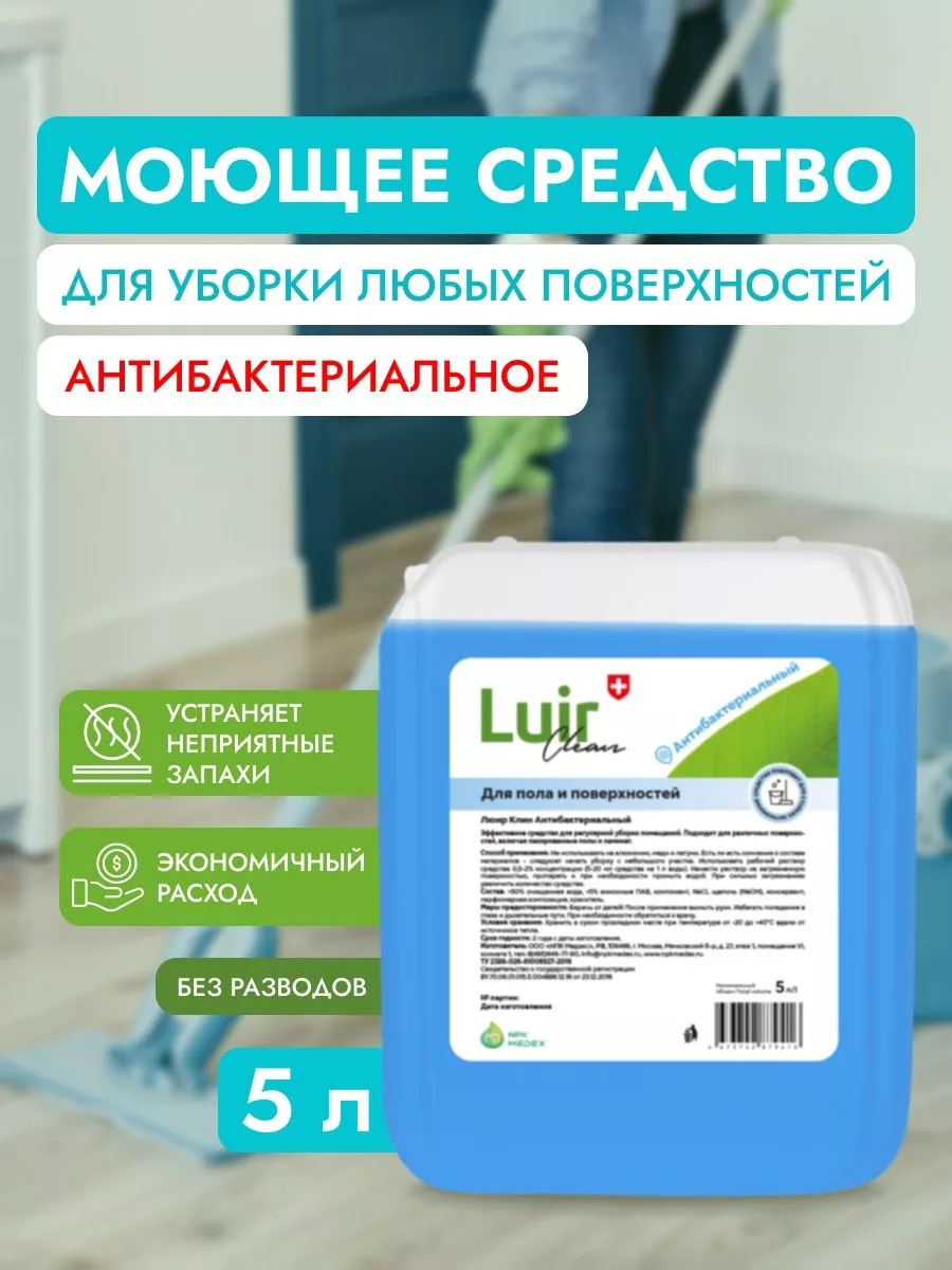 Описание: Универсальное средство для мытья полов 5 литров концентрат Люир (luir) бренда НПК Медэкс - это многофункциональное чистящее средство, которое идеально подходит для уборки пола кухни, ванной и других помещений дома и дачи. Универсальное моющее средство эффективно удаляет грязь и пятна, неприятный запах, подходит для мытья лотков животных, при этом обеспечивает безопасность вашего дома и не вредит здоровью детей и питомцев. Оно гарантирует превосходное качество уборки и защиту поверхностей, нейтрализует неприятные запахи и эффективно уничтожает бактерии. Ароматное средство для мытья полов 5 литров концентрат является профессиональным решением. Будьте уверены в чистоте вашего дома с нашей экологически чистой премиальной химией для уборки. Бытовая химия служит очистителем для мебели - жидкость можно использовать для удаления пыли и пятен с дивана, стен, кафеля, ламината, обивки кухонных покрытий и других поверхностей. Антибактериальное экологичное средство премиум - качества поставляется в удобной канистре объемом 5 литров. Жидкость ждя уборки является дезинфицирующим раствором, который удаляет разные загрязнения, обеспечивает качественное очищение и нейтрализацию неприятных запахов. Он безопасен для детской комнаты и может использоваться на множестве материалов. Не использовать на алюминии, меди и латуни. При мытье предметов из материала неизвестного состава рекомендуется опробовать продукт на небольшом участке. Легкое хранение и удобный контейнер позволяет легко использовать это очень эффективное дезинфицирующее средство премиум - качества в офисе, магазине или дачном помещении. Для качественного устранения загрязнений и дезинфекции рекомендуется использовать ведро для разведения концентрата водой. Способ применения: добавьте 5-20 мл моющей жидкости на 1 литр воды, протрите загрязненное место, при необходимости смойте водой. Для трудновыводимых пятен увеличьте количество средства. После использования фирменного продукта остается легкий ненавязчивый аромат.