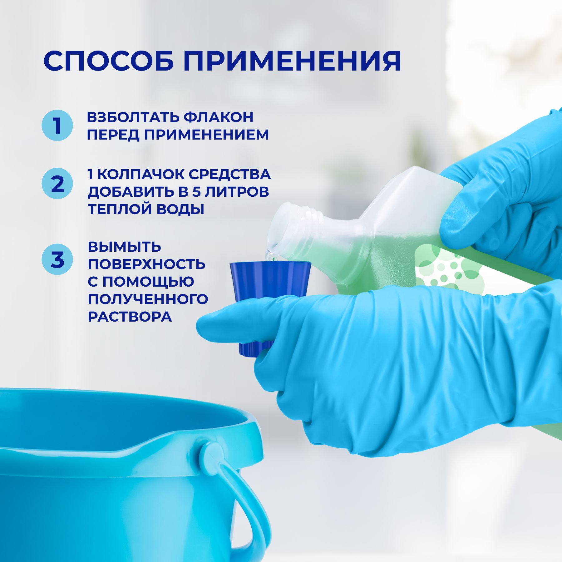 Перед применением взболтать флакон. Один колпачок средства добавить в 5 литров теплой воды. Полученным раствором провести влажную уборку.