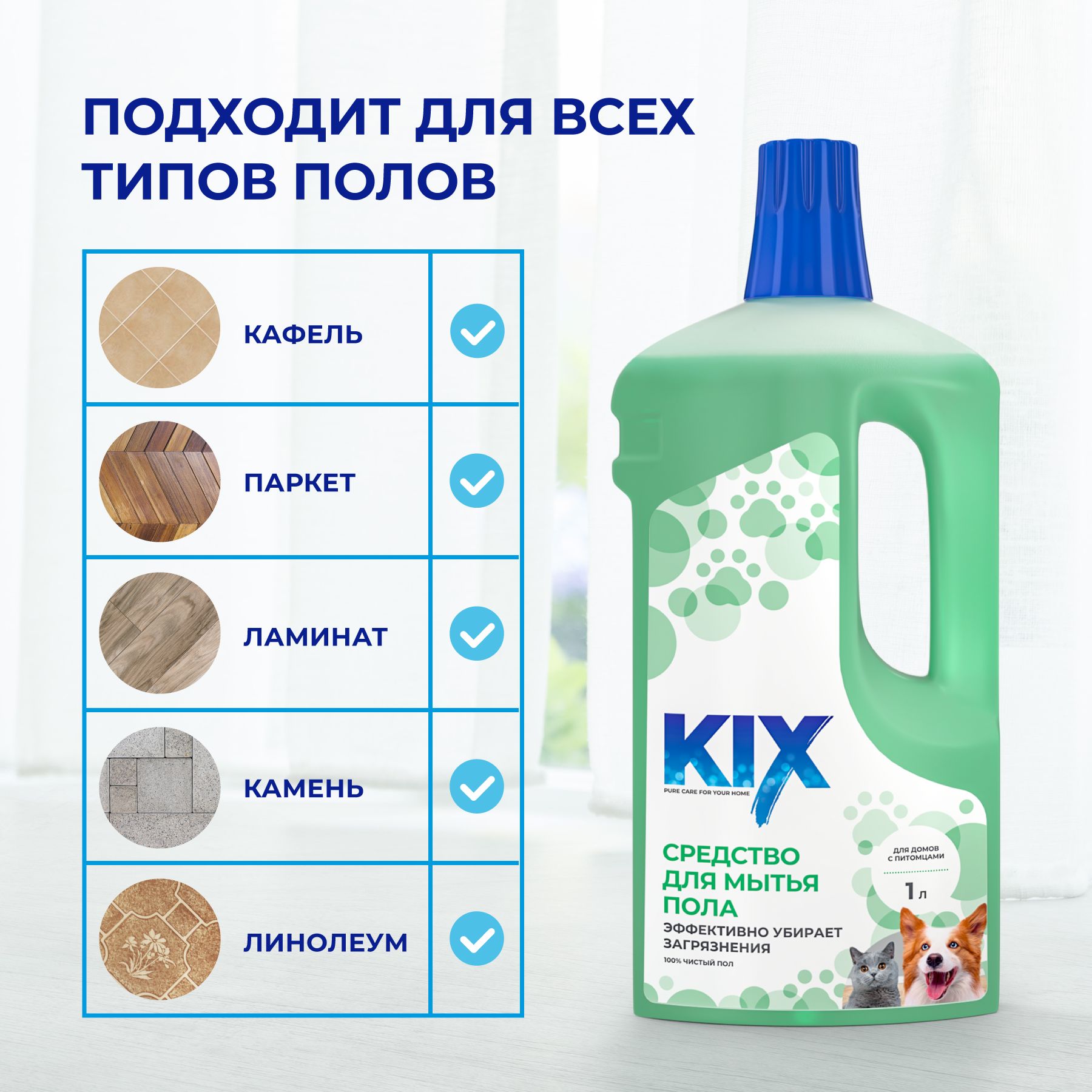 Средство для мытья полов KIX подходит для всех типов напольных покрытий.