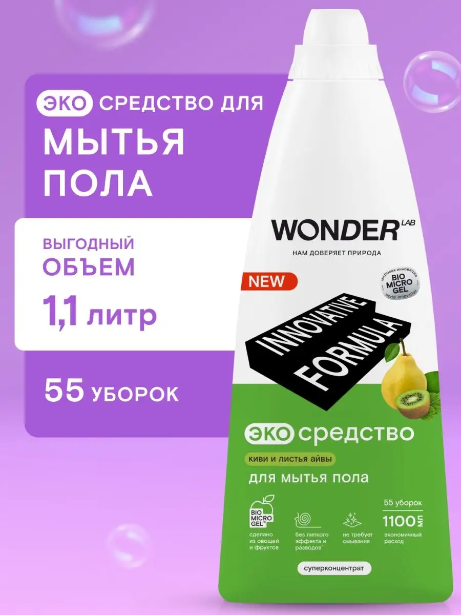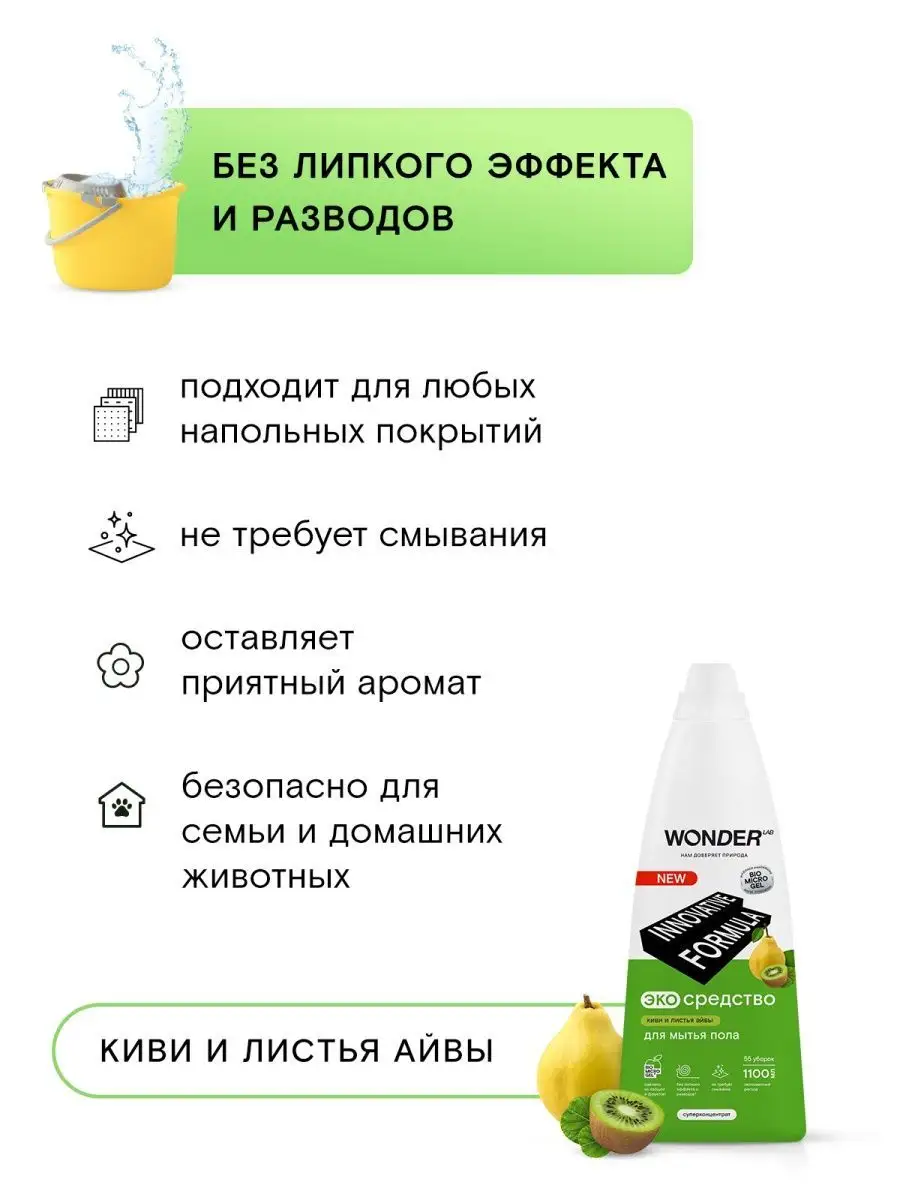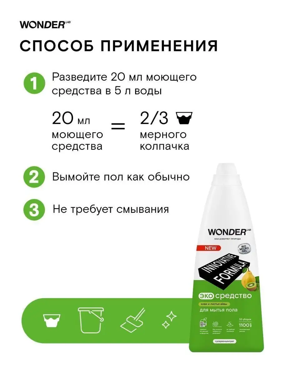 Описание: Средство для мытья пола WONDER LAB - 1100 мл. Эффективно удаляет загрязнения с любых напольных покрытий: линолеума, ламината, керамической плитки, мрамора, паркета, кафеля, керамогранита. Универсальное моющее средство для пола от пыли WonderLab с мягким ароматом Ириса и Голубики или Киви экономично расходуется благодаря инновационной формуле. Жидкости для мытья пола хватает на более 55 уборок. Оставляет легкий приятный аромат на поверхности. Гель для пола подходит для ежедневной влажной уборки. Концентрат не требует смывания, не оставляет плёнок и разводов. Моющая жидкость для пола снимает статическое электричество не оставляя "липкого" эффекта. Жидкость для мытья полов Wander Lab удаляет до 100% грязи от домашних питомцев, засохшие остатки пищи вокруг миски, мусор или брызги около лотка. Безопасно для семьи и домашних питомцев. Житкость подходит длямытья стен, очистки пластика, удаления пыли во всех комнатах в доме (детской, спальне, кухне, ванной, гостинной). Не поддерживаем тестирование на животных. Способ применения: разведите 20 мл моющего средства в 5 л воды (40 мл на ведро 10 литров) и вымойте пол как обычно. Чистящее средство для полов безопасно для септиков. Соедство антипыль идеально для ухода за полами из дерева и любых других материалов. Мы называем наши продукты экологичными, потому что основа Biomicrogel, который разлагается на 98 процентов за 24 часа. Средства мы делаем из овощей и фруктов. Эко средство без хлора, фосфатов и фосфонатов. Вы можете ознакомиться другими хозяйственными товарами и с каталогом бытовой химии для дома Wonder lab - нажав на логотип бренда справа.