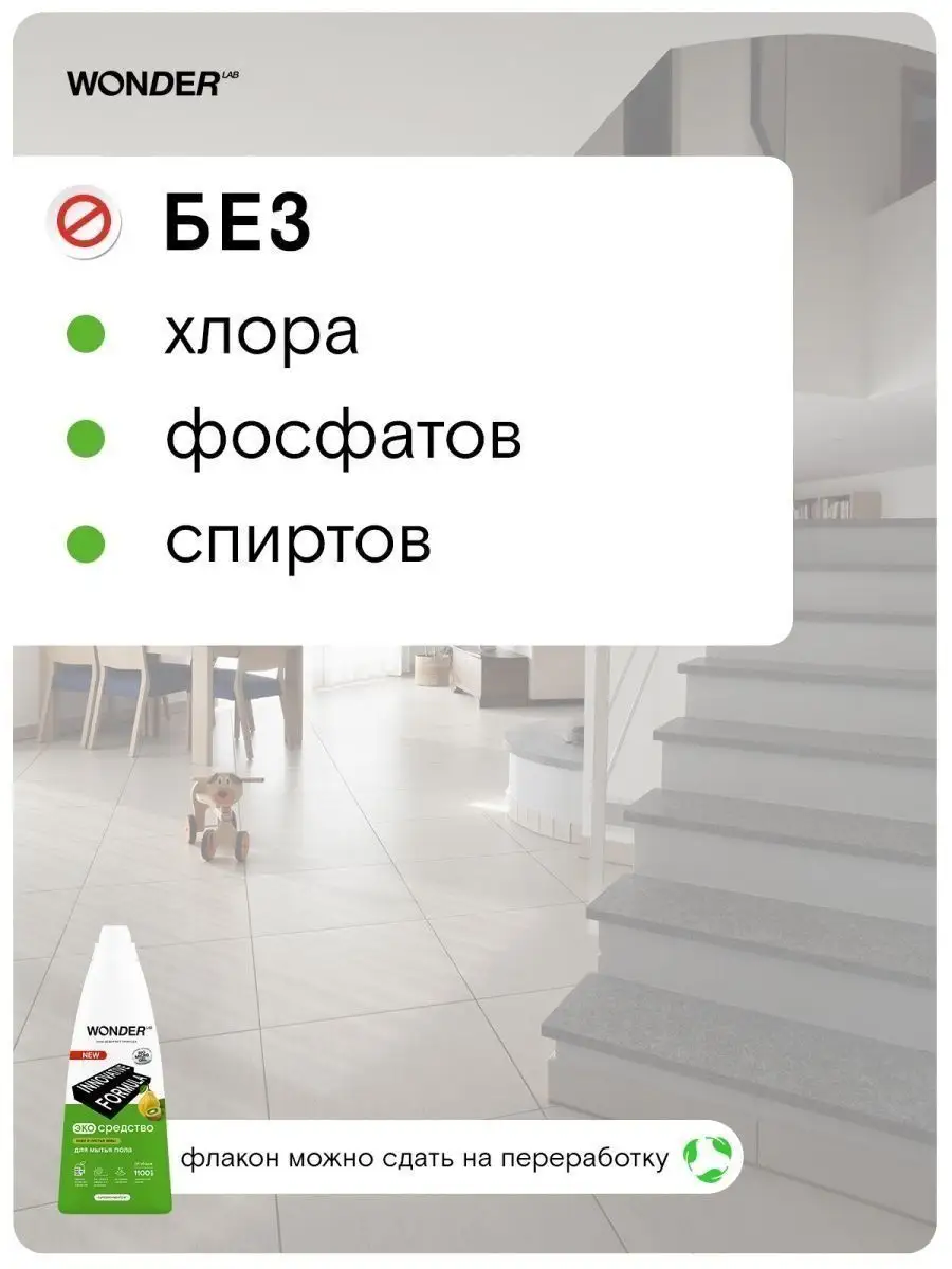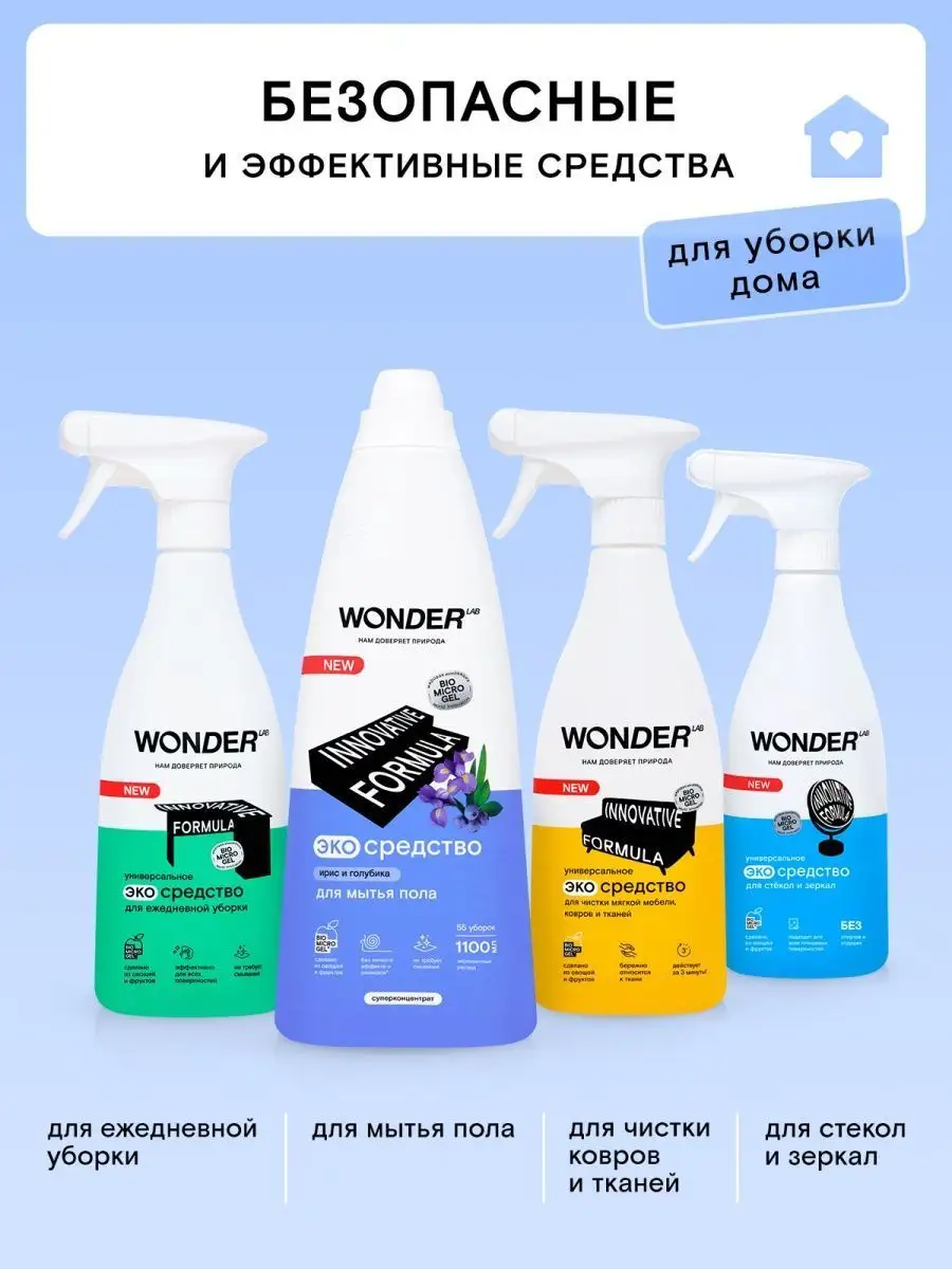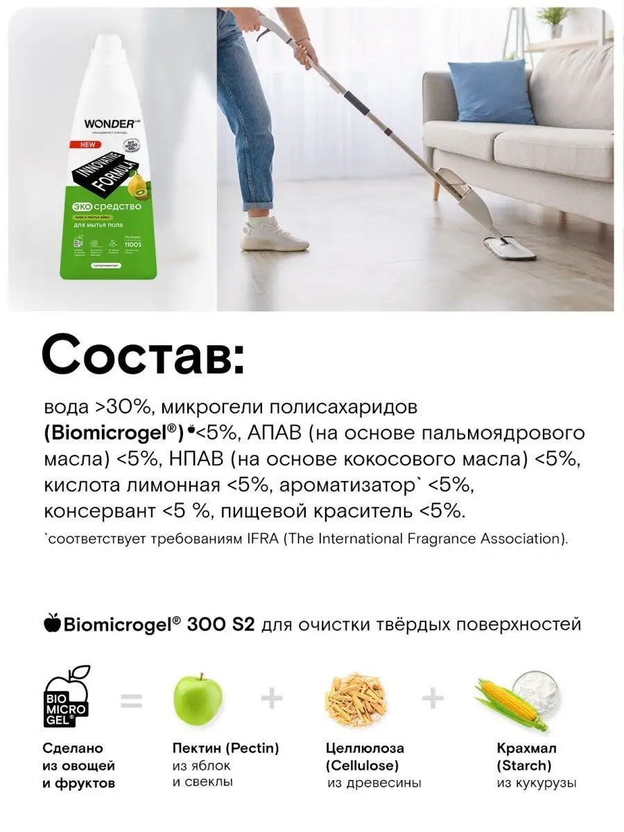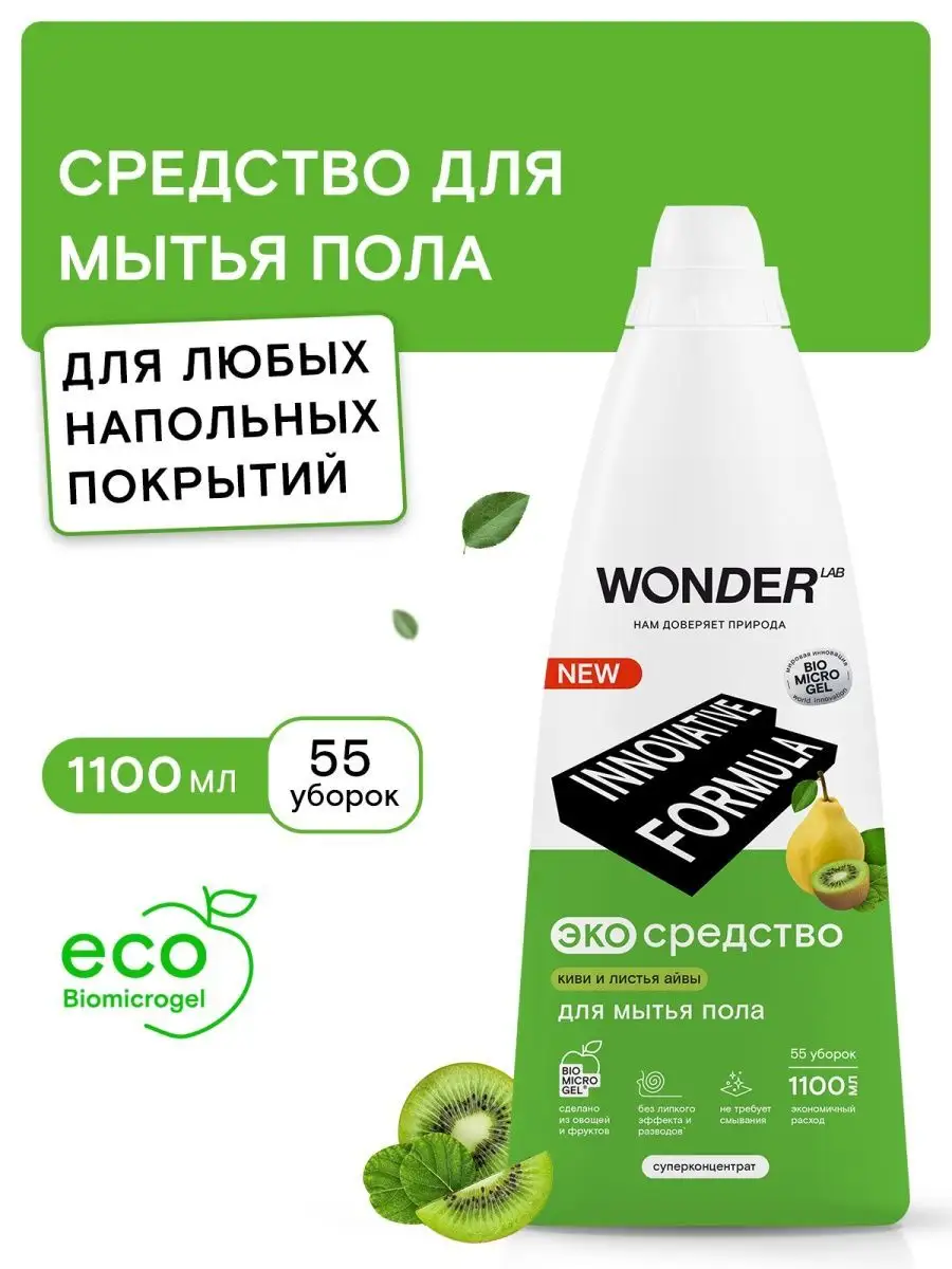 Описание: Средство для мытья пола WONDER LAB - 1100 мл. Эффективно удаляет загрязнения с любых напольных покрытий: линолеума, ламината, керамической плитки, мрамора, паркета, кафеля, керамогранита. Универсальное моющее средство для пола от пыли WonderLab с мягким ароматом Ириса и Голубики или Киви экономично расходуется благодаря инновационной формуле. Жидкости для мытья пола хватает на более 55 уборок. Оставляет легкий приятный аромат на поверхности. Гель для пола подходит для ежедневной влажной уборки. Концентрат не требует смывания, не оставляет плёнок и разводов. Моющая жидкость для пола снимает статическое электричество не оставляя "липкого" эффекта. Жидкость для мытья полов Wander Lab удаляет до 100% грязи от домашних питомцев, засохшие остатки пищи вокруг миски, мусор или брызги около лотка. Безопасно для семьи и домашних питомцев. Житкость подходит длямытья стен, очистки пластика, удаления пыли во всех комнатах в доме (детской, спальне, кухне, ванной, гостинной). Не поддерживаем тестирование на животных. Способ применения: разведите 20 мл моющего средства в 5 л воды (40 мл на ведро 10 литров) и вымойте пол как обычно. Чистящее средство для полов безопасно для септиков. Соедство антипыль идеально для ухода за полами из дерева и любых других материалов. Мы называем наши продукты экологичными, потому что основа Biomicrogel, который разлагается на 98 процентов за 24 часа. Средства мы делаем из овощей и фруктов. Эко средство без хлора, фосфатов и фосфонатов. Вы можете ознакомиться другими хозяйственными товарами и с каталогом бытовой химии для дома Wonder lab - нажав на логотип бренда справа.