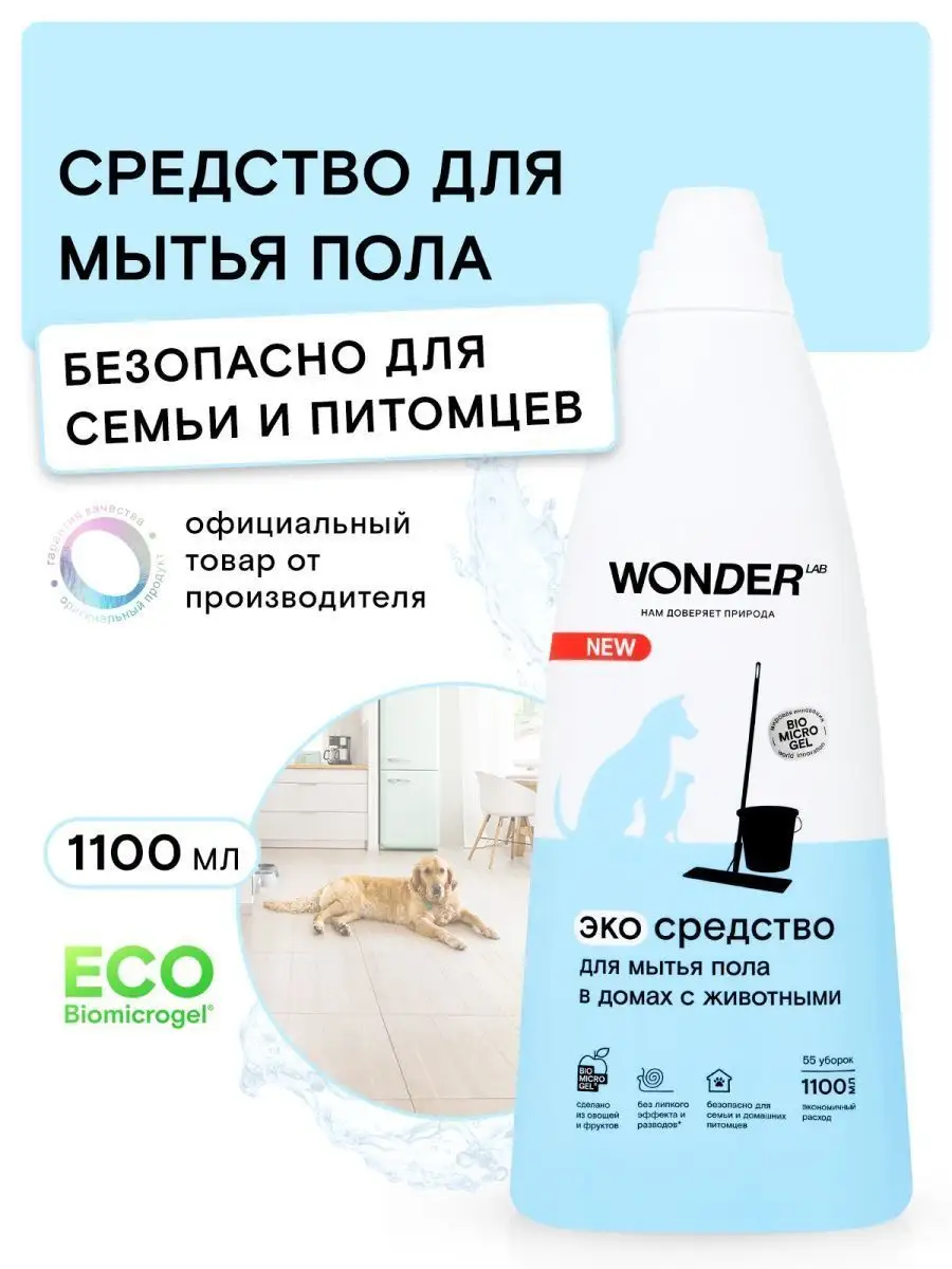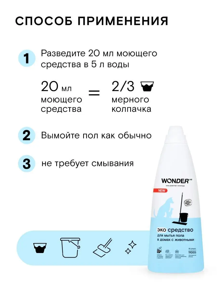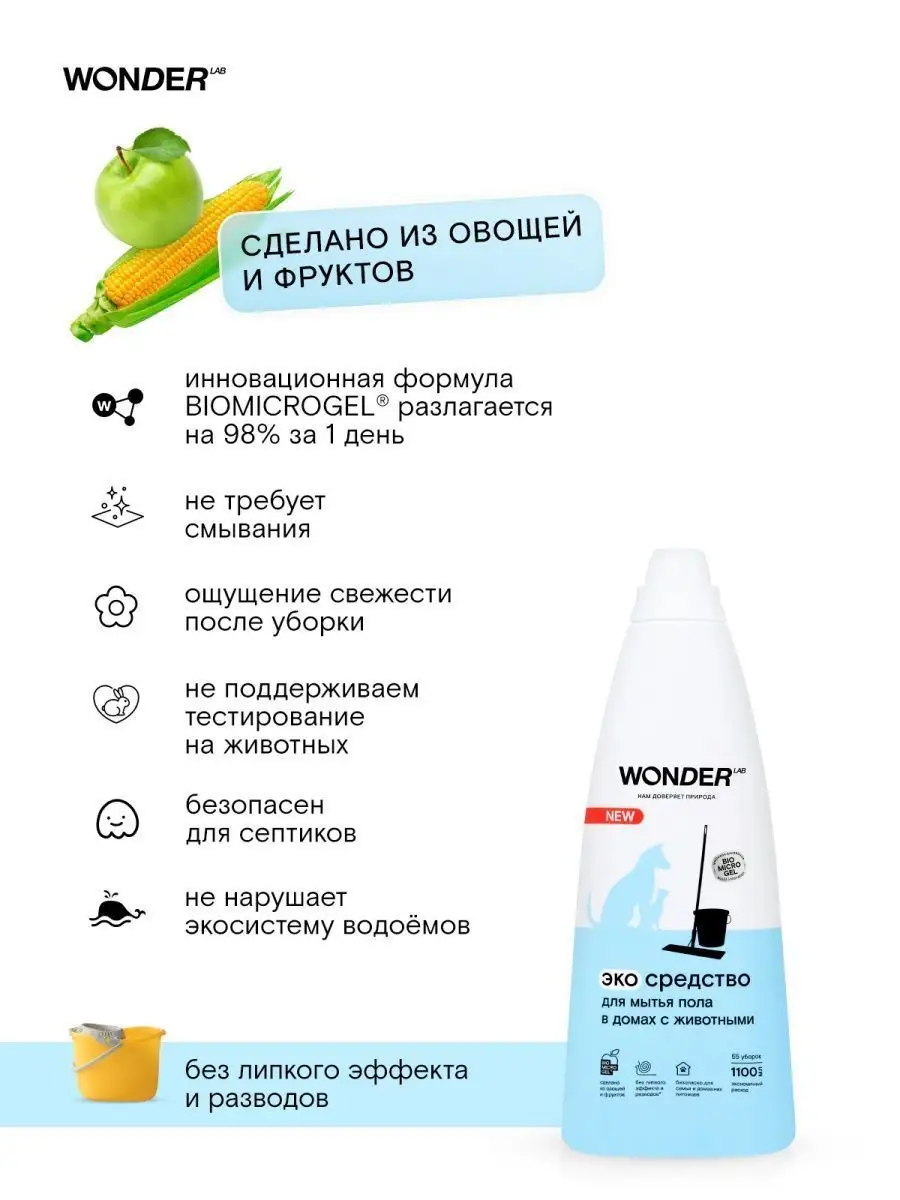 Описание: Средство для мытья пола WONDER LAB в домах с животными - 1100 мл. Эффективно удаляет загрязнения с любых напольных покрытий: линолеума, ламината, керамической плитки, мрамора, паркета, кафеля, керамогранита. Универсальное моющее средство для пола от пыли WonderLab с нейтральном ароматом не раздражает даже самых чувствительных животных, при этом, устраняет посторонние запахи. Экономично расходуется благодаря инновационной формуле Жидкости для мытья пола хватает на 55 уборок. Гель для пола подходит для ежедневной влажной уборки. Концентрат не требует смывания, не оставляет плёнок и разводов. Средство хорошо удаляет даже сильные загрязнения, шерсть, и имеет полностью безопасный состав. Вы можете не бояться, что питомец лизнет пол после уборки. Моющая жидкость для пола снимает статическое электричество не оставляя "липкого" эффекта. Жидкость для мытья полов Wander Lab удаляет до 100% грязи от домашних питомцев, засохшие остатки пищи вокруг миски, мусор или брызги около лотка. Безопасно для семьи и домашних питомцев. Житкость подходит длямытья стен, очистки пластика, удаления пыли во всех комнатах в доме (детской, спальне, кухне, ванной, гостинной). Не поддерживаем тестирование на животных. Способ применения: разведите 20 мл моющего средства в 5 л воды (40 мл на ведро 10 литров) и вымойте пол как обычно. Чистящее средство для полов безопасно для септиков. Соедство антипыль идеально для ухода за полами из дерева и любых других материалов. Мы называем наши продукты экологичными, потому что основа Biomicrogel, который разлагается на 98 процентов за 24 часа. Средства мы делаем из овощей и фруктов. Эко средство без хлора, фосфатов и фосфонатов. Вы можете ознакомиться другими хозяйственными товарами и с каталогом бытовой химии для дома Wonder lab - нажав на логотип бренда справа.