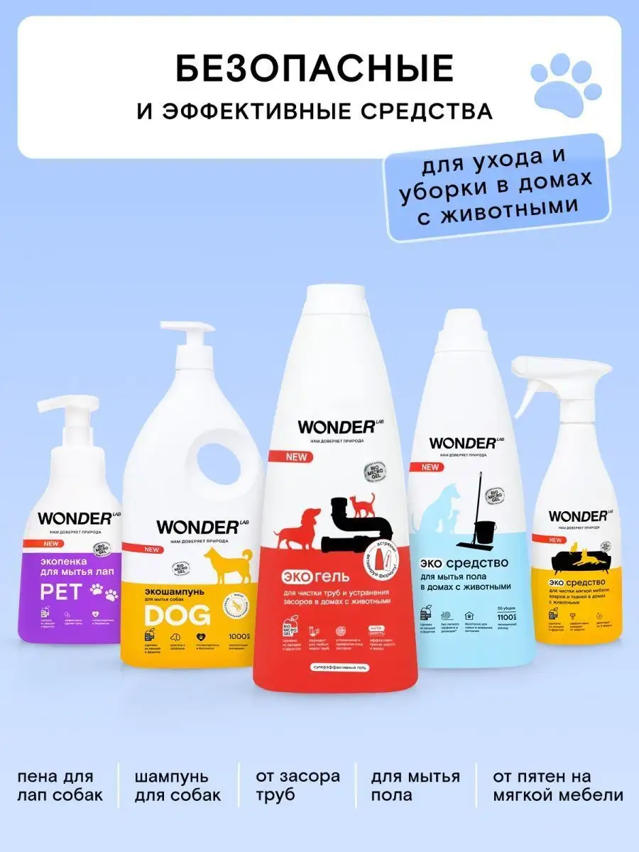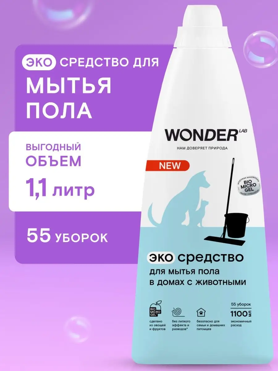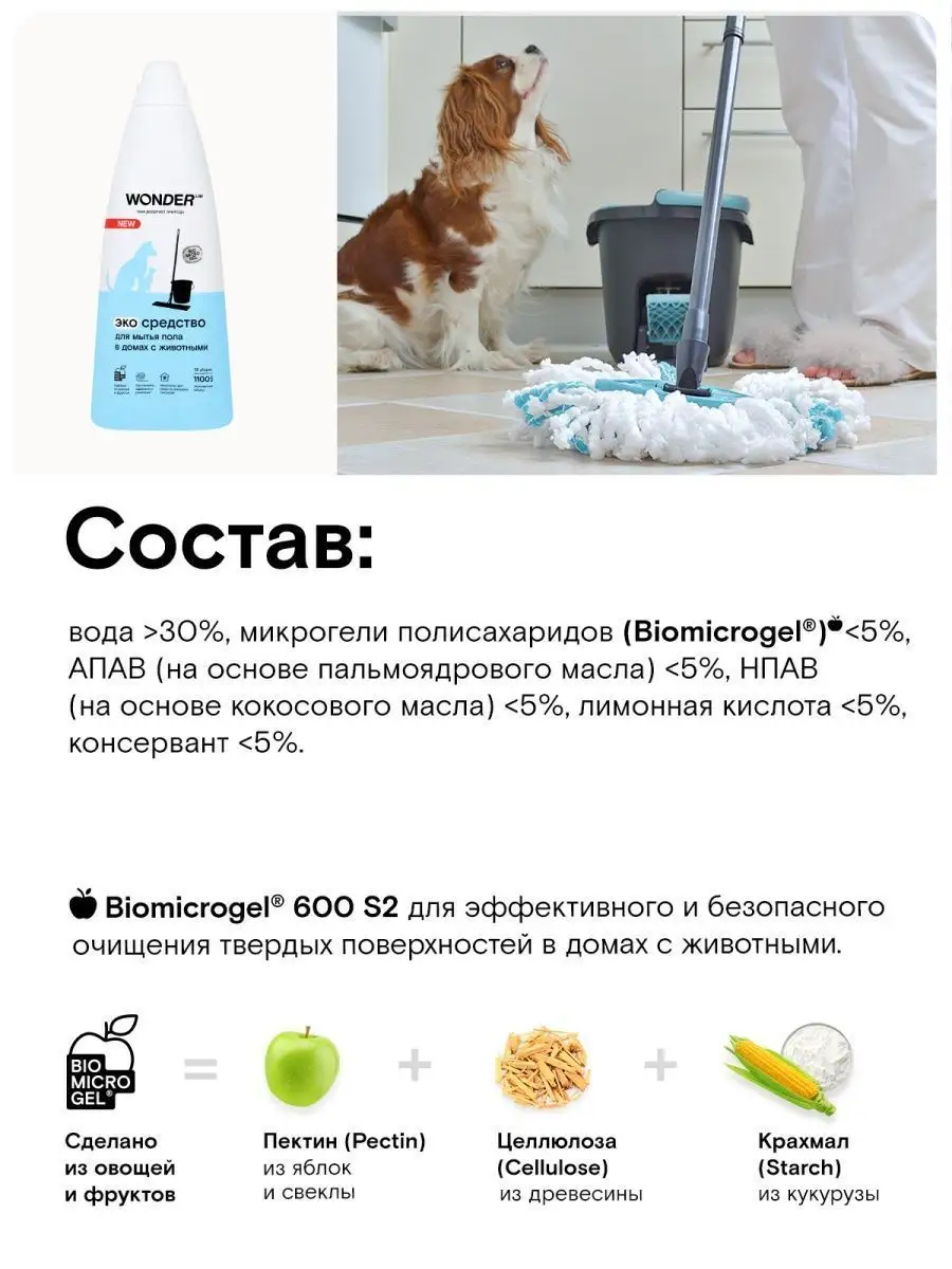 Описание: Средство для мытья пола WONDER LAB в домах с животными - 1100 мл. Эффективно удаляет загрязнения с любых напольных покрытий: линолеума, ламината, керамической плитки, мрамора, паркета, кафеля, керамогранита. Универсальное моющее средство для пола от пыли WonderLab с нейтральном ароматом не раздражает даже самых чувствительных животных, при этом, устраняет посторонние запахи. Экономично расходуется благодаря инновационной формуле Жидкости для мытья пола хватает на 55 уборок. Гель для пола подходит для ежедневной влажной уборки. Концентрат не требует смывания, не оставляет плёнок и разводов. Средство хорошо удаляет даже сильные загрязнения, шерсть, и имеет полностью безопасный состав. Вы можете не бояться, что питомец лизнет пол после уборки. Моющая жидкость для пола снимает статическое электричество не оставляя "липкого" эффекта. Жидкость для мытья полов Wander Lab удаляет до 100% грязи от домашних питомцев, засохшие остатки пищи вокруг миски, мусор или брызги около лотка. Безопасно для семьи и домашних питомцев. Житкость подходит длямытья стен, очистки пластика, удаления пыли во всех комнатах в доме (детской, спальне, кухне, ванной, гостинной). Не поддерживаем тестирование на животных. Способ применения: разведите 20 мл моющего средства в 5 л воды (40 мл на ведро 10 литров) и вымойте пол как обычно. Чистящее средство для полов безопасно для септиков. Соедство антипыль идеально для ухода за полами из дерева и любых других материалов. Мы называем наши продукты экологичными, потому что основа Biomicrogel, который разлагается на 98 процентов за 24 часа. Средства мы делаем из овощей и фруктов. Эко средство без хлора, фосфатов и фосфонатов. Вы можете ознакомиться другими хозяйственными товарами и с каталогом бытовой химии для дома Wonder lab - нажав на логотип бренда справа.