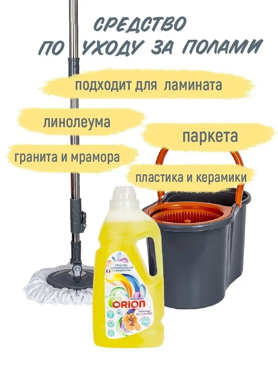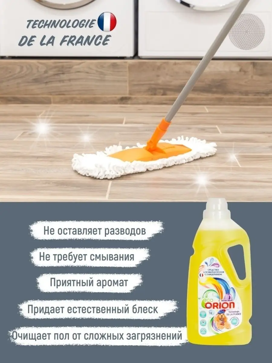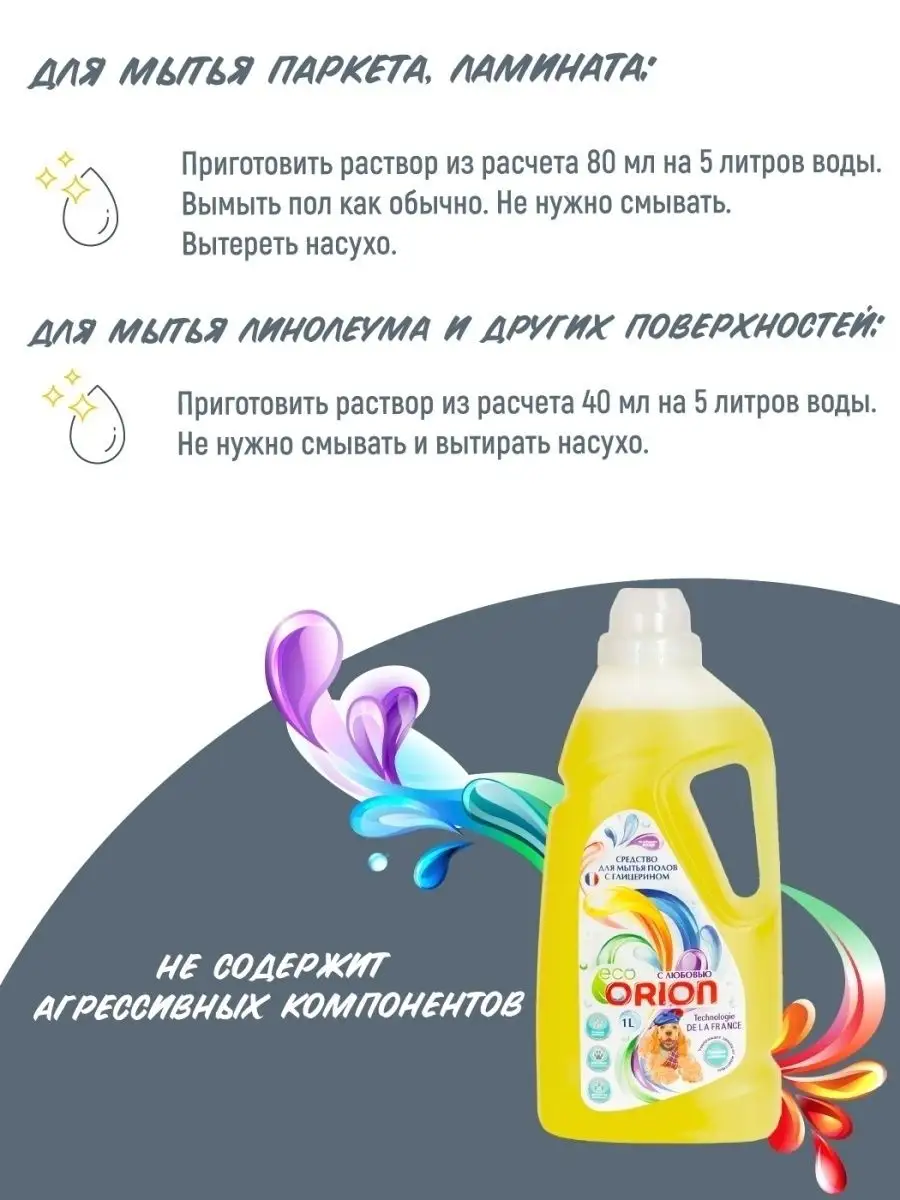 Описание: Универсальное средство по уходу за полами Orion 1 л с глицерином устраняет запахи от домашних животных, а также идеально подходит для уборки и мытья любых поверхностей: паркета ламината линолеума гранита и мрамора пластика и керамики. Специальная формула многофункционального средства, за счёт безопасного, экологичного состава и ненавязчивого аромата, прекрасно подходит для ежедневного использования. Моющее средство Orion легко очищает пол от загрязнений и придает естественный блеск. Оно легко очищает пол от загрязнений и придает естественный блеск, а благодаря глицерину в составе пыль не задерживается и не накапливается на поверхности пола. Средство устраняет неприятные запахи, в том числе от домашних животных. Оно обладает легким ароматом, который подарит радость и наполнит дом натуральной свежестью. Чистящие и моющие средства Orion экологичны, не содержат вредных компонентов, таких как фосфаты и хлорные отбеливатели. Оптимизированная смесь катионных и неионогенных ПАВ в составе оказывает щадящее воздействие на обрабатываемые предметы и кожу рук. Средство для уборки Orion безопасно для кожи пальцев и рук, поэтому подходит для людей, чувствительных к бытовой химии. Моющее средство легко смывается водой, не оставляя разводов, придает блеск и идеальную чистоту. Добавьте блеска и продлите молодость вашей посуде полу мебели окнам всему, что окружает и радует вас каждый день. Линейка косметики по уходу за домом разработана в Париже специалистами ведущих косметических компаний. Вы можете ознакомиться с ассортиментом бытовой химии Orion - нажав на логотип бренда. Заходите в наш магазин и добавляйте в Любимые бренды, чтобы не пропустить новинки и акции. СПОСОБ ПРИМЕНЕНИЯ: для мытья паркета, ламината: приготовить раствор из расчета 80 мл на 5 литров воды. Вымыть пол как обычно. Не нужно смывать. Вытереть насухо. Для мытья линолеума, пластика и других поверхностей: 40 мл на 5 литров воды. Не нужно смывать и вытирать насухо.