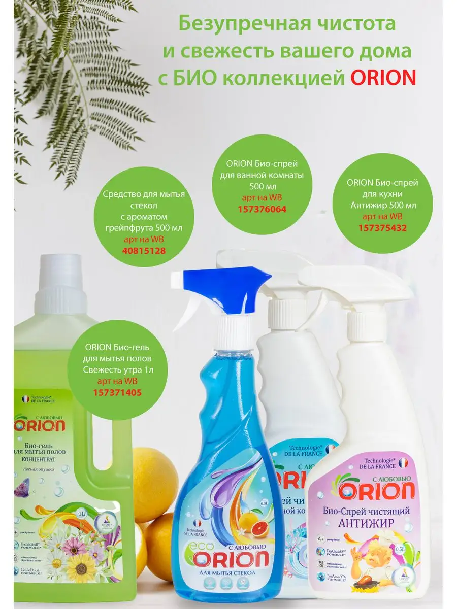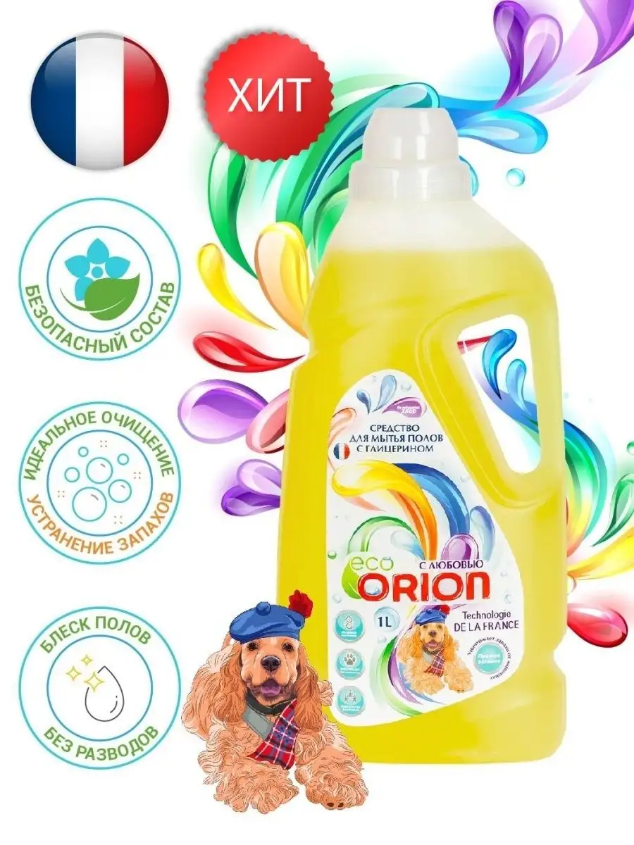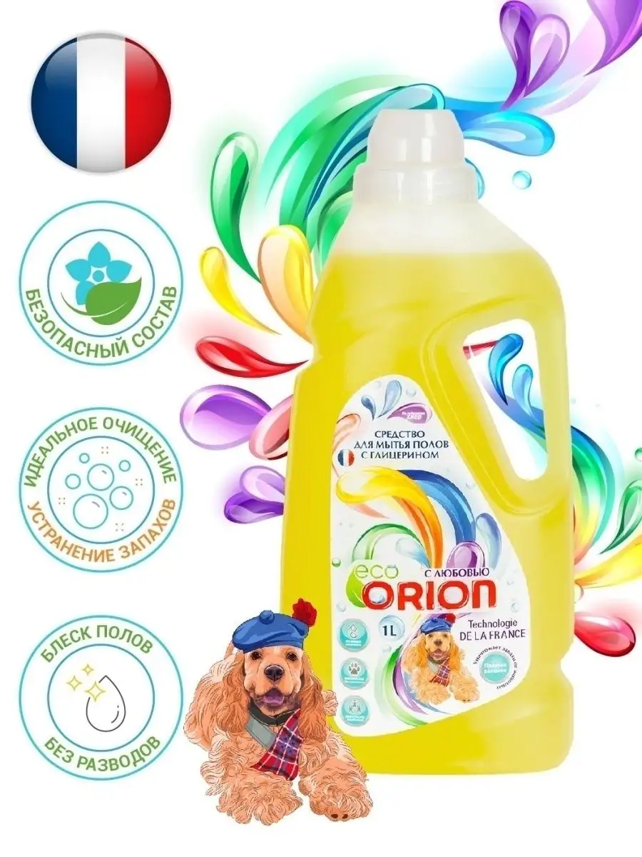 Описание: Универсальное средство по уходу за полами Orion 1 л с глицерином устраняет запахи от домашних животных, а также идеально подходит для уборки и мытья любых поверхностей: паркета ламината линолеума гранита и мрамора пластика и керамики. Специальная формула многофункционального средства, за счёт безопасного, экологичного состава и ненавязчивого аромата, прекрасно подходит для ежедневного использования. Моющее средство Orion легко очищает пол от загрязнений и придает естественный блеск. Оно легко очищает пол от загрязнений и придает естественный блеск, а благодаря глицерину в составе пыль не задерживается и не накапливается на поверхности пола. Средство устраняет неприятные запахи, в том числе от домашних животных. Оно обладает легким ароматом, который подарит радость и наполнит дом натуральной свежестью. Чистящие и моющие средства Orion экологичны, не содержат вредных компонентов, таких как фосфаты и хлорные отбеливатели. Оптимизированная смесь катионных и неионогенных ПАВ в составе оказывает щадящее воздействие на обрабатываемые предметы и кожу рук. Средство для уборки Orion безопасно для кожи пальцев и рук, поэтому подходит для людей, чувствительных к бытовой химии. Моющее средство легко смывается водой, не оставляя разводов, придает блеск и идеальную чистоту. Добавьте блеска и продлите молодость вашей посуде полу мебели окнам всему, что окружает и радует вас каждый день. Линейка косметики по уходу за домом разработана в Париже специалистами ведущих косметических компаний. Вы можете ознакомиться с ассортиментом бытовой химии Orion - нажав на логотип бренда. Заходите в наш магазин и добавляйте в Любимые бренды, чтобы не пропустить новинки и акции. СПОСОБ ПРИМЕНЕНИЯ: для мытья паркета, ламината: приготовить раствор из расчета 80 мл на 5 литров воды. Вымыть пол как обычно. Не нужно смывать. Вытереть насухо. Для мытья линолеума, пластика и других поверхностей: 40 мл на 5 литров воды. Не нужно смывать и вытирать насухо.