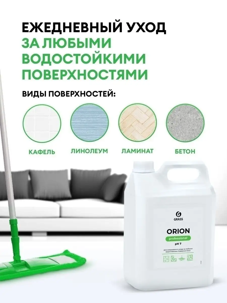 Описание: Универсальное низкопенное моющее средство Orion (Орион) GRASS (Грасс) 5 литров для ежедневного ухода за любыми моющимися поверхностями. Концентрированное моющее средство подходит для синтетических и виниловых покрытий, поверхностей из линолеума, дерева, паркета, ламината, асфальта, бетона, облицовочной плитки, стекла, гранита и мрамора. Средство для уборки чистки дома используется в бытовых и подсобных помещениях, на объектах социальной и общественной сферы, отелях, бизнес-центрах, гипермаркетах, коммунальном хозяйстве и дома. Благодаря умеренному пенообразованию универсальная жидкость для уборки может применяться не только для ручной мойки, но и в поломоечных машинах, моющих пылесосах. Не требует смывания, не оставляет разводов, не разрушает защитный слой поверхности. Не раздражает кожу рук. Способ применения: Концентрат разводят в пропорции 1:500 - 1:100 или 2-10 мл на 1 литр воды. Концентрация раствора зависит от характера загрязнения.