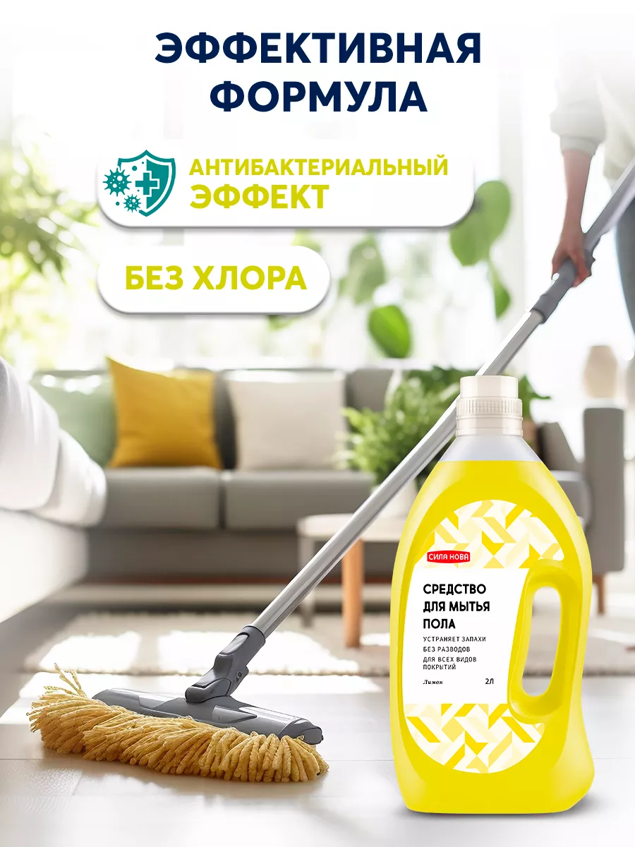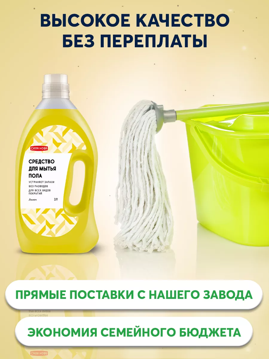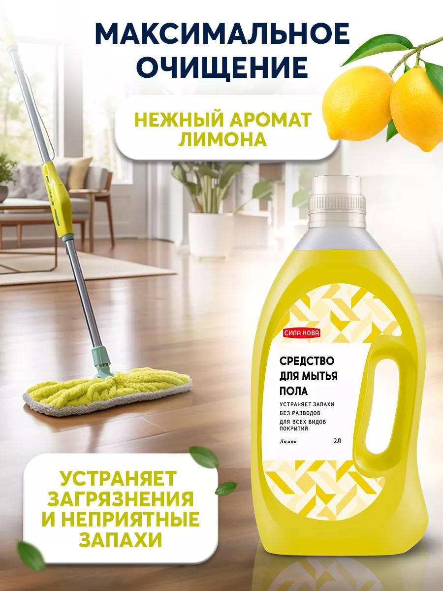 Описание: Средство для пола 2 литра с приятным цитрусовым ароматом подходит для мытья любых покрытий. Не оставляет разводов, не требует смывания. Обладает антибактериальным эффектом. Универсальное средство для мытья полов, стен, различных поверхностей из кафеля, пластика, дерева, линолеума, включая лакированное и окрашенное дерево. Хозяйственное средство для дома 2 литра с удобным колпачком-дозатором подходит для ежедневной и генеральной уборки пола и других поверхностей: стен, моющихся обоев, натяжного потолка, мебели, стекол. Товар бытовой химии нового поколения состоит из абсолютно безопасных компонентов и не содержит фосфатов, хлора, парабенов. Антибактериальное эко средство биоразлагаемо и не требует смывания водой, не оставляет разводов на поверхности после влажной уборки дома. Благодаря уникальным компонентам, входящим в состав, средство эффективнее убирает грязь и пыль в труднодоступных местах. Обладает эффектом антистатика, поверхность остаётся чистой в два раза дольше. Усиленная формула подходит для общественных организаций, офисов и предприятий и для домашней чистки ванн, душа, туалета. Профессиональное соедство безопасно для детей. Идеально подходит для детских комнат и домов с питомцами. Благодаря аромату лимона, во время уборки вы не только очистите поверхности, но и уберете неприятные запахи.