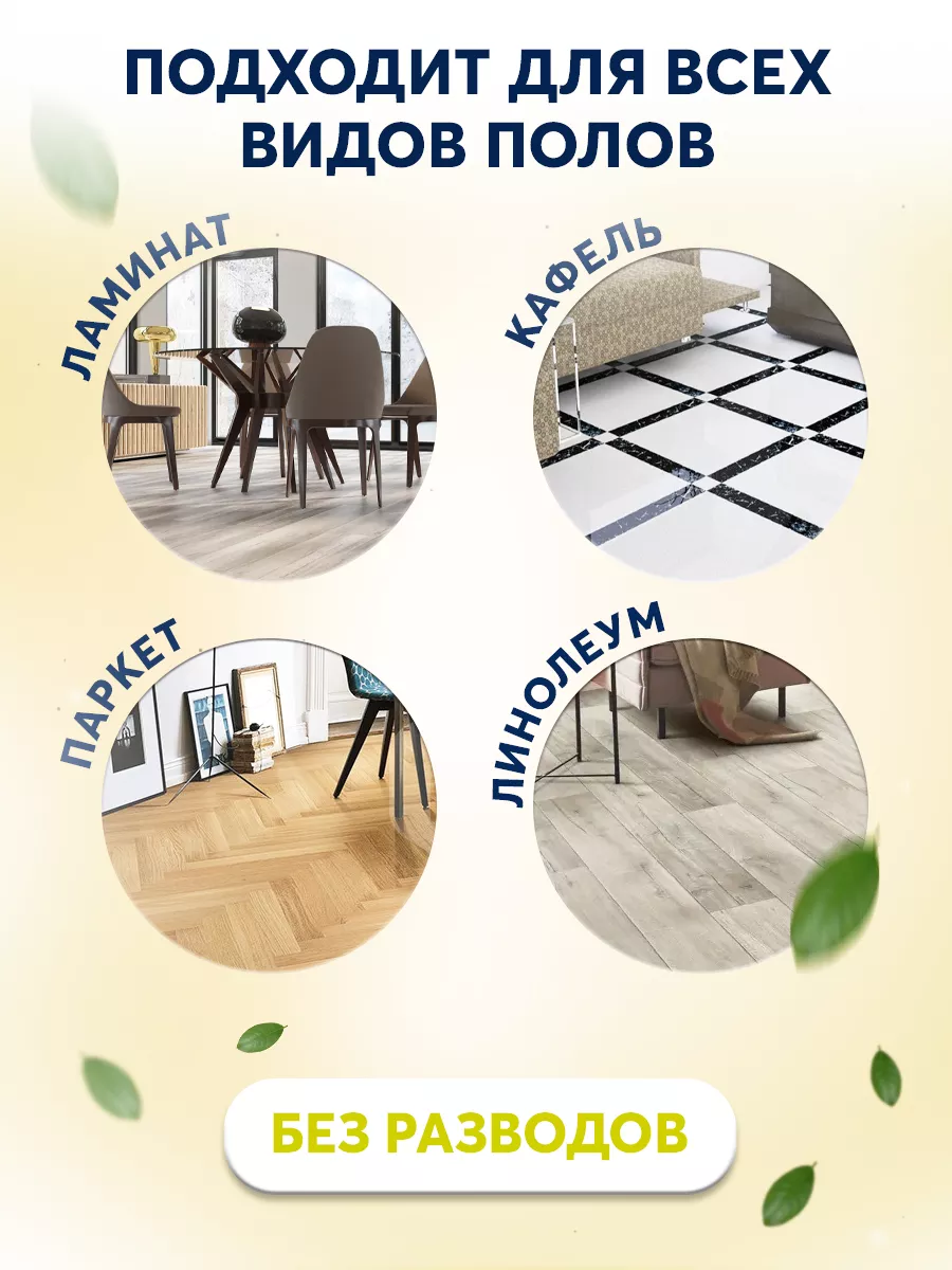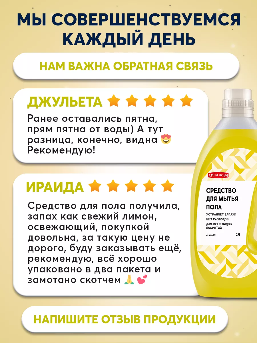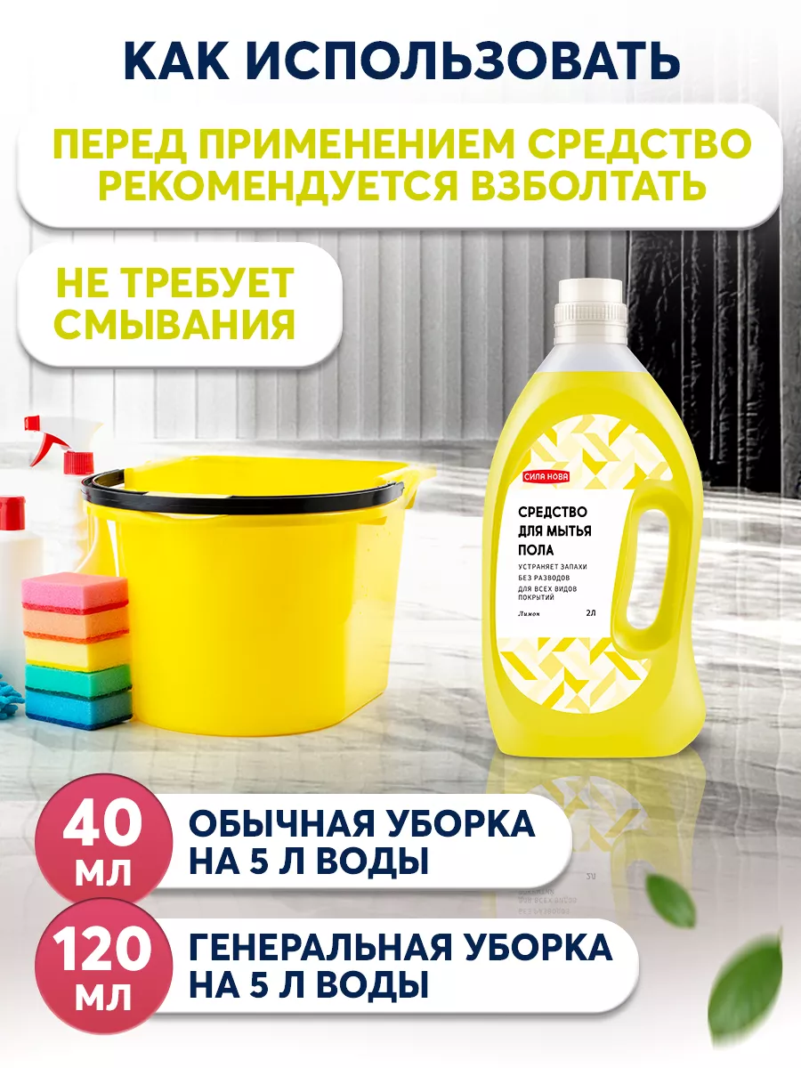 Описание: Средство для пола 2 литра с приятным цитрусовым ароматом подходит для мытья любых покрытий. Не оставляет разводов, не требует смывания. Обладает антибактериальным эффектом. Универсальное средство для мытья полов, стен, различных поверхностей из кафеля, пластика, дерева, линолеума, включая лакированное и окрашенное дерево. Хозяйственное средство для дома 2 литра с удобным колпачком-дозатором подходит для ежедневной и генеральной уборки пола и других поверхностей: стен, моющихся обоев, натяжного потолка, мебели, стекол. Товар бытовой химии нового поколения состоит из абсолютно безопасных компонентов и не содержит фосфатов, хлора, парабенов. Антибактериальное эко средство биоразлагаемо и не требует смывания водой, не оставляет разводов на поверхности после влажной уборки дома. Благодаря уникальным компонентам, входящим в состав, средство эффективнее убирает грязь и пыль в труднодоступных местах. Обладает эффектом антистатика, поверхность остаётся чистой в два раза дольше. Усиленная формула подходит для общественных организаций, офисов и предприятий и для домашней чистки ванн, душа, туалета. Профессиональное соедство безопасно для детей. Идеально подходит для детских комнат и домов с питомцами. Благодаря аромату лимона, во время уборки вы не только очистите поверхности, но и уберете неприятные запахи.