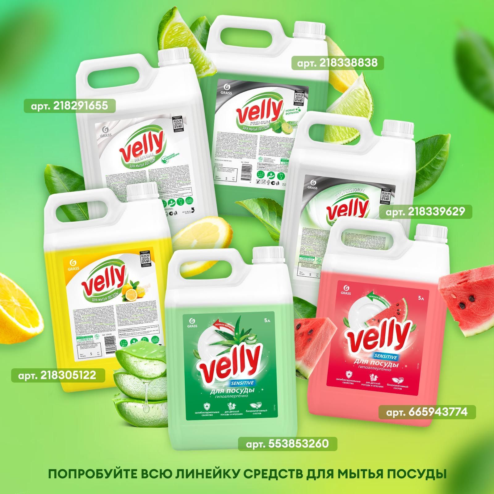 Попробуйте всю нашу линейку моющих средств для посуды Велли от компании Грасс c различными ароматами: алоэ вера, зеленое яблоко, арбуз, лимон, лайм + мята, нейтральный бальзам с глицерином для чувствительной кожи рук. Бытовая химия - незаменимый помощник в доме у любой хозяйки.Текстовое описание изображения
