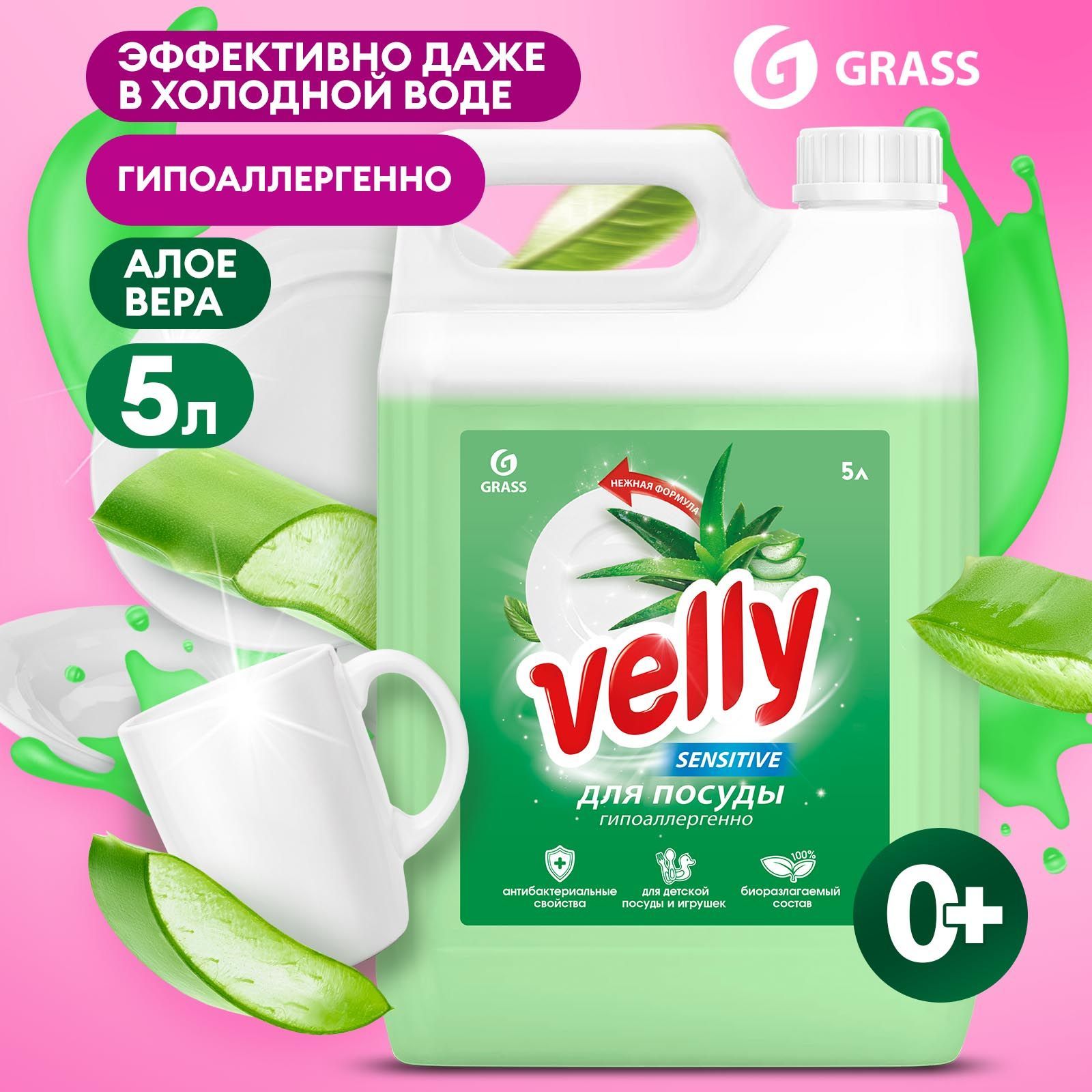 Средство для мытья посуды GRASS Velly с ароматом АЛОЭ 5л, антибактериальное, гипоаллергенное, моющее средство / гель для мытья посуды