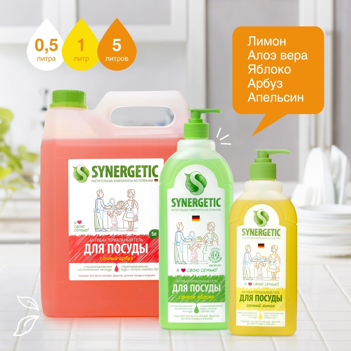 Описание: Биоразлагаемый концентрированный гель для посуды с антибактериальным эффектом SYNERGETIC - это экологичное, безопасное и эффективное средство для мытья всех видов посуды, в том числе детской, кухонного инвентаря и детских игрушек от любых видов загрязнений. Он полностью смывается водой и не оставляет следов на посуде. Мягкие биоразлагаемые тензиды из растительного масла обеспечивают хорошее пенообразование и эффективно удаляют жир и запахи даже в холодной воде. Растительный глицерин в составе средства защищает кожу рук от сухости и раздражения. Гипоаллергенная парфюмерная композиция с эфирными маслами герани, петитгрейна, сантала и бергамота придает средству свежий и приятный аромат. Гипоаллергенный гель дерматологически протестирован в Европе. Международный экологический сертификат ICEA подтверждает биоразлагаемость, безопасность и эффективность средства. Биоразлагаемые компоненты не вредят микрофлоре септических установок. Попадая в среду септика, средство «понятно» для микроорганизмов и без труда распадается на простые соединения.