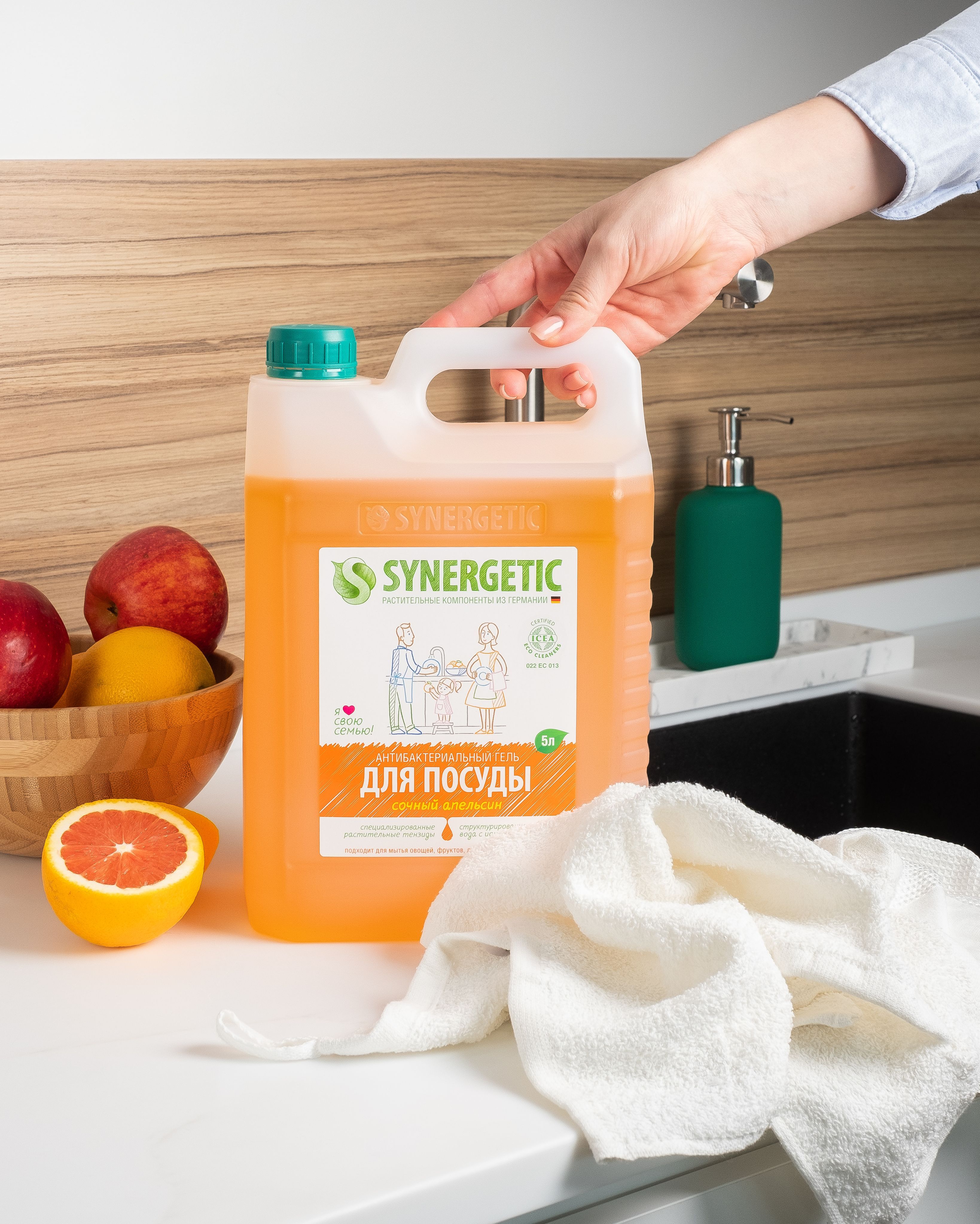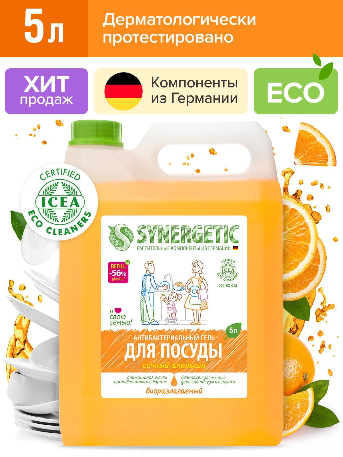 Концентрированный антибактериальный гель для посуды SYNERGETIC – это экологичное, безопасное и эффективное средство для мытья посуды, фруктов и овощей. Гель полностью смывается водой и подходит для мытья детской посуды, сосок, бутылочек и игрушек. Устраняет жир и запахи с посуды даже в холодной воде благодаря синергетическому сочетанию компонентов. Мягкие биоразлагаемые тензиды, полученные из растительного масла, удаляют органические загрязнения с посуды и обеспечивают хорошее пенообразование, не вызывая раздражения кожи рук. Гель для посуды содержит гипоаллергенные отдушки на основе эфирных масел и безопасные пищевые красители, поэтому подходит даже для людей с чувствительной кожей рук. Натуральный растительный глицерин в составе геля защищает кожу рук от сухости и раздражения и обеспечивает антисептический эффект, благодаря антибактериальной активности. Аппликационные тесты, проведенные международным агентством ICEA, подтверждают отсутствие раздражающего эффекта на кожу человека.