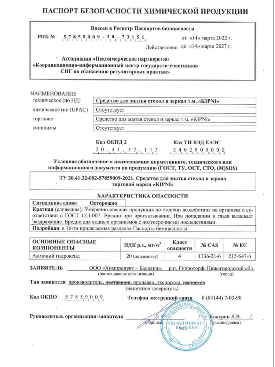 Состав Вода деионизированная, Нашатырный спирт, Глицерин, Неионогенный ПАВ