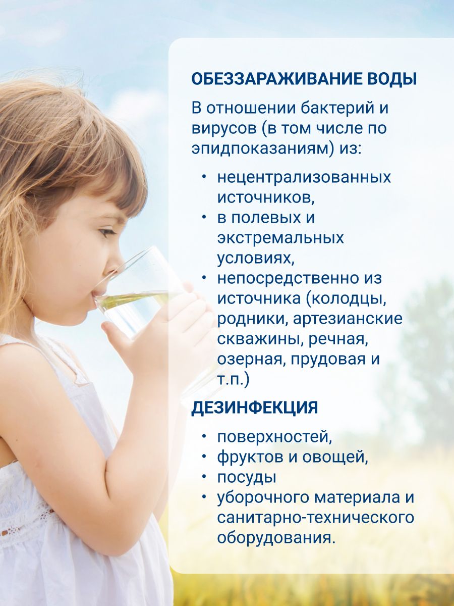 Описание: Множество вариантов применения:- Дезинфекция питьевой воды из рек, озер, прудов и т.д.;